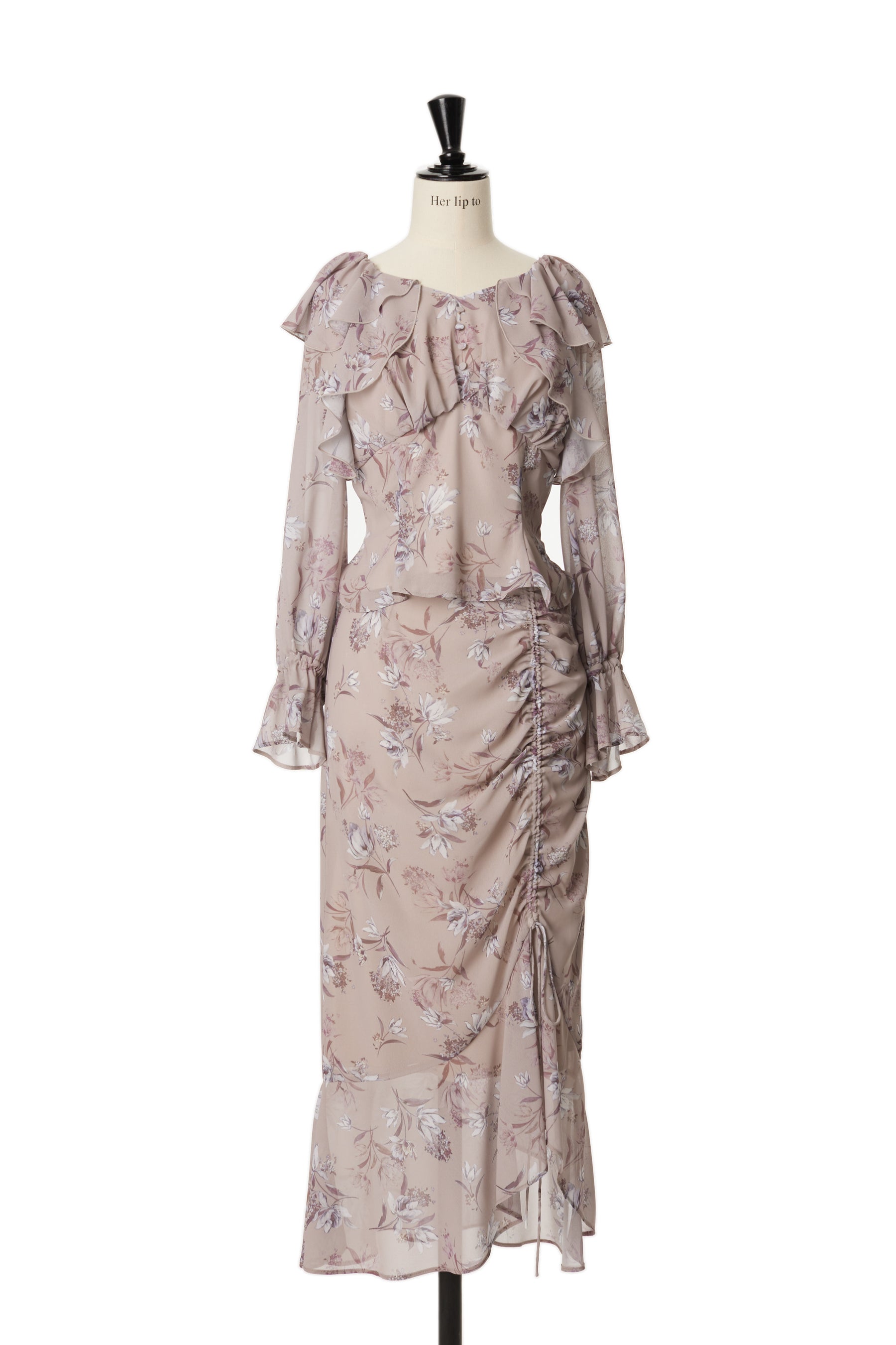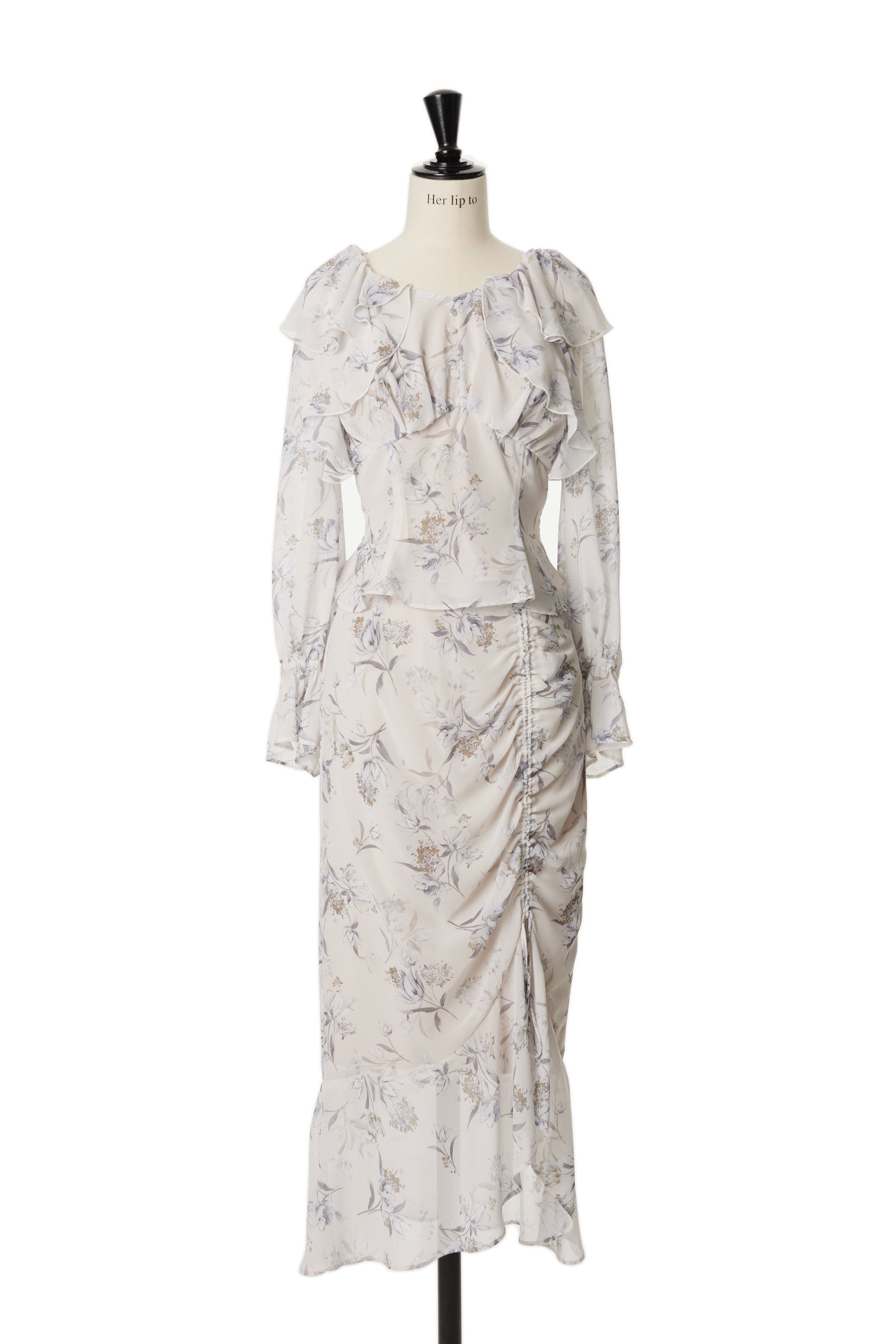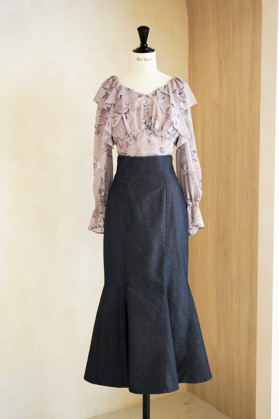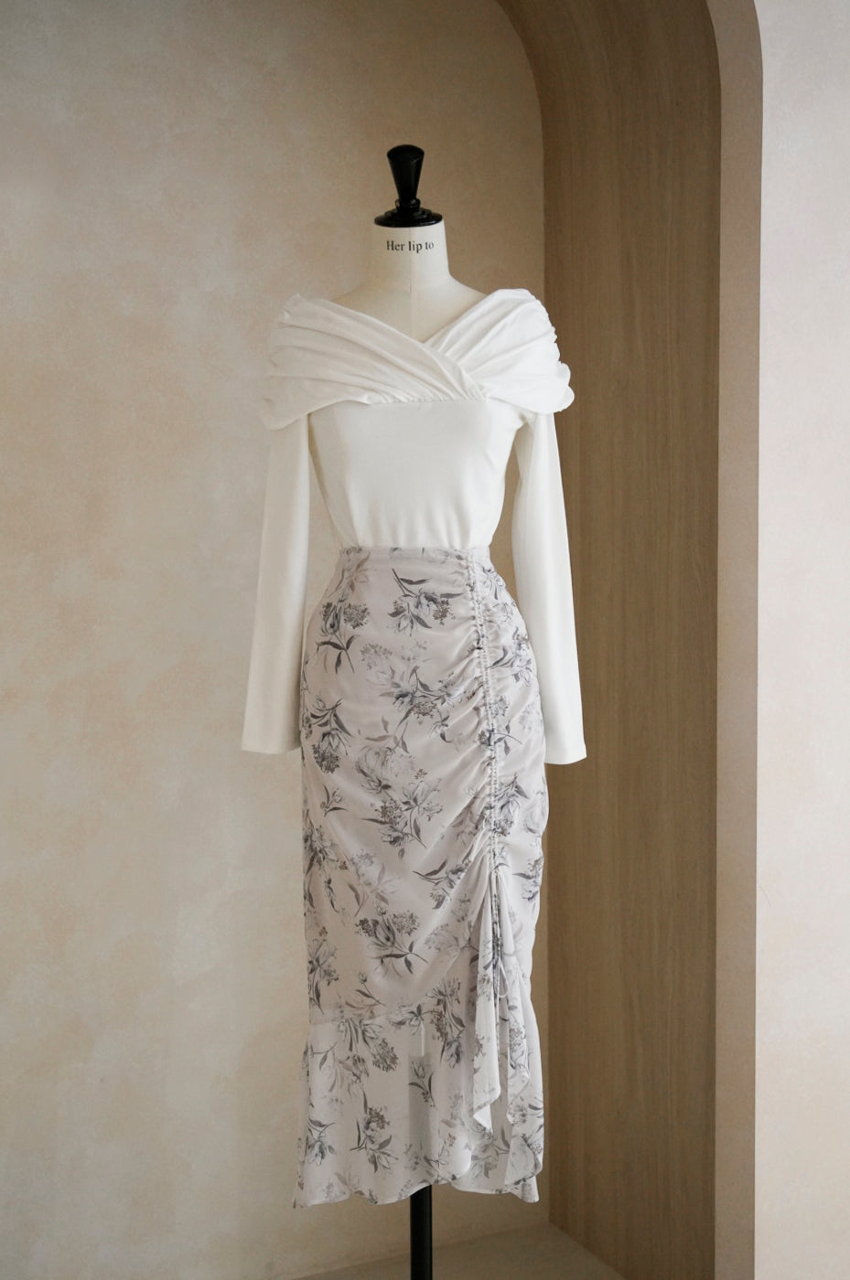 エアリー感のあるマーメイドスカートは、サイドのドロストで少し膨らみのあるディティールを作り出し、緩やかなヘムで仕上げています。
