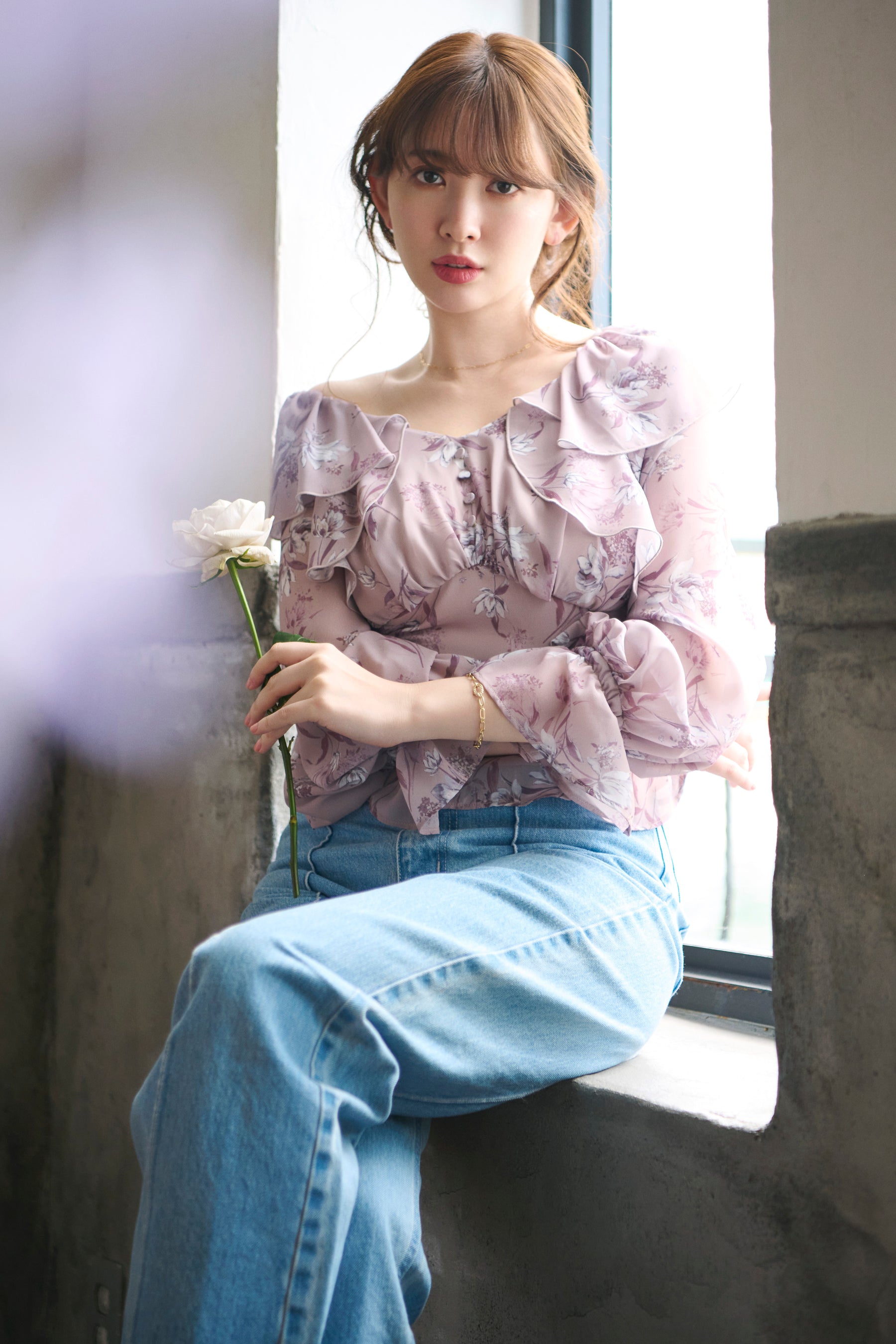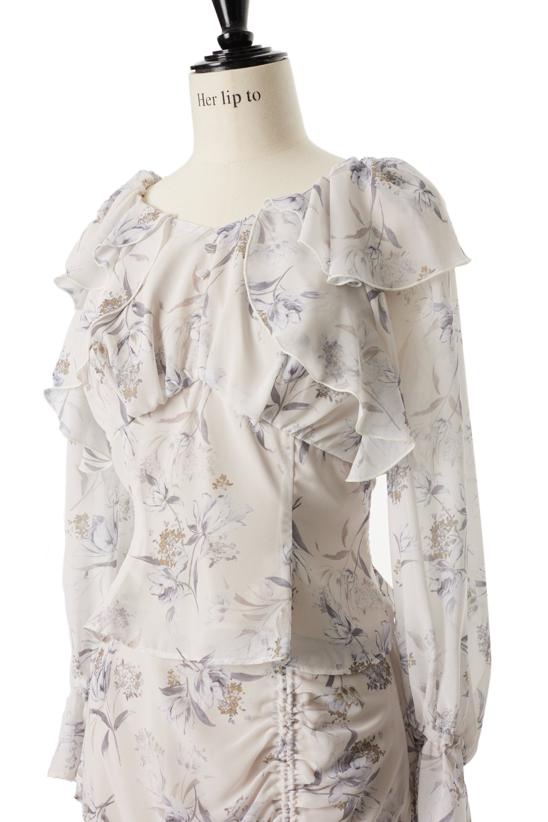 大きく揺れる胸元のフリルが特徴的で優美な動きが出るよう立体的なパターンにもこだわりました。