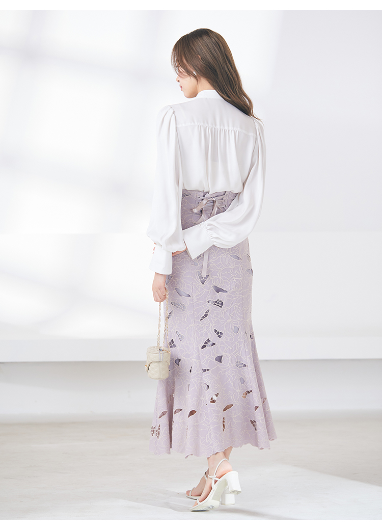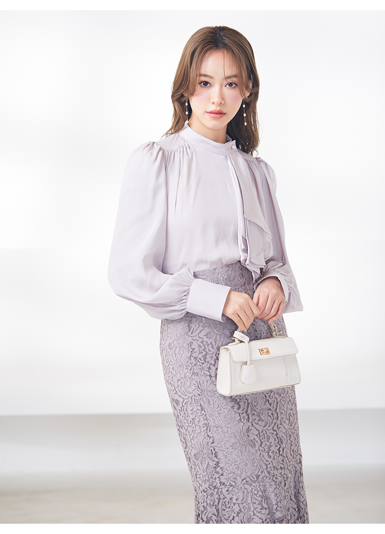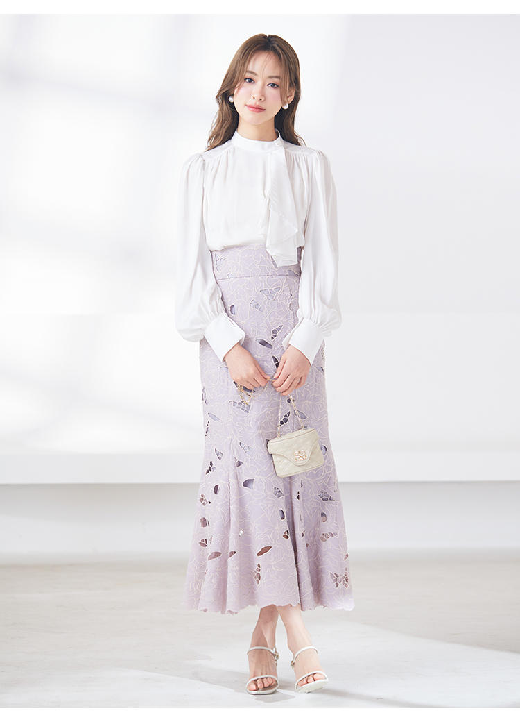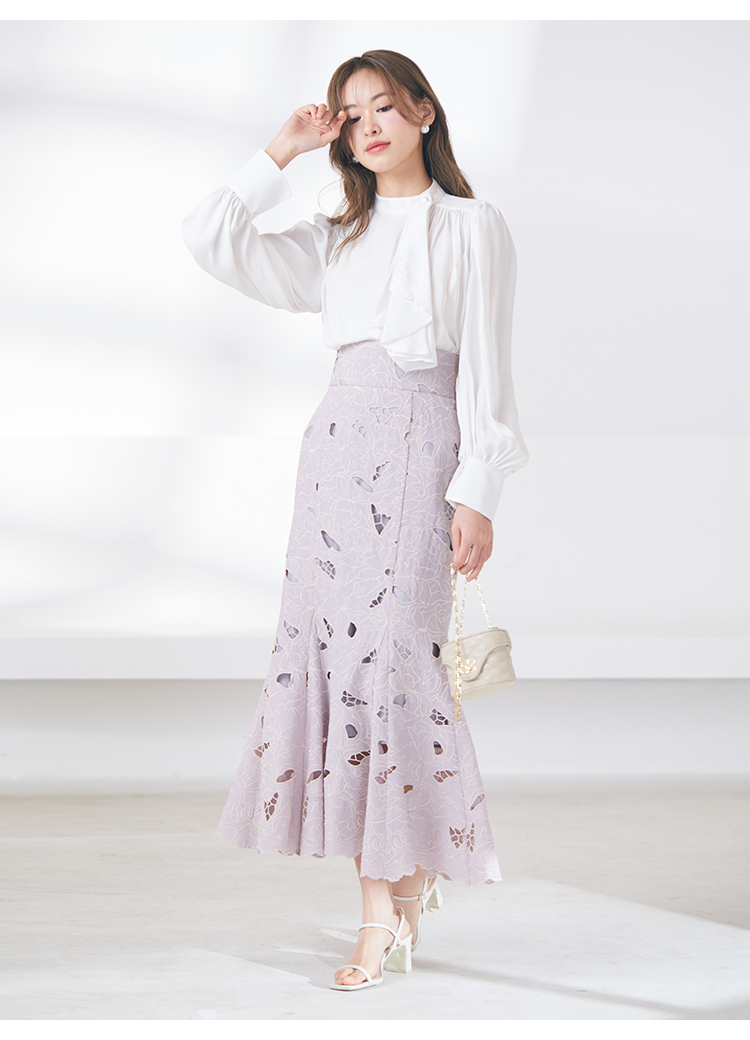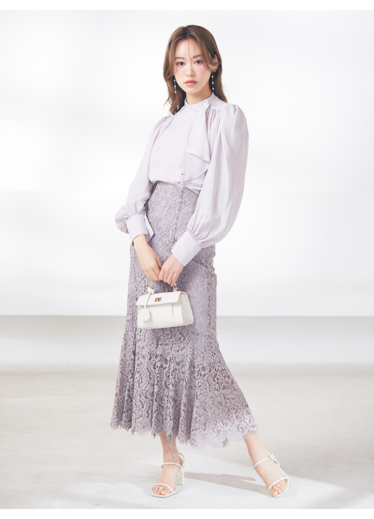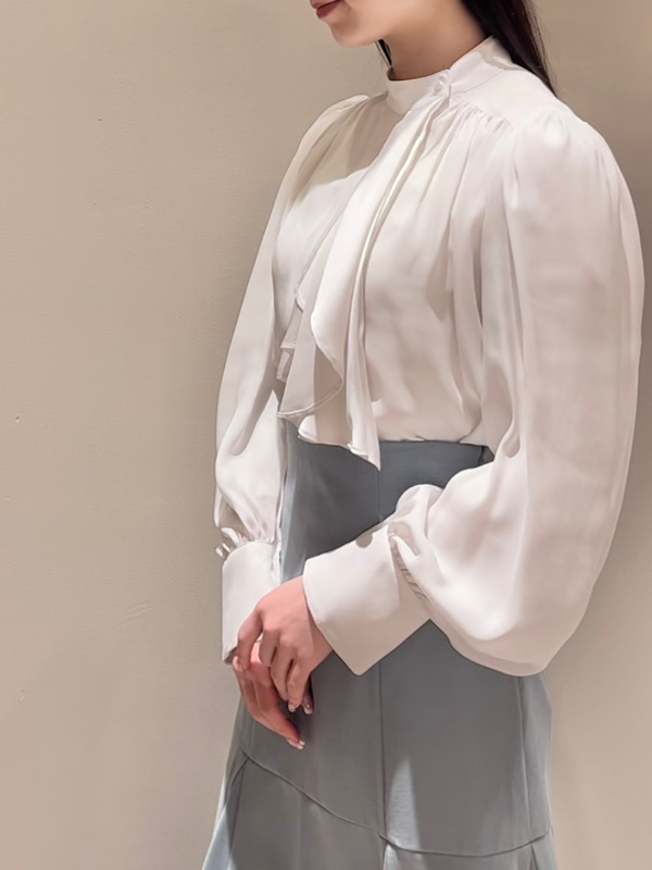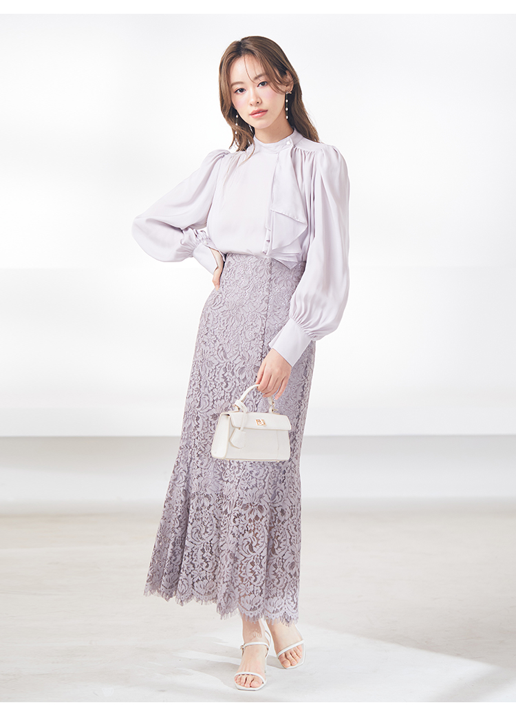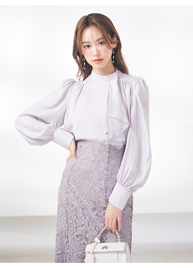 クラシカルなボウタイ&パールボタンがポイントになった、清楚な印象を与えるブラウス。品の良い仕上がりでデイリーからオフィスシーンまで幅広く合わせやすく、着まわし力の高い万能な1着です。袖の内側にはスリットを入れさり気ない肌見せを演出。バリエロングスカート(SWFS231168)やレーススカート(SWFS231203)とカラーを合わせてセットアップのようにコーディネートするのもおすすめです。