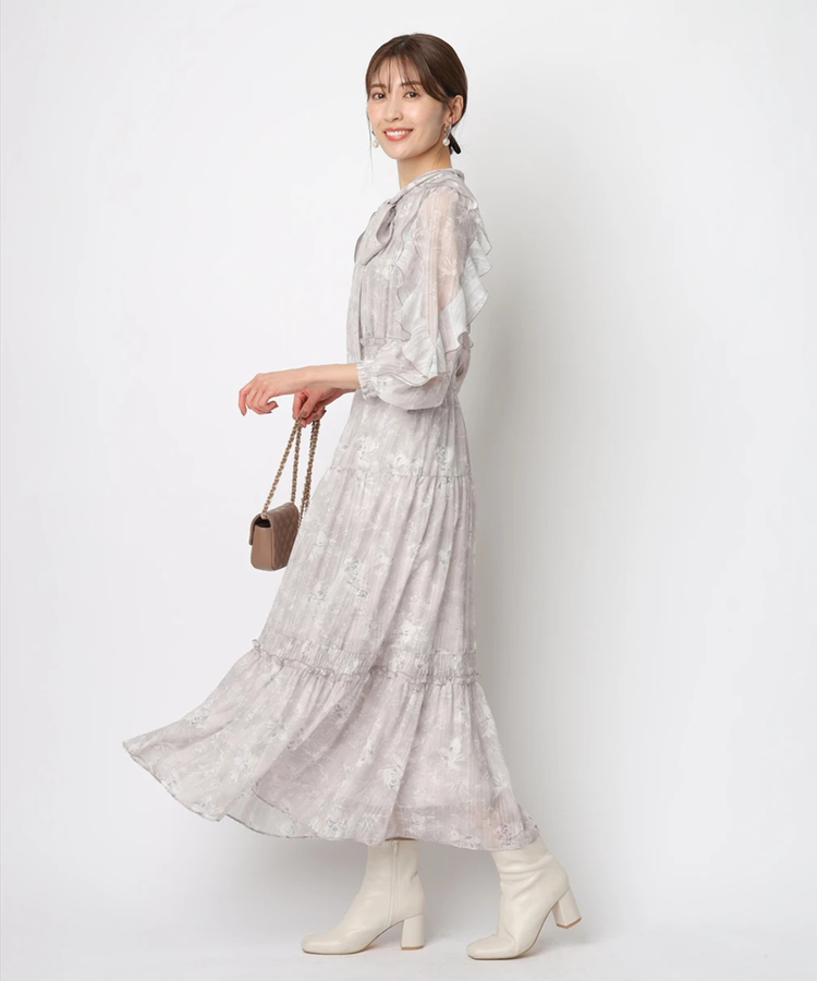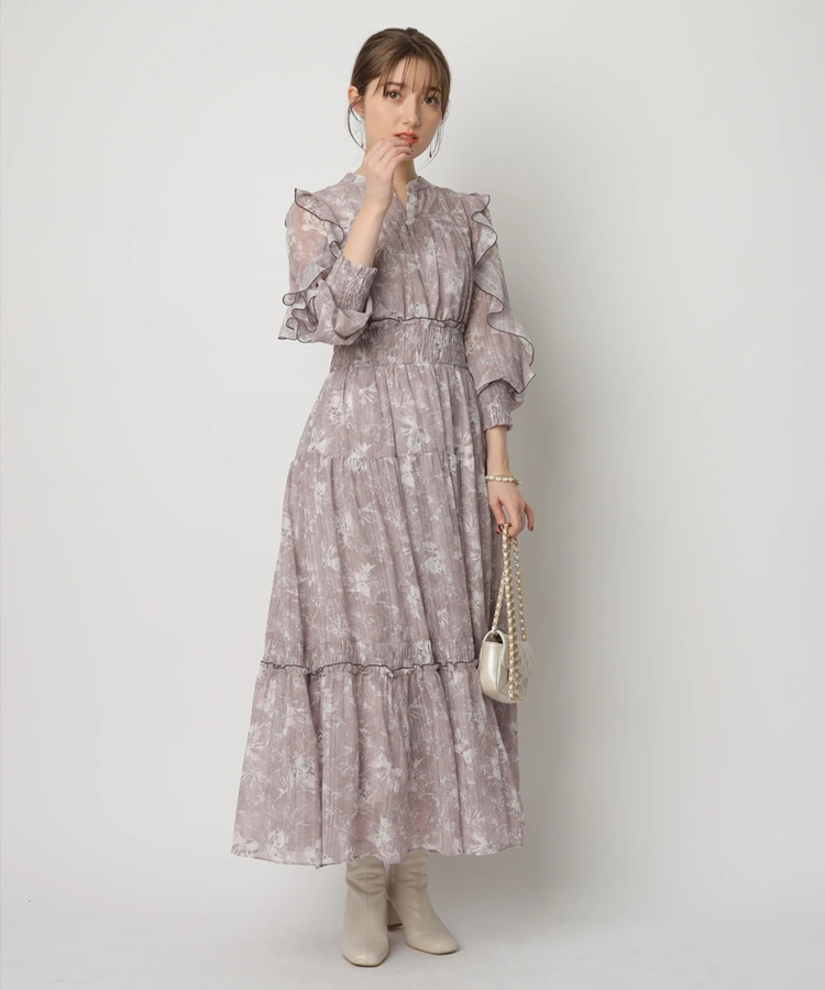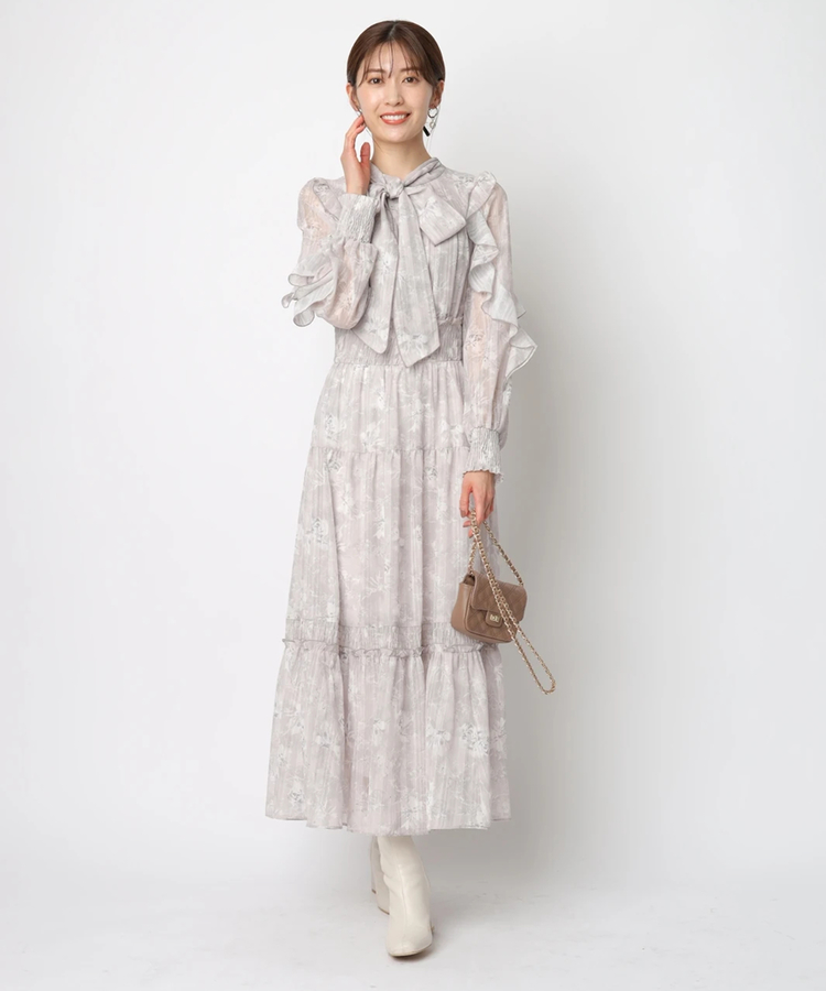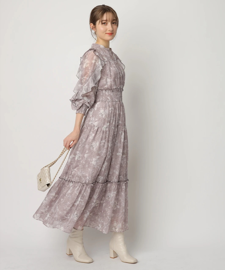 落ち着いたトーンのフラワープリントで、フェミニンさ薫るデザインに仕上げたワンピース。