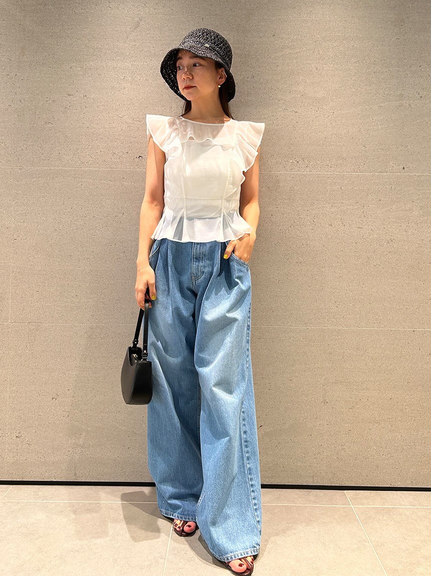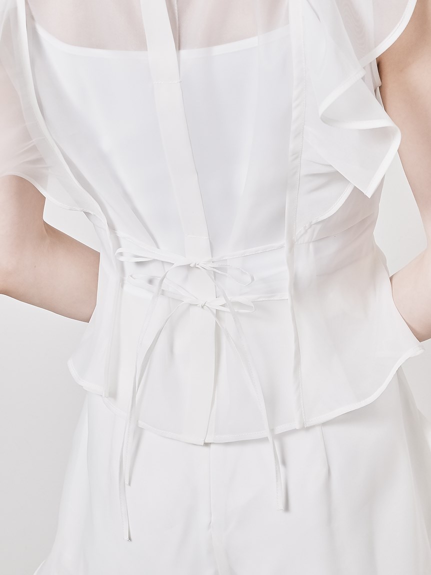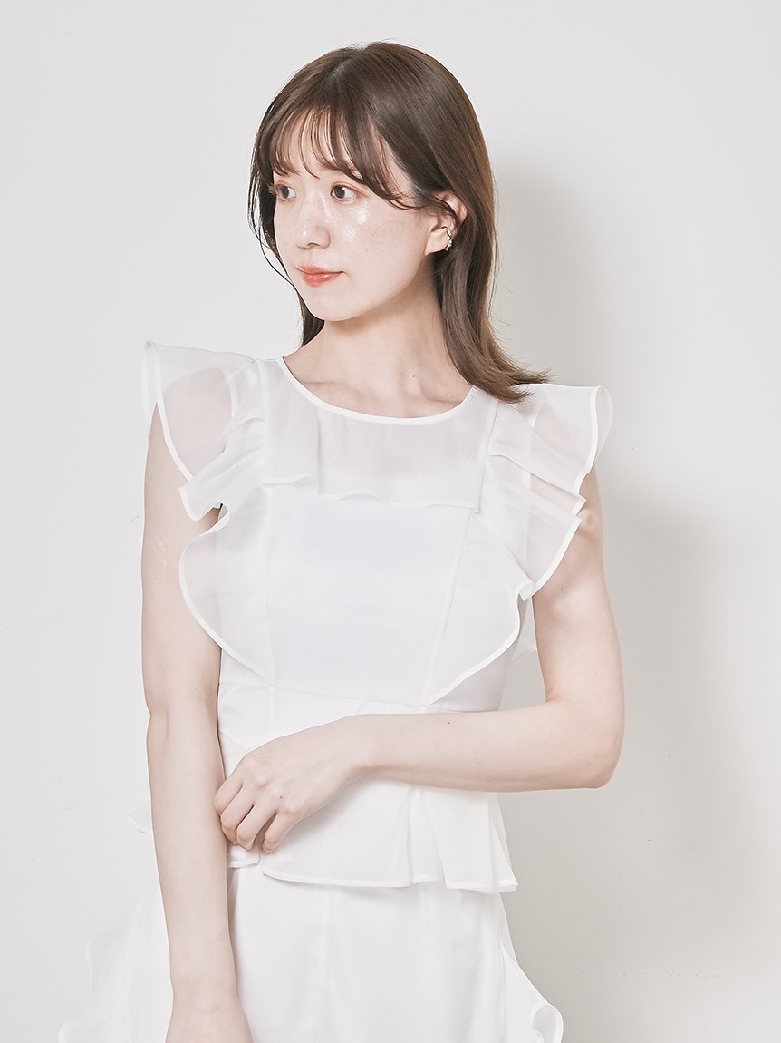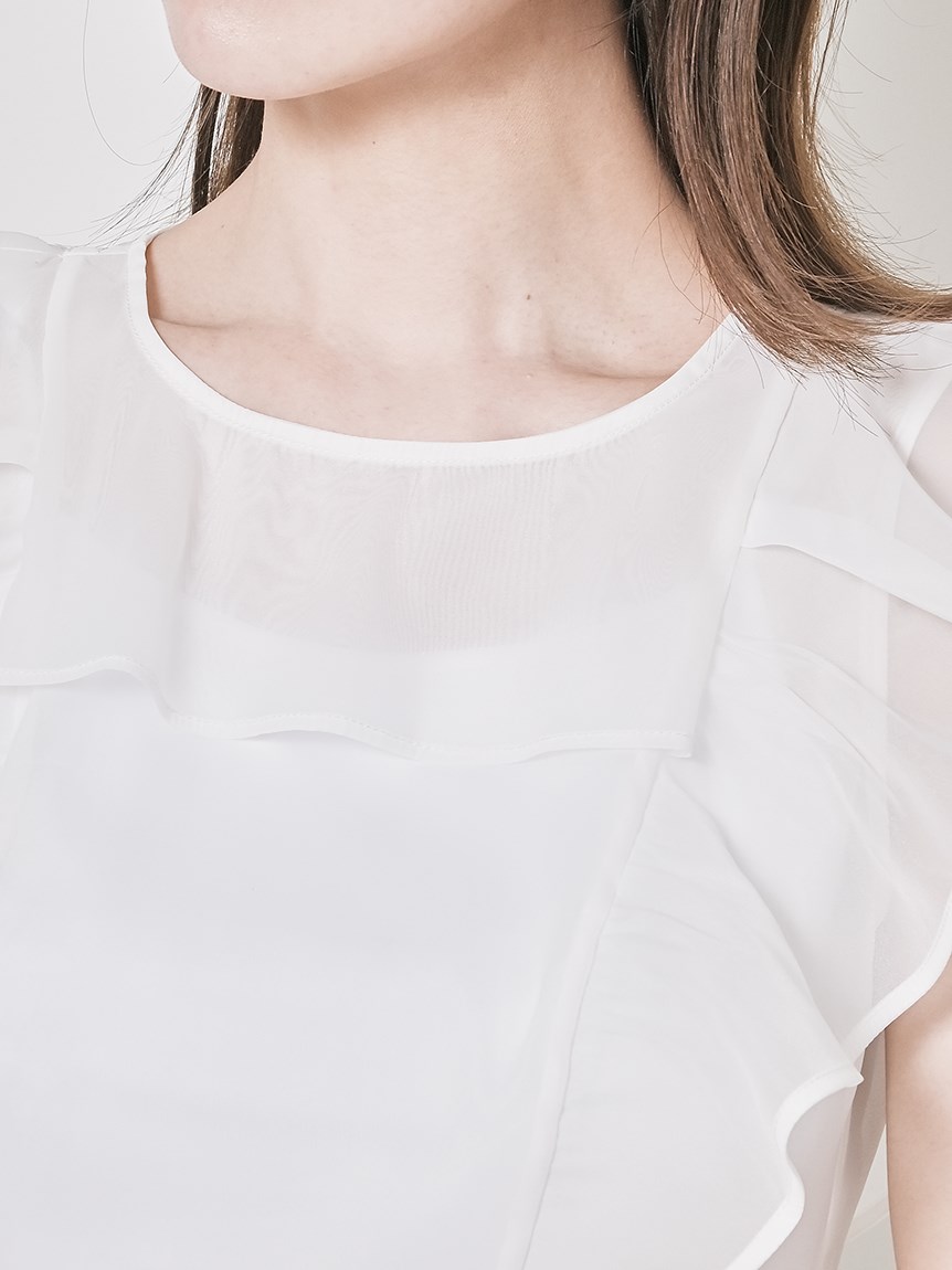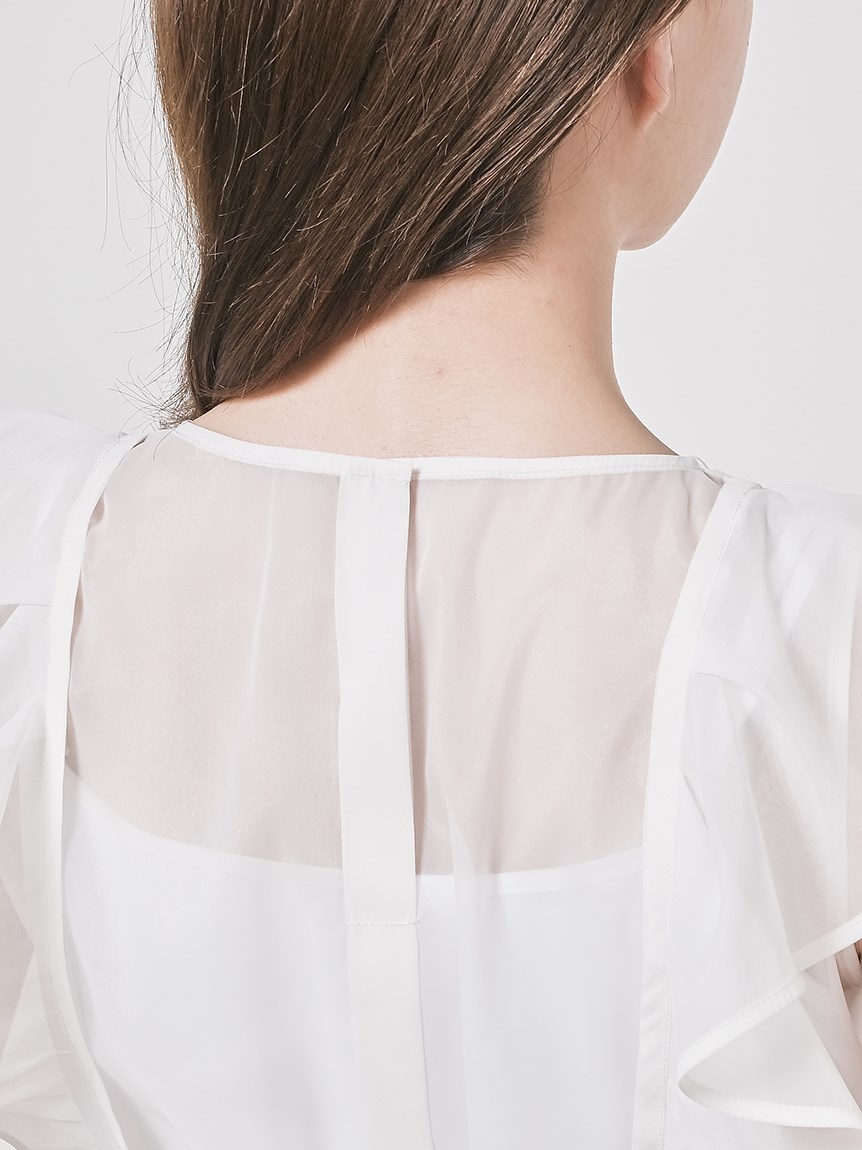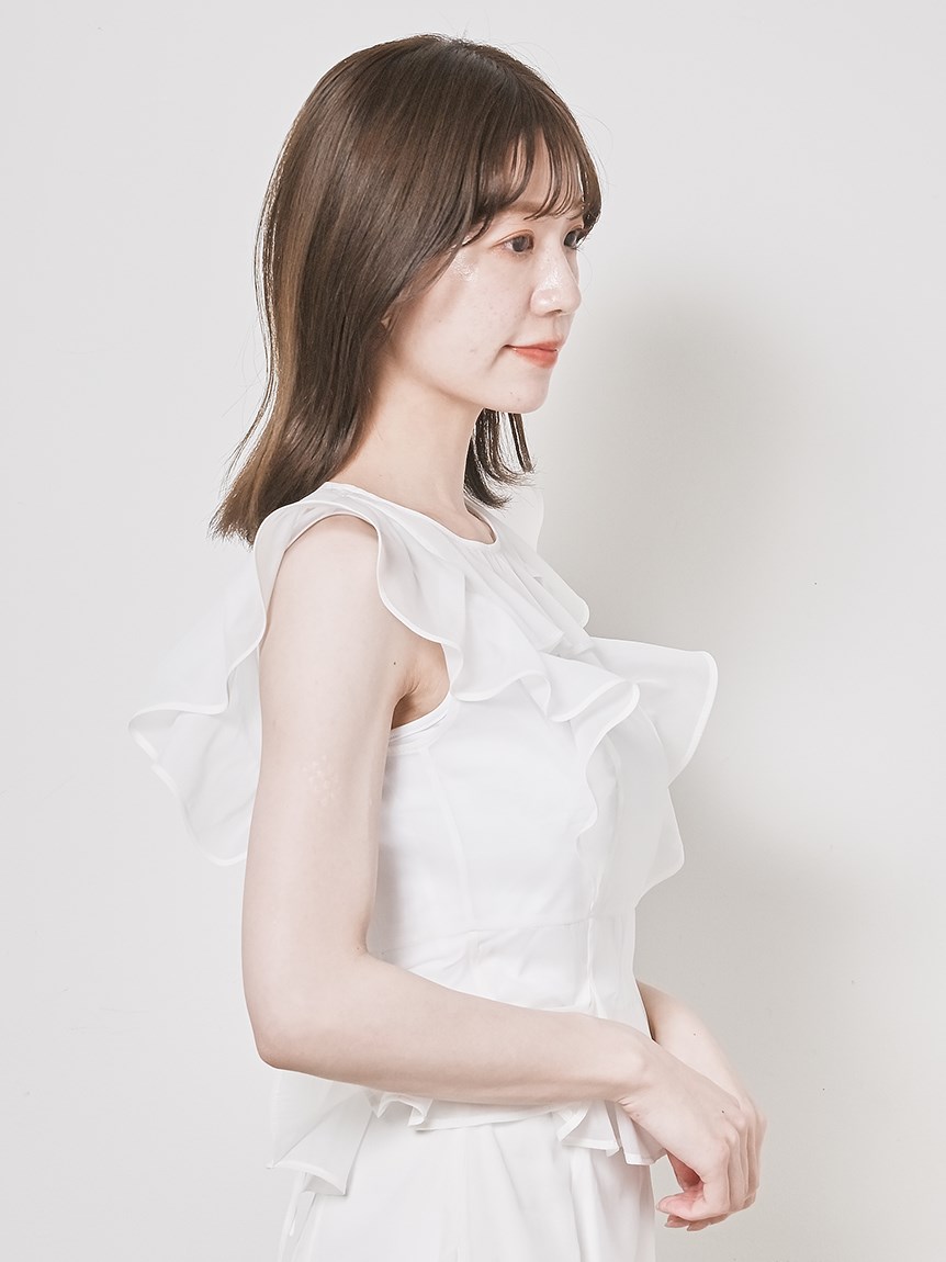 ふんわり広がるフリルが、フェミニンなムードを演出するブラウス。シンプルなインナー付きで、安心して着こなせるアイテムです。華やかなインパクトのあるトップスは、パンツとの相性も抜群。同シリーズのボトム(SWFP231245)と合わせて、セットアップスタイルを楽しむのも◎。