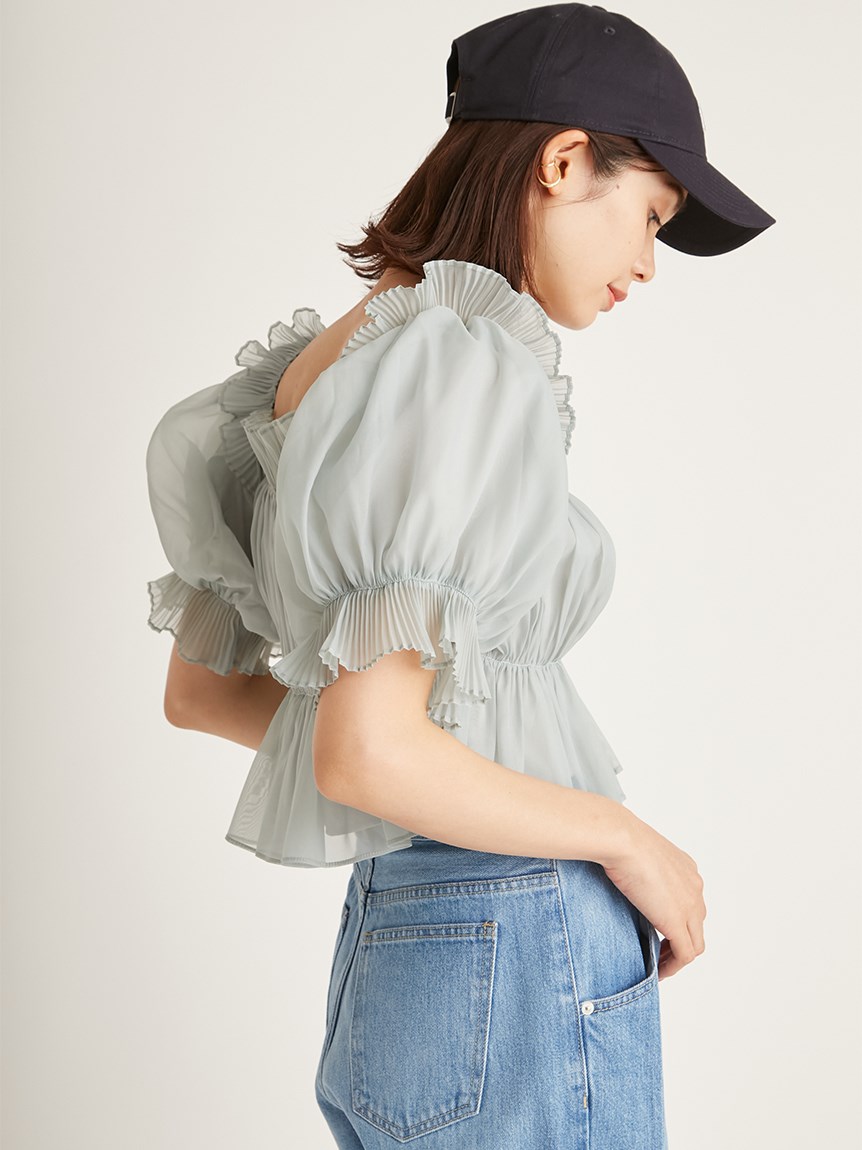 シアーな素材感と大胆な肌見せで、女性らしさを引き立てるオフショルブラウス。華やかなフリルやプリーツをたっぷりと施し、フェミニンな要素をふんだんに詰め込みました。胸下から裾にかけてはフレアラインにすることで、気になる体型をさり気なくカバー。パンツともスカートとも合わせやすく、幅広いコーディネートを楽しめます。