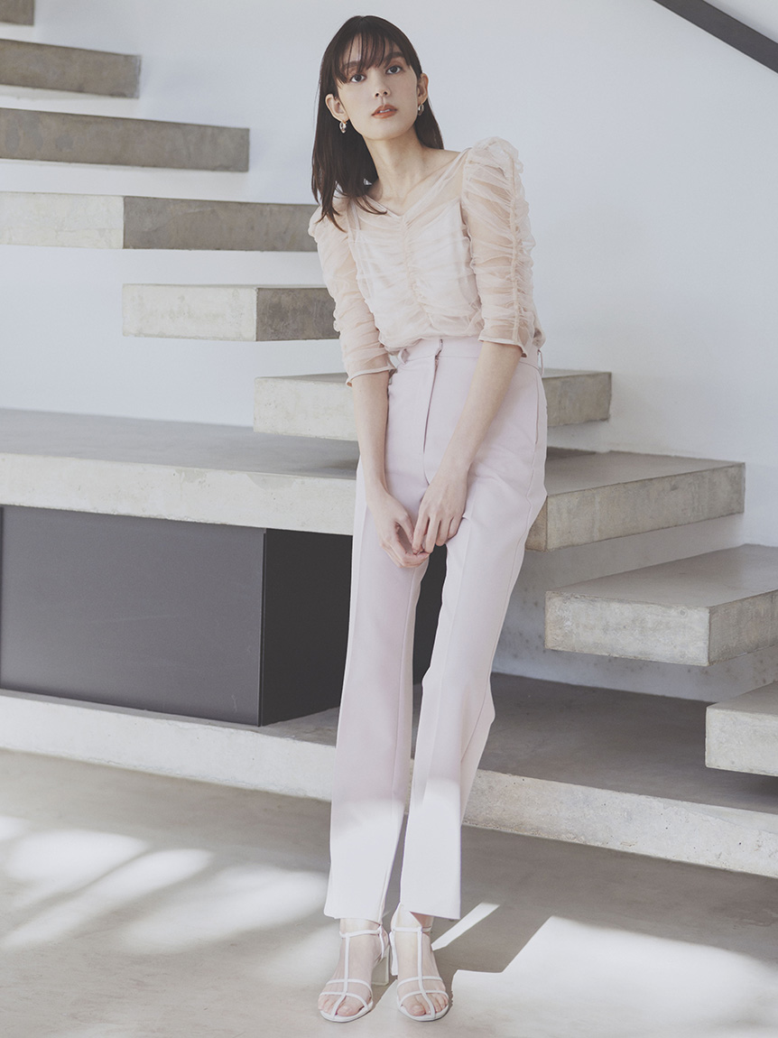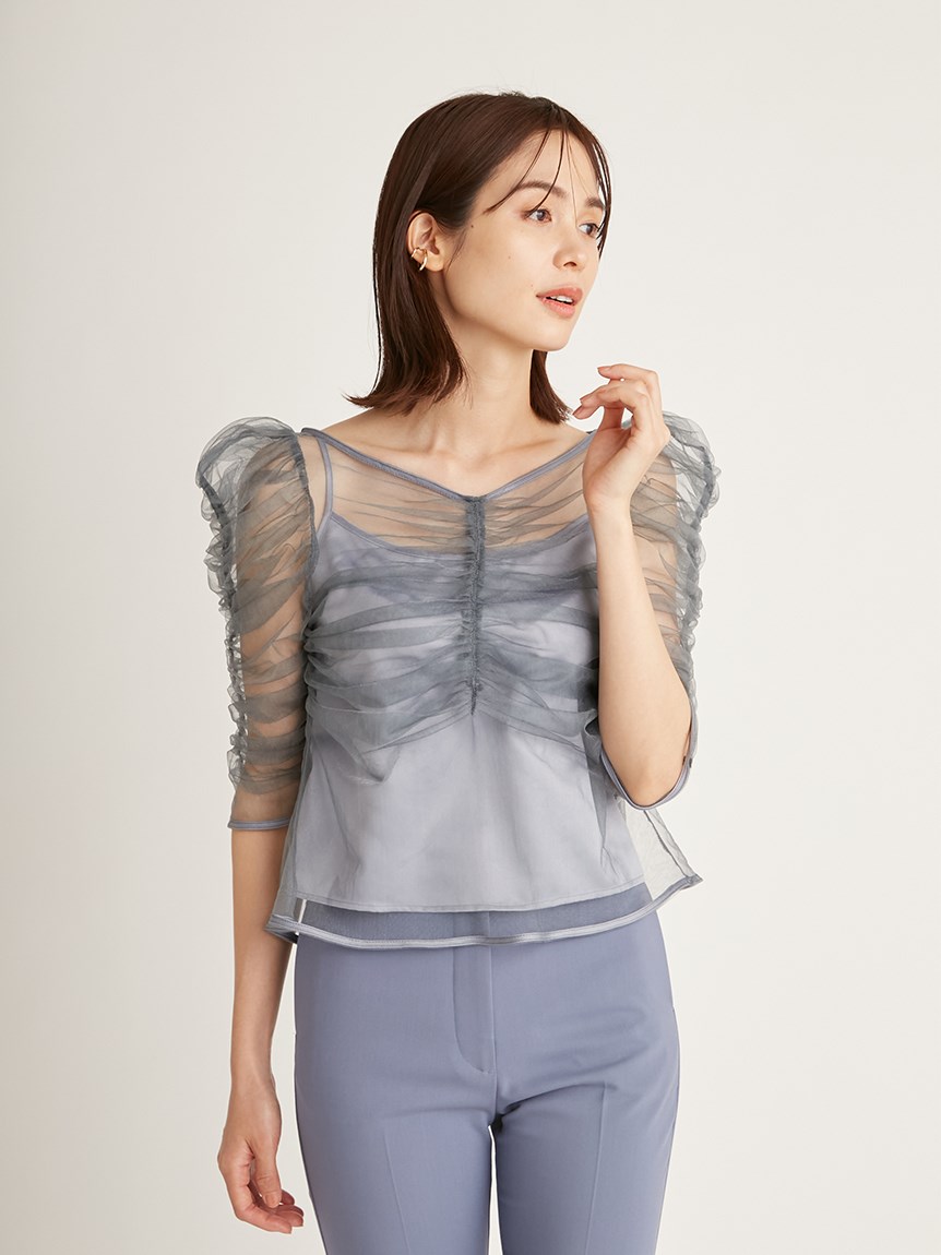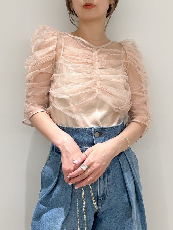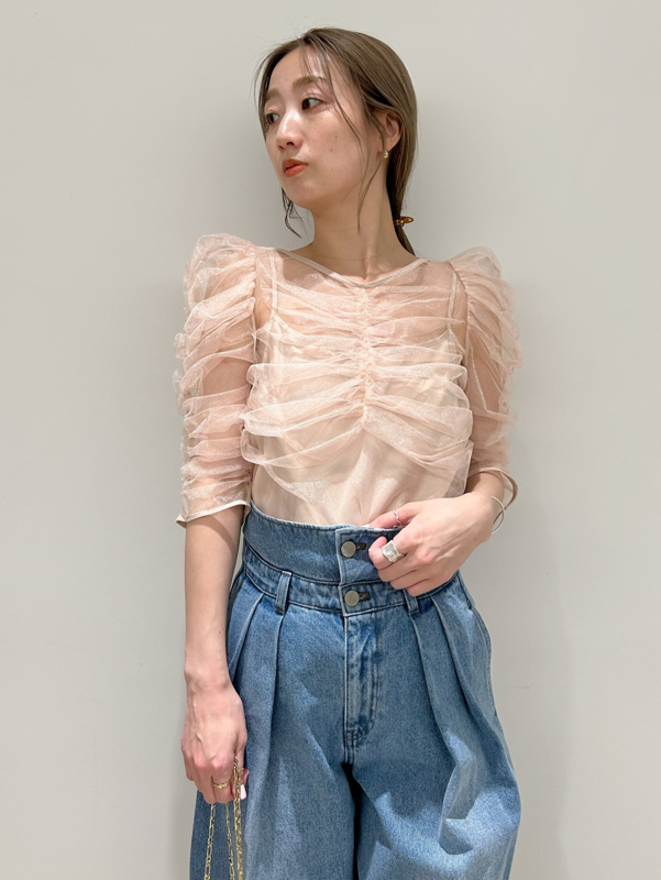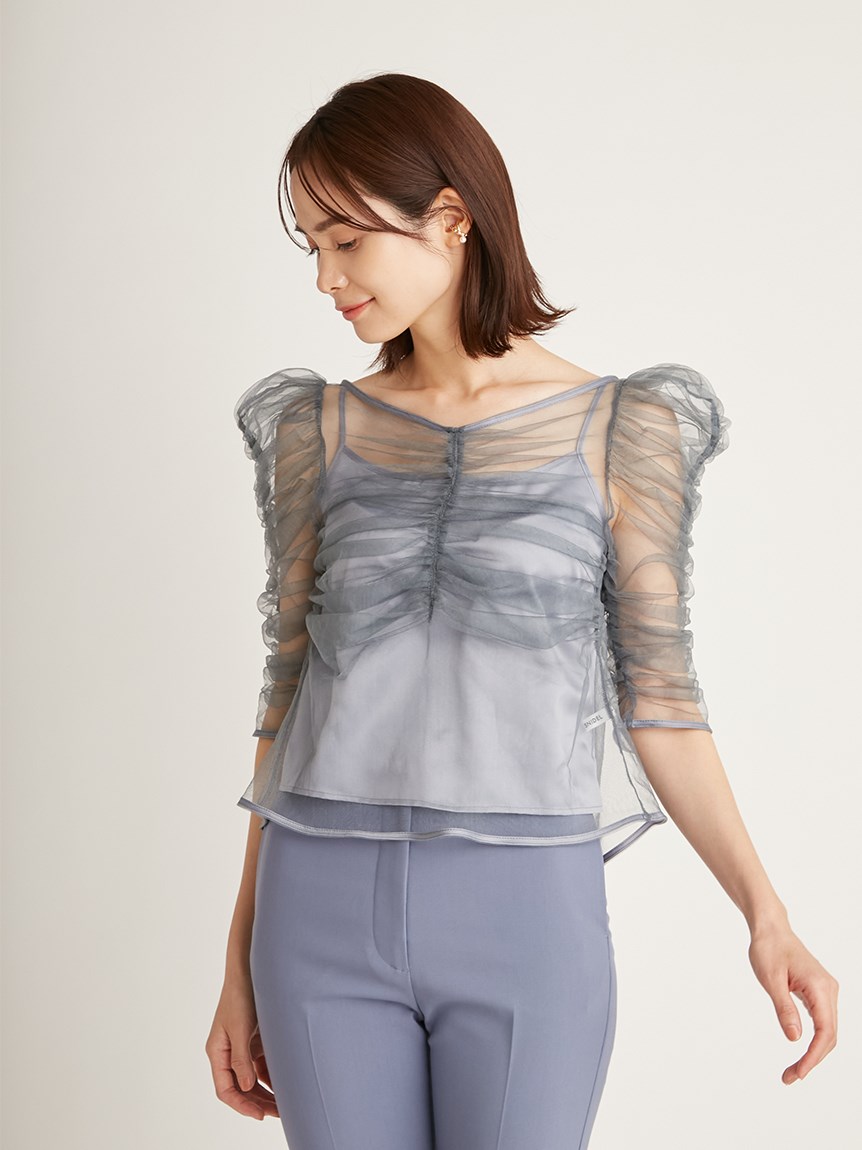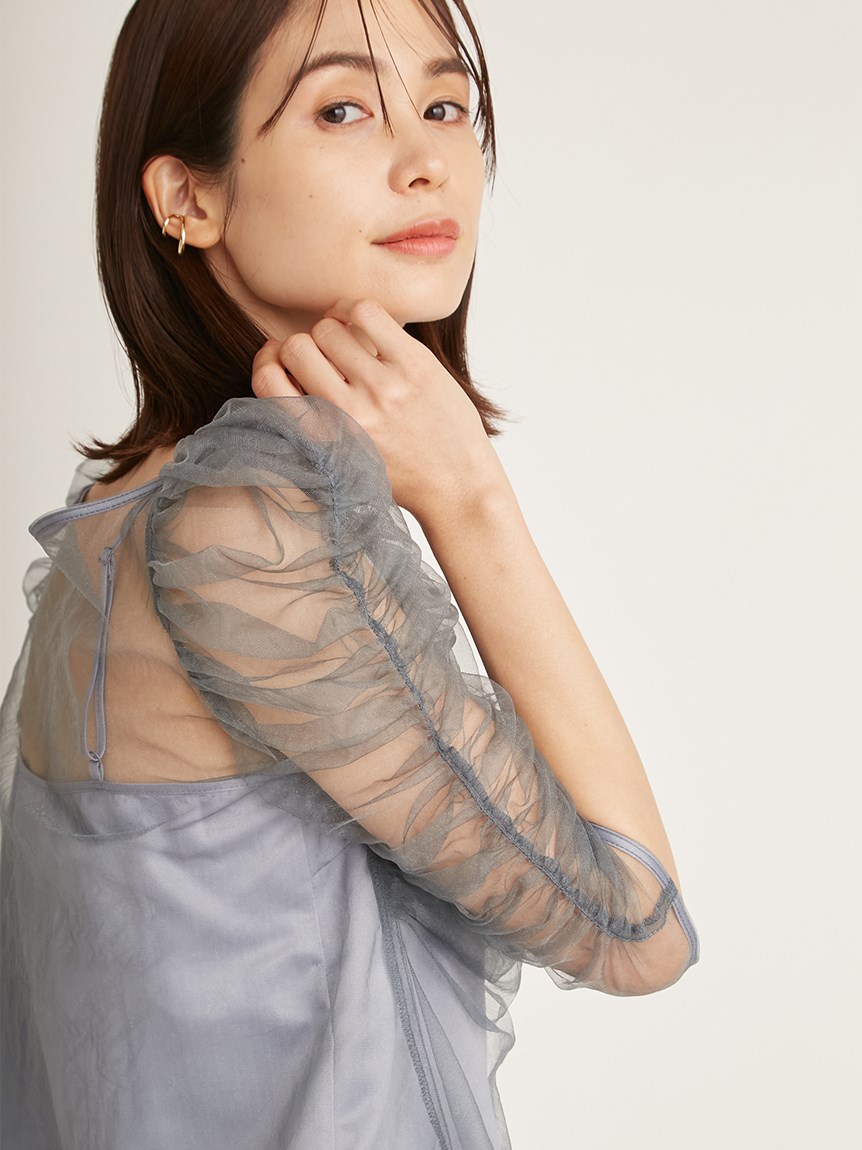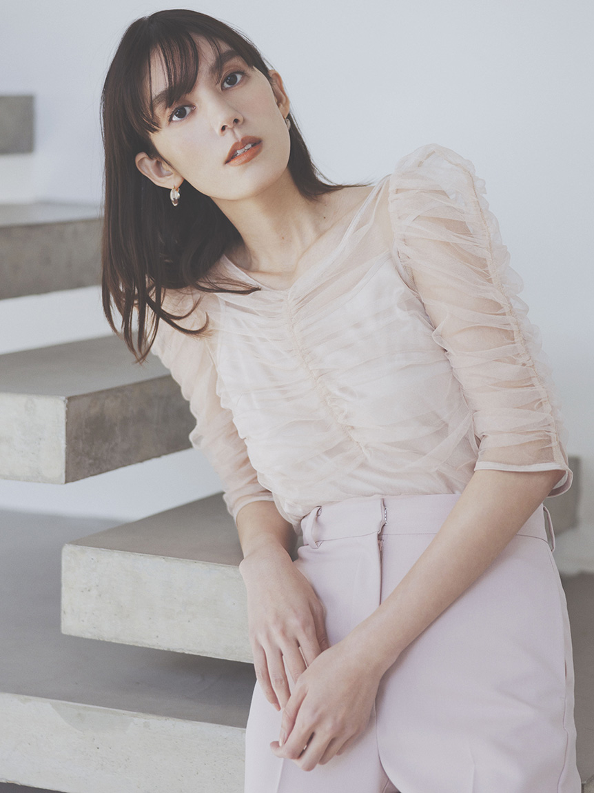 袖とバストにたっぷりとギャザーを効かせた、レディムード溢れるブラウス。透け感のある素材を使用することで、甘さを抑え大人っぽさを演出しました。袖山に高さを持たせた構築的なフォルムのボリュームスリーブがモードなアクセントに。身頃部分はすっきりとしたシルエットに仕上げているのでパンツともスカートとも合わせやすく、サロペットなどのインナーとしてもおすすめです。