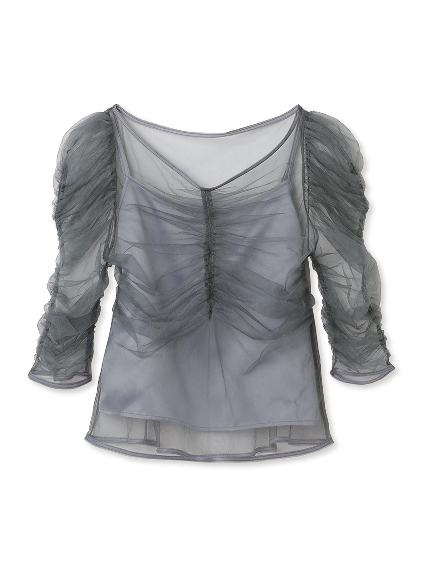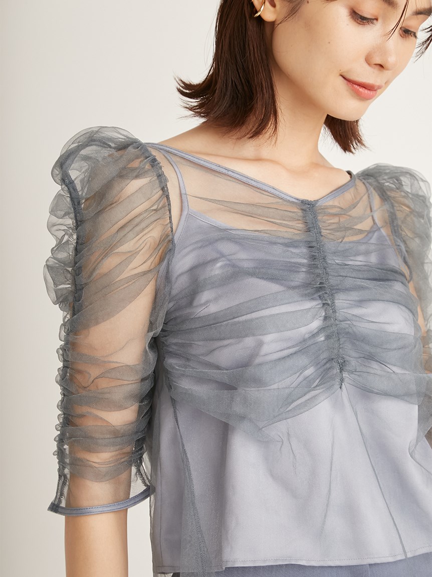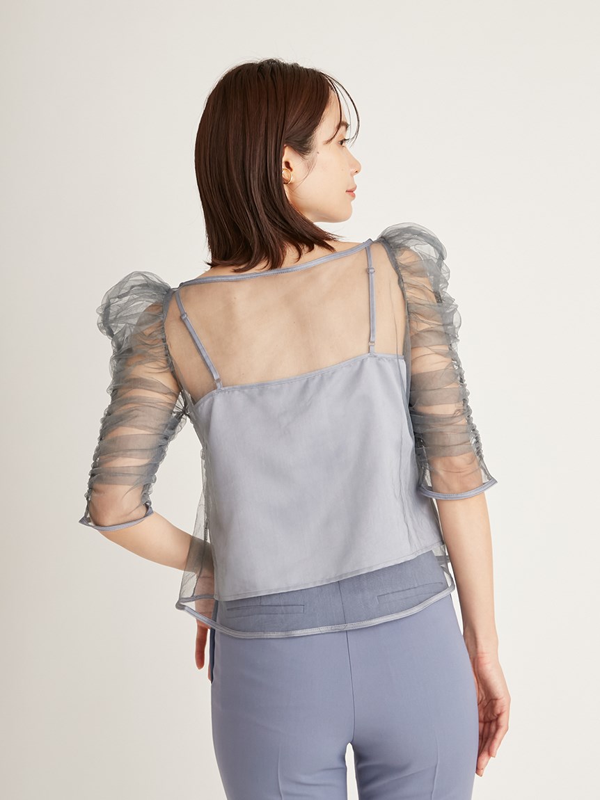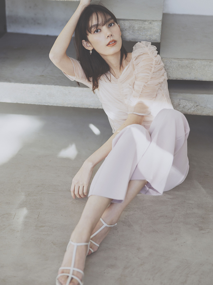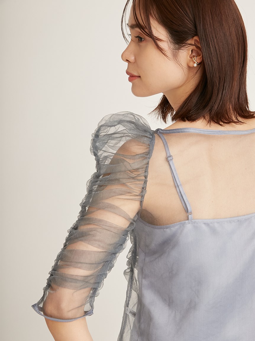 袖とバストにたっぷりとギャザーを効かせた、レディムード溢れるブラウス。透け感のある素材を使用することで、甘さを抑え大人っぽさを演出しました。袖山に高さを持たせた構築的なフォルムのボリュームスリーブがモードなアクセントに。身頃部分はすっきりとしたシルエットに仕上げているのでパンツともスカートとも合わせやすく、サロペットなどのインナーとしてもおすすめです。