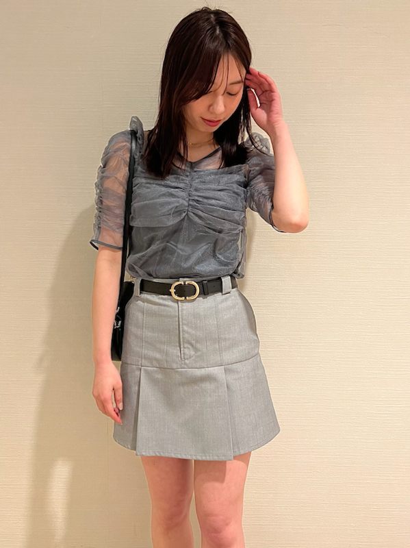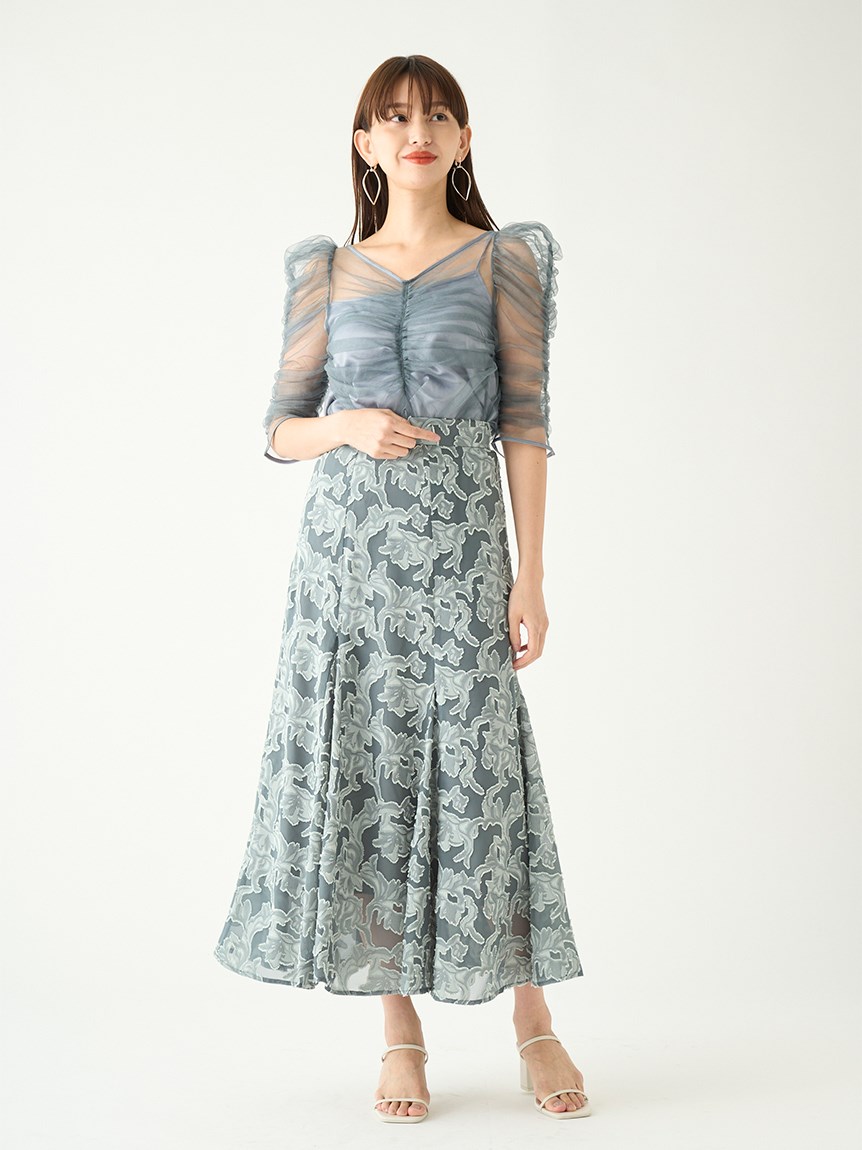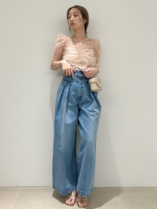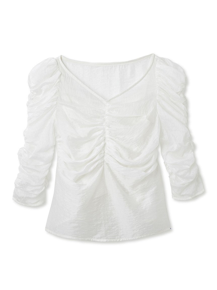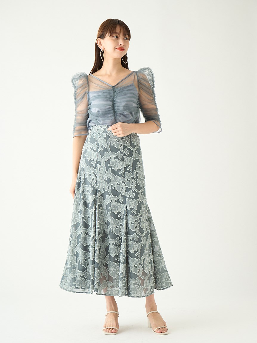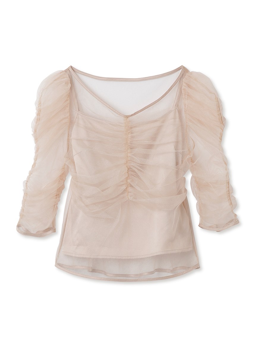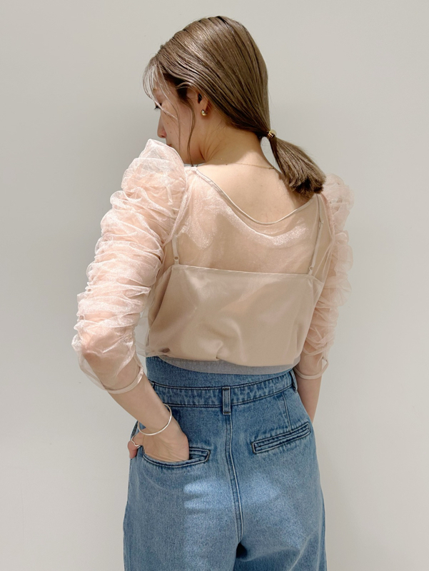 袖とバストにたっぷりとギャザーを効かせた、レディムード溢れるブラウス。透け感のある素材を使用することで、甘さを抑え大人っぽさを演出しました。袖山に高さを持たせた構築的なフォルムのボリュームスリーブがモードなアクセントに。身頃部分はすっきりとしたシルエットに仕上げているのでパンツともスカートとも合わせやすく、サロペットなどのインナーとしてもおすすめです。