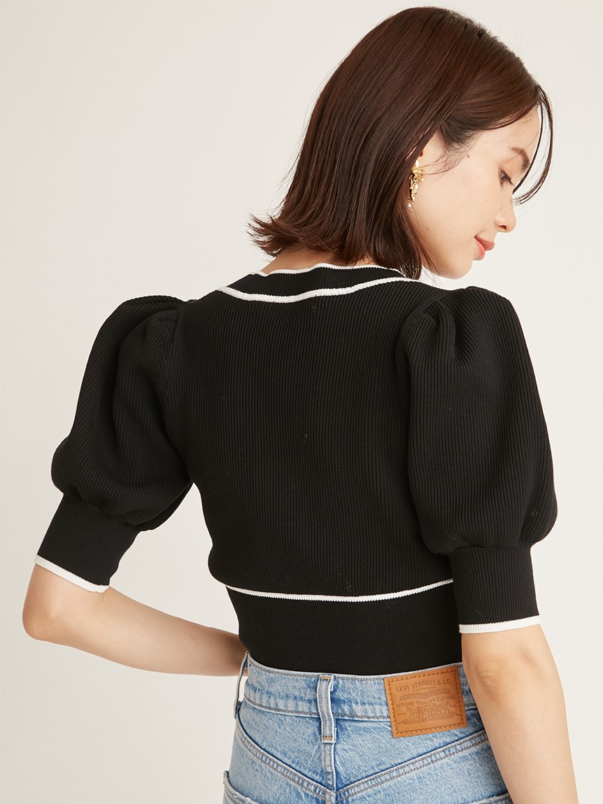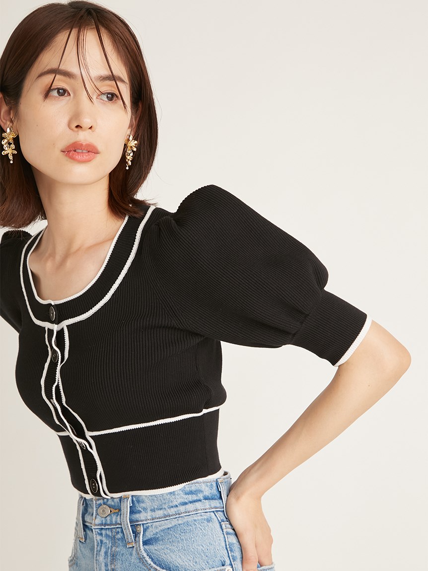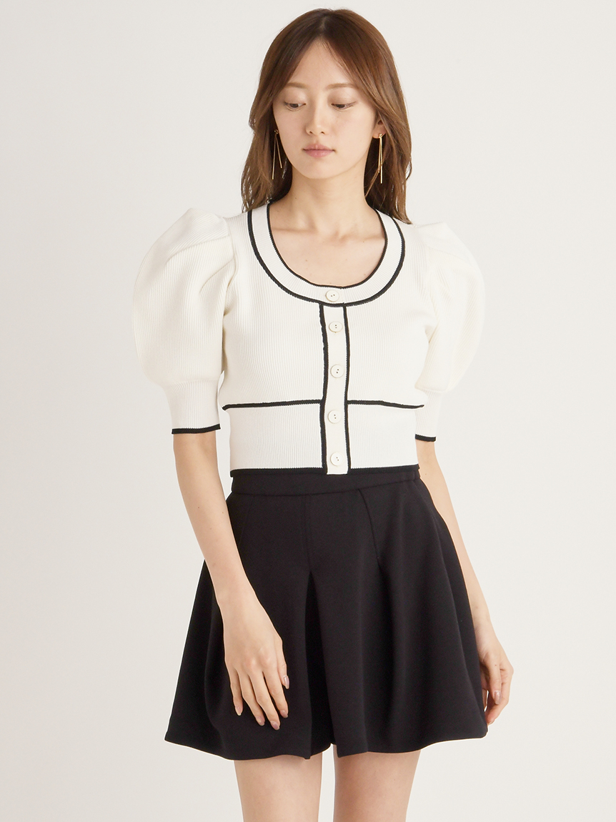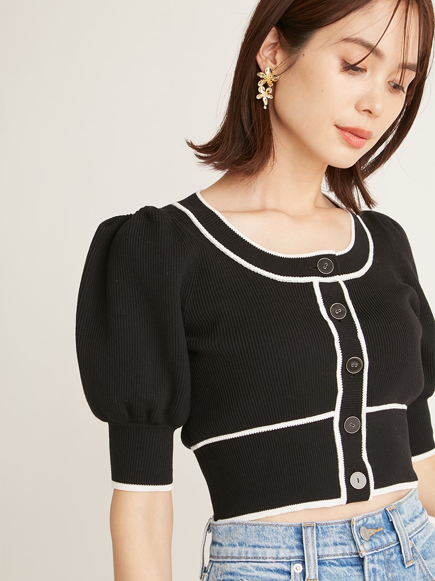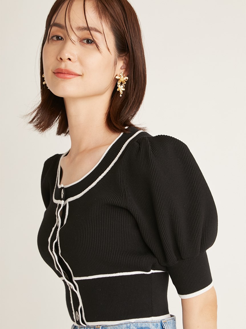 トレンドのクロップド丈を採用した、プラスワンでスタイリングの鮮度が高まるニットプルオーバー。たっぷりとボリュームを持たせたパフスリーブでモードな印象に。バイカラーデザインとカーディガンのようなフロントデザインに金縁ボタンが今年らしいレトロなムードを演出しています。裾&袖口を幅広のリブで切り替えたメリハリシルエットでスタイルアップ効果も抜群です。