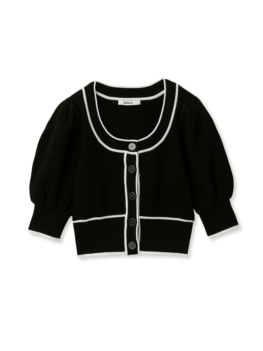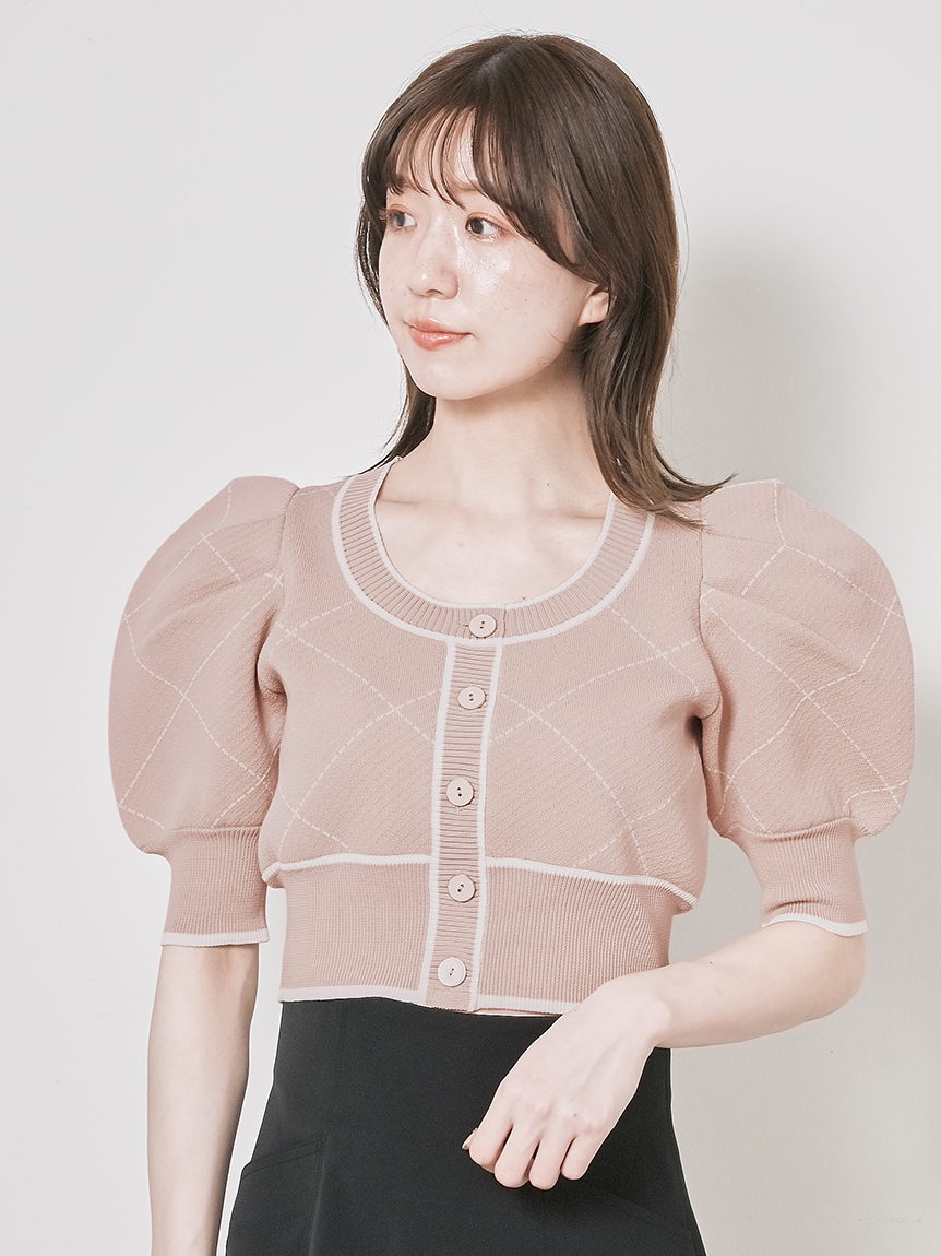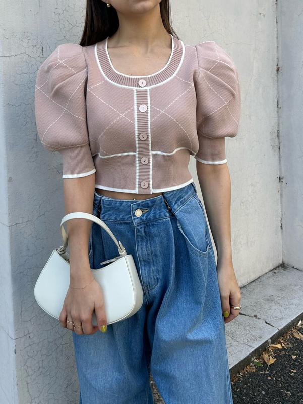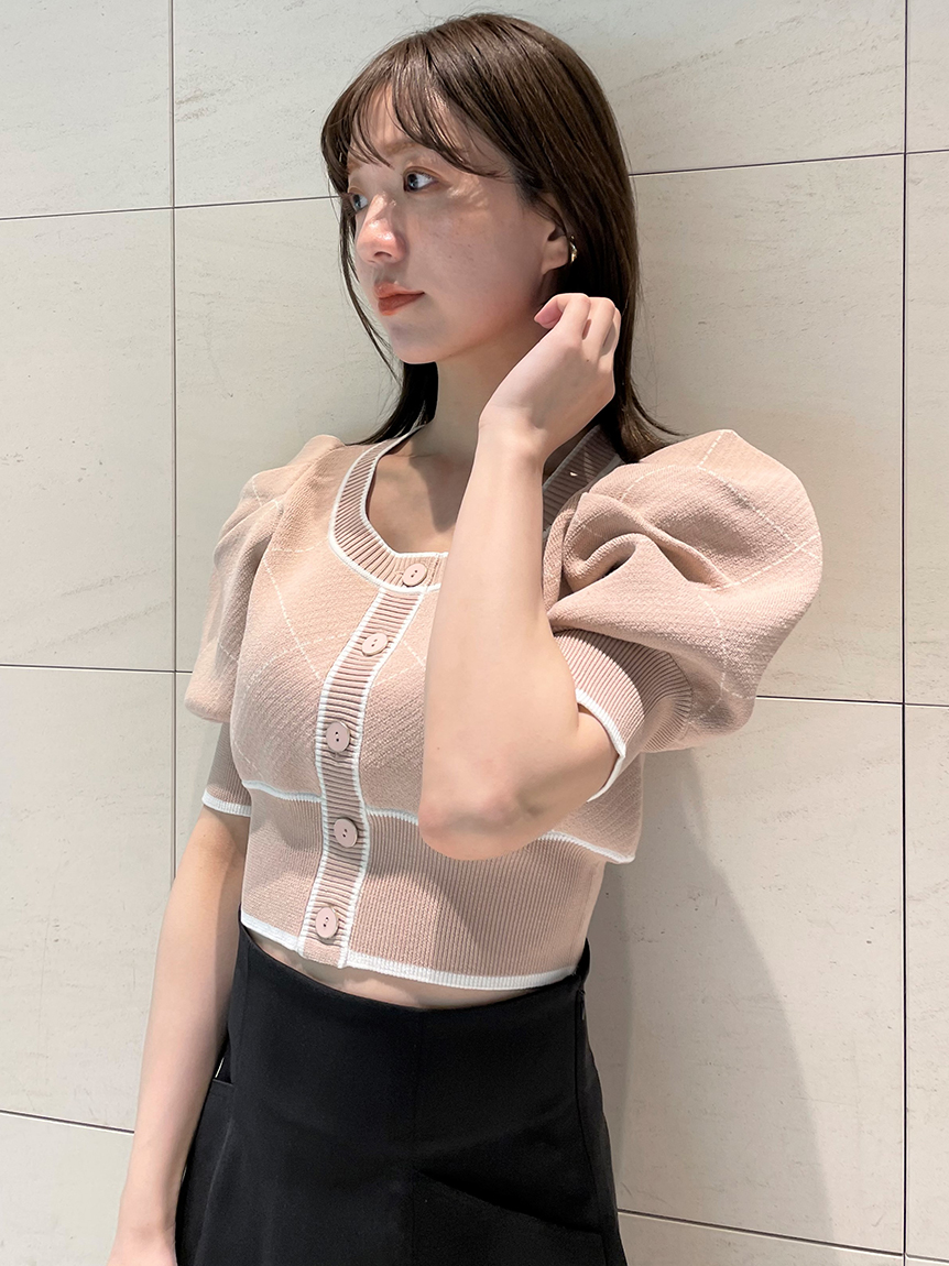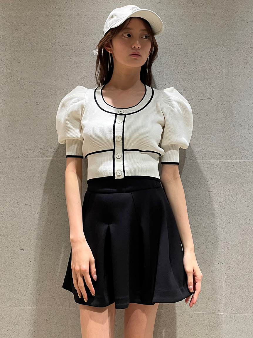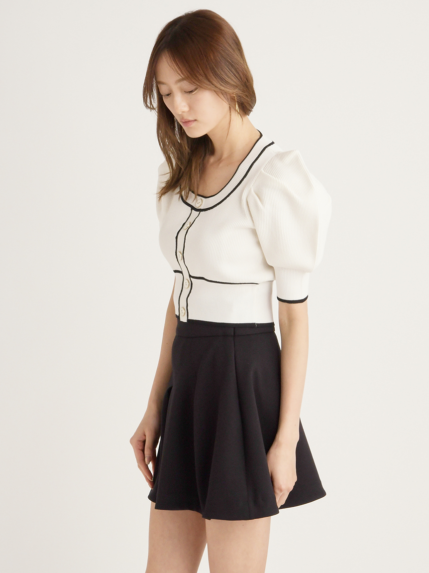 トレンドのクロップド丈を採用した、プラスワンでスタイリングの鮮度が高まるニットプルオーバー。たっぷりとボリュームを持たせたパフスリーブでモードな印象に。バイカラーデザインとカーディガンのようなフロントデザインに金縁ボタンが今年らしいレトロなムードを演出しています。裾&袖口を幅広のリブで切り替えたメリハリシルエットでスタイルアップ効果も抜群です。