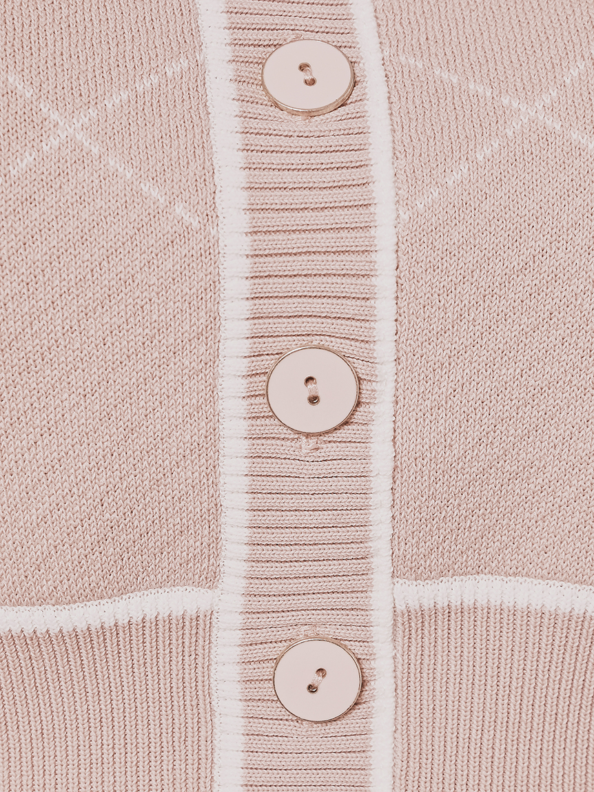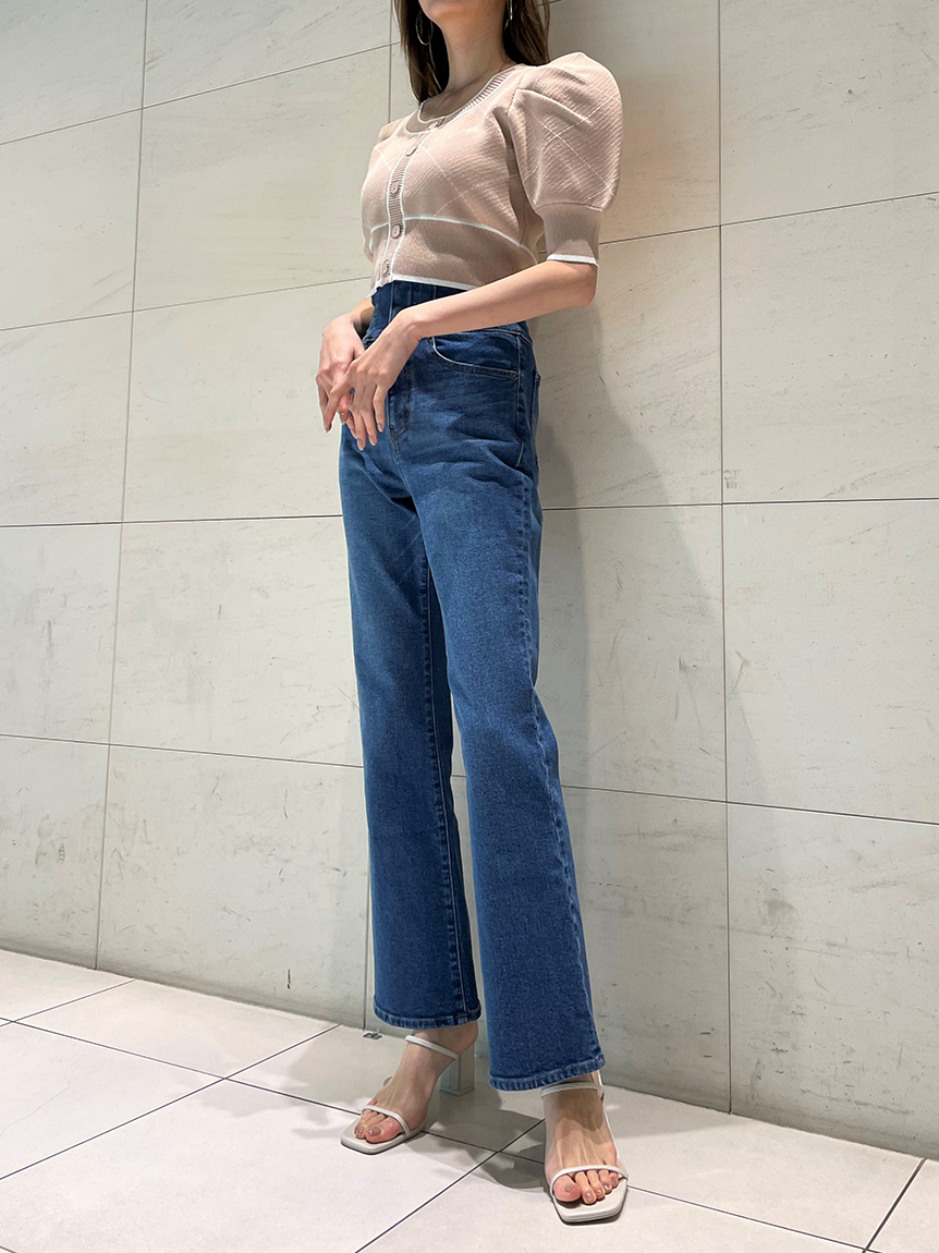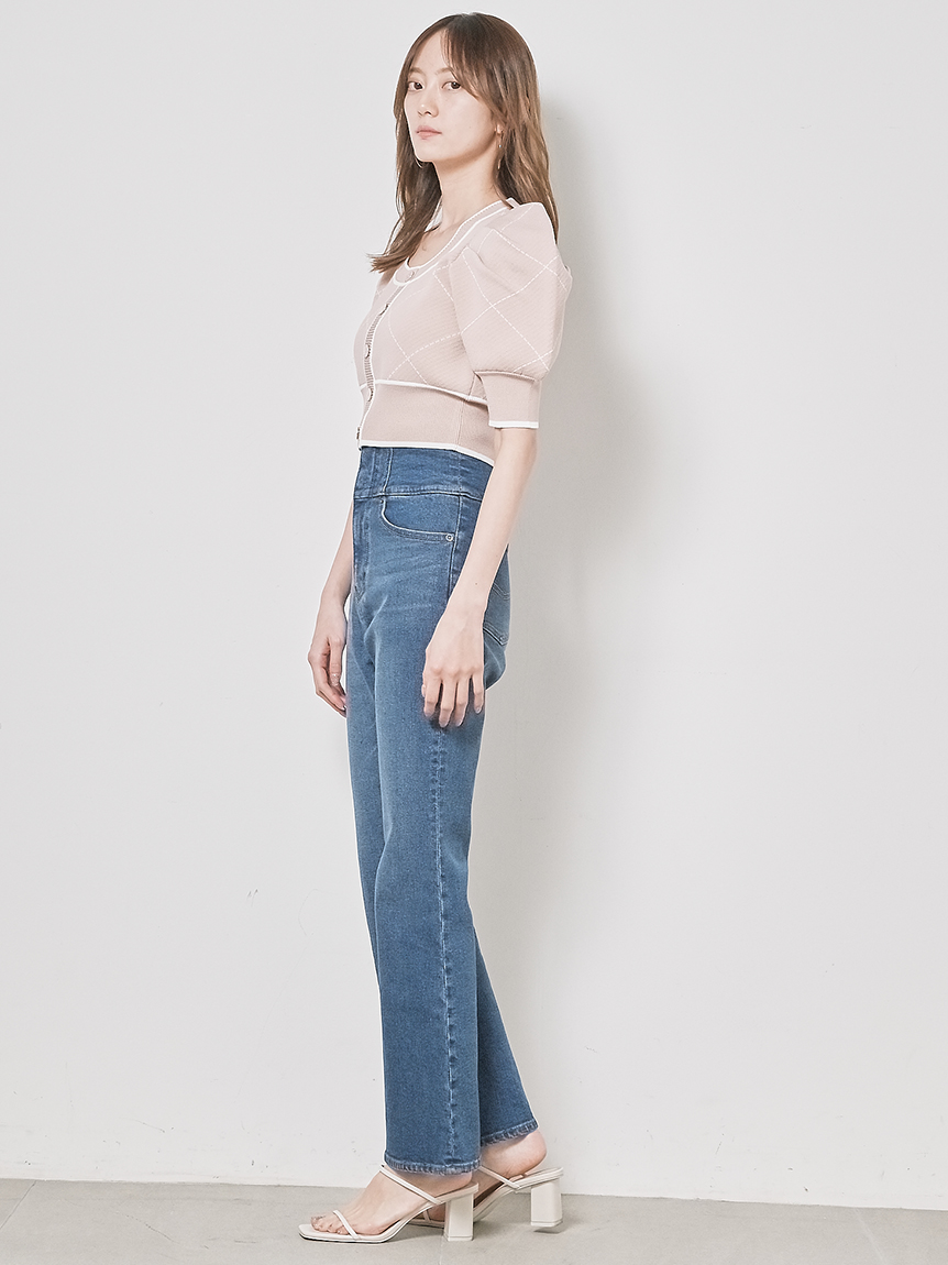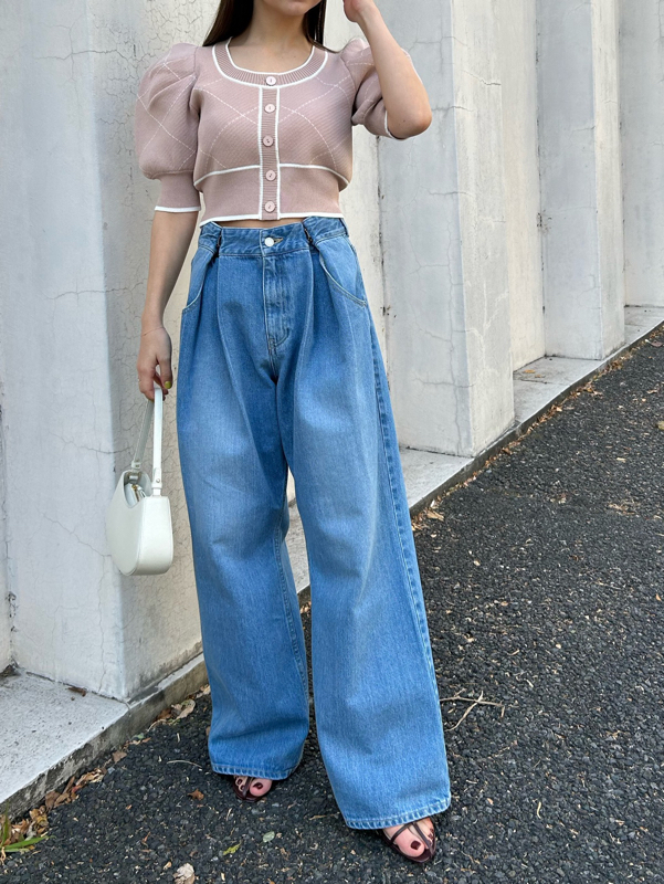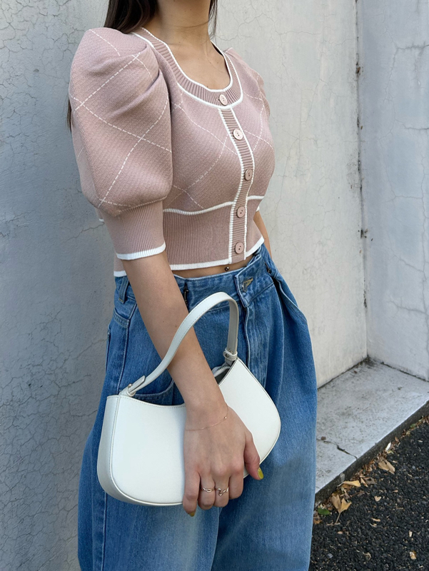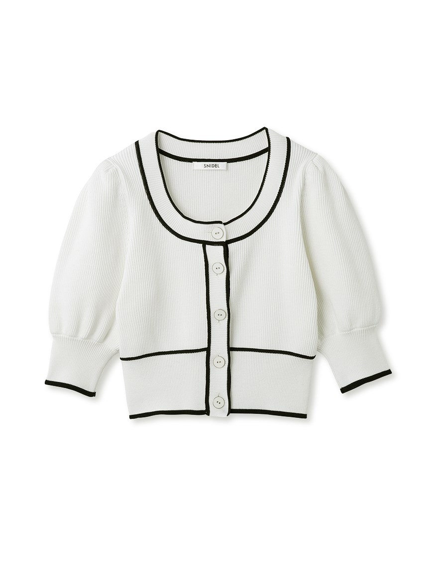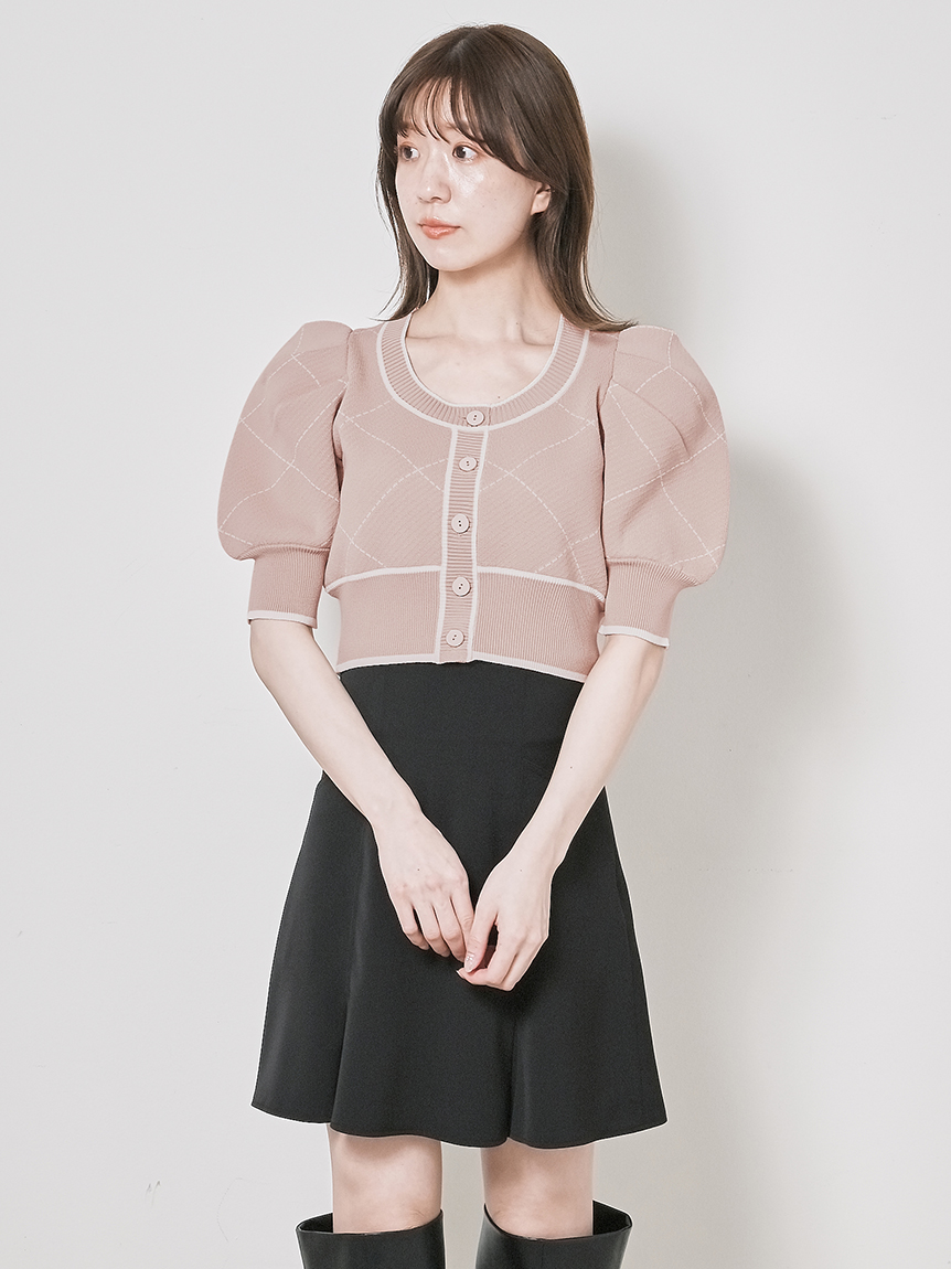 トレンドのクロップド丈を採用した、プラスワンでスタイリングの鮮度が高まるニットプルオーバー。たっぷりとボリュームを持たせたパフスリーブでモードな印象に。バイカラーデザインとカーディガンのようなフロントデザインに金縁ボタンが今年らしいレトロなムードを演出しています。裾&袖口を幅広のリブで切り替えたメリハリシルエットでスタイルアップ効果も抜群です。