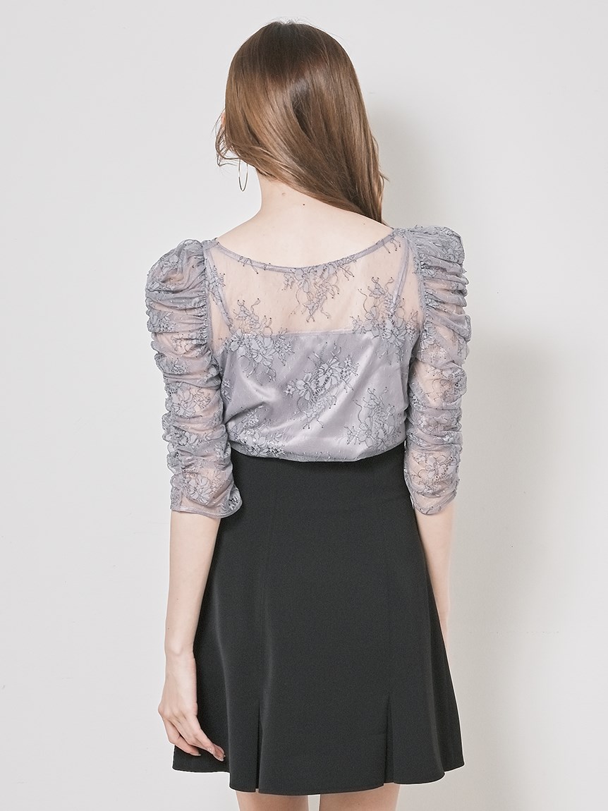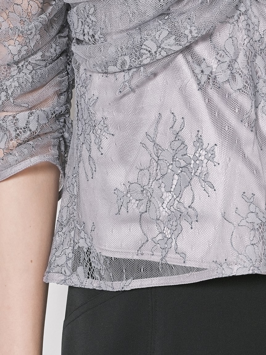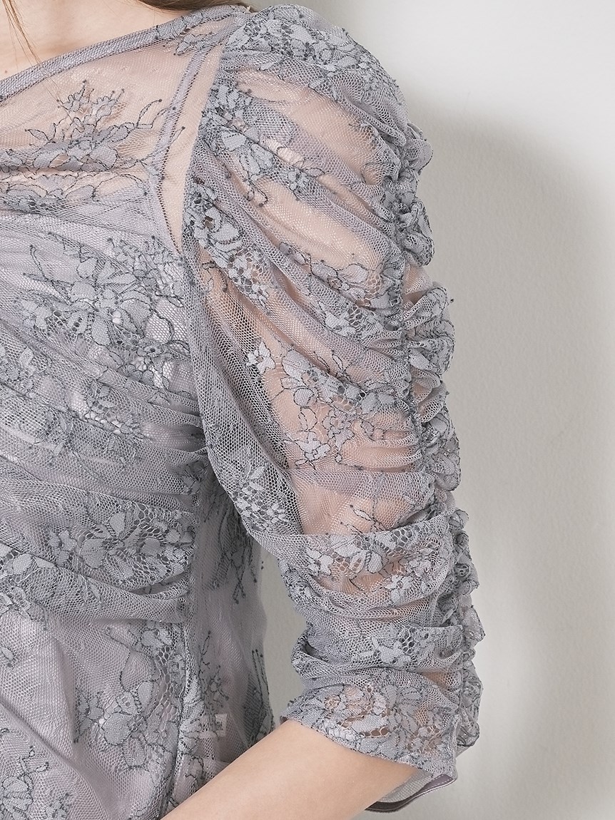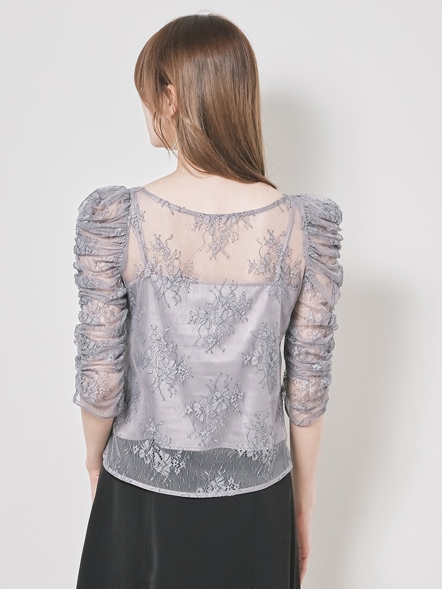 袖とバストにたっぷりとギャザーを効かせた、レディムード溢れるブラウス。透け感のあるレース素材を使用することで、甘さを抑え大人っぽさを演出しました。袖山に高さを持たせた構築的なフォルムのボリュームスリーブがモードなアクセントに。身頃部分はすっきりとしたシルエットに仕上げているのでパンツともスカートとも合わせやすく、サロペットなどのインナーとしてもおすすめです。