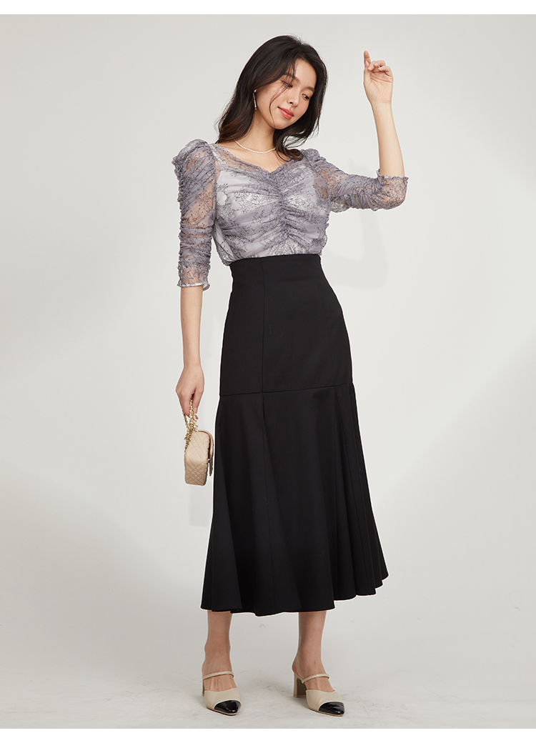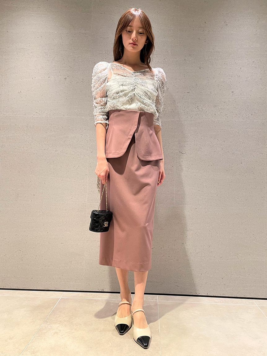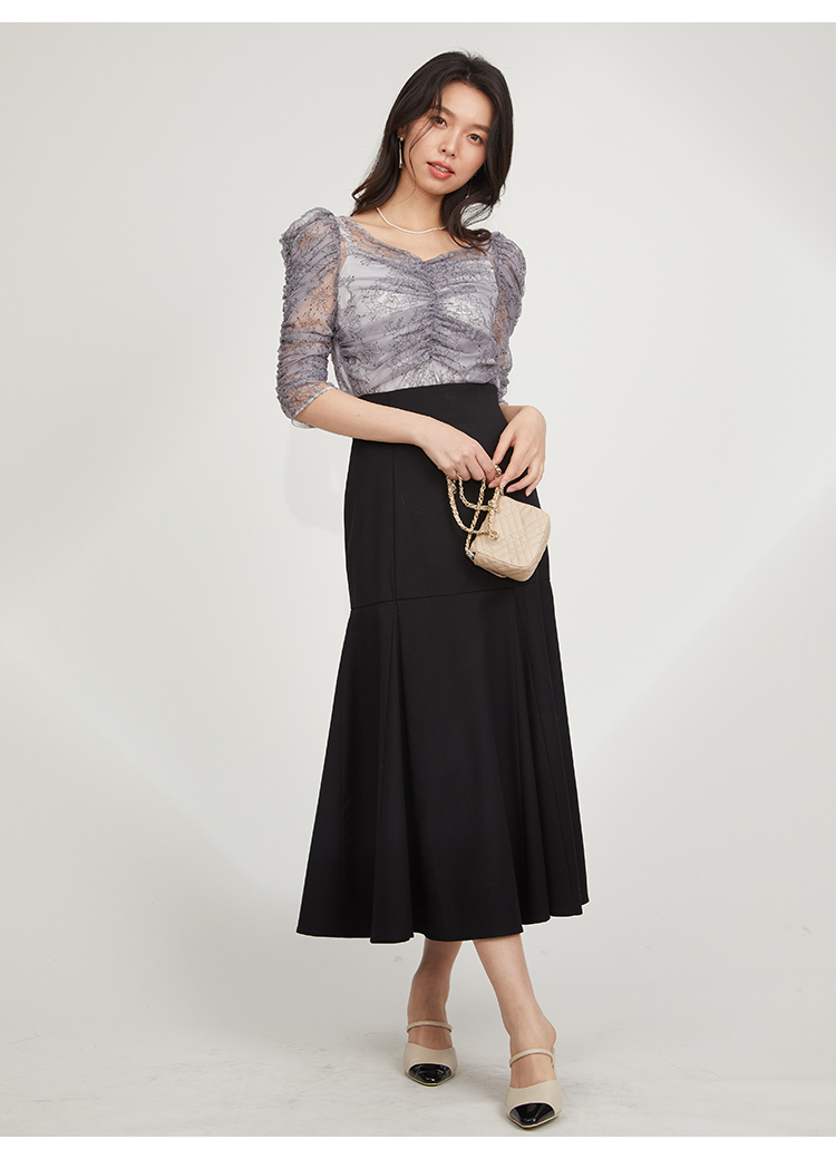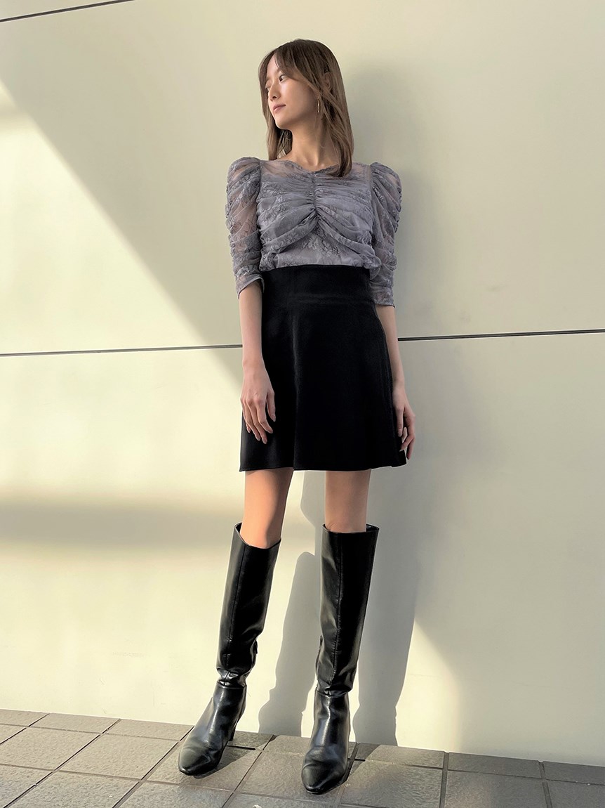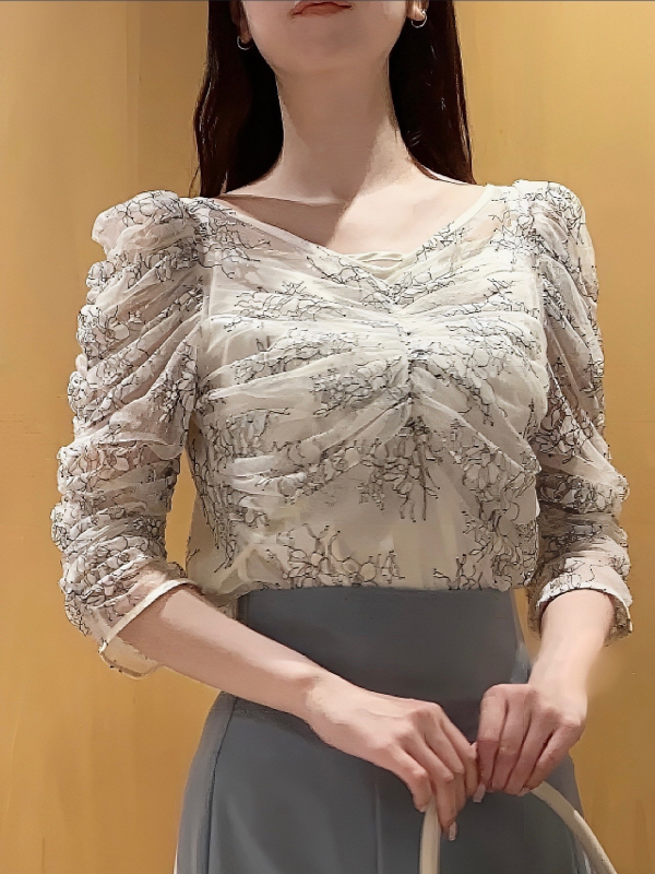 袖とバストにたっぷりとギャザーを効かせた、レディムード溢れるブラウス。透け感のあるレース素材を使用することで、甘さを抑え大人っぽさを演出しました。袖山に高さを持たせた構築的なフォルムのボリュームスリーブがモードなアクセントに。身頃部分はすっきりとしたシルエットに仕上げているのでパンツともスカートとも合わせやすく、サロペットなどのインナーとしてもおすすめです。