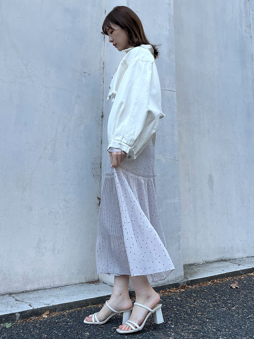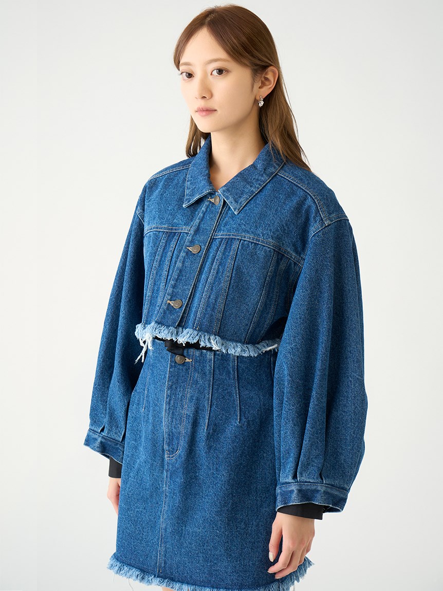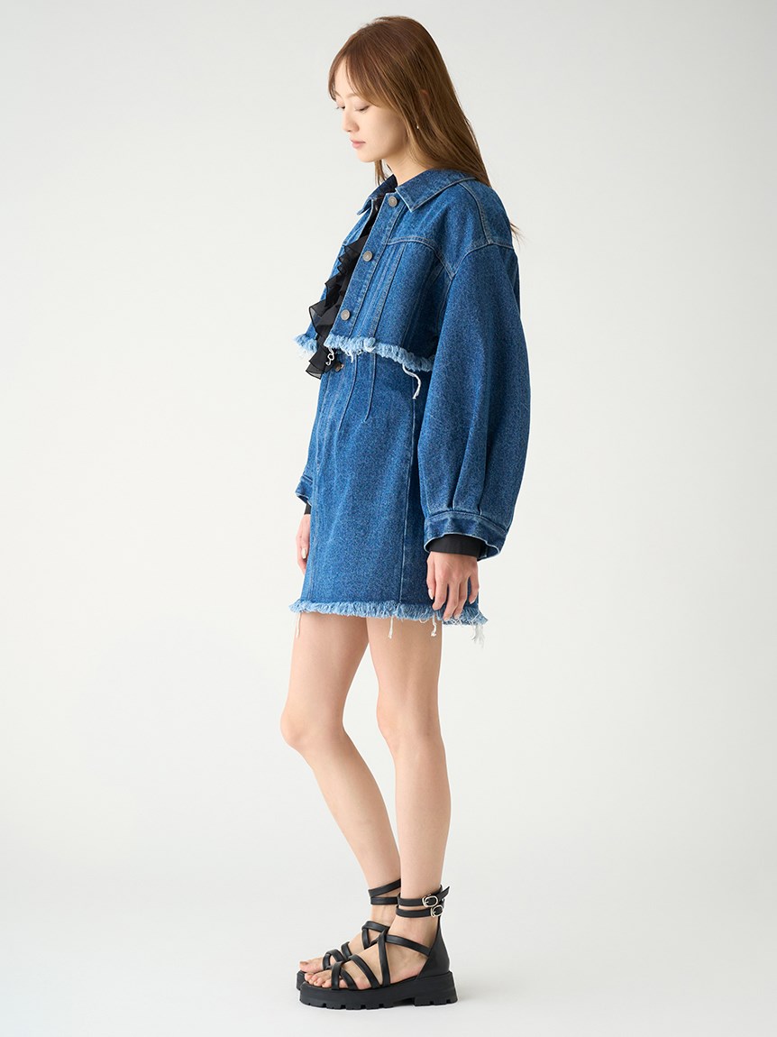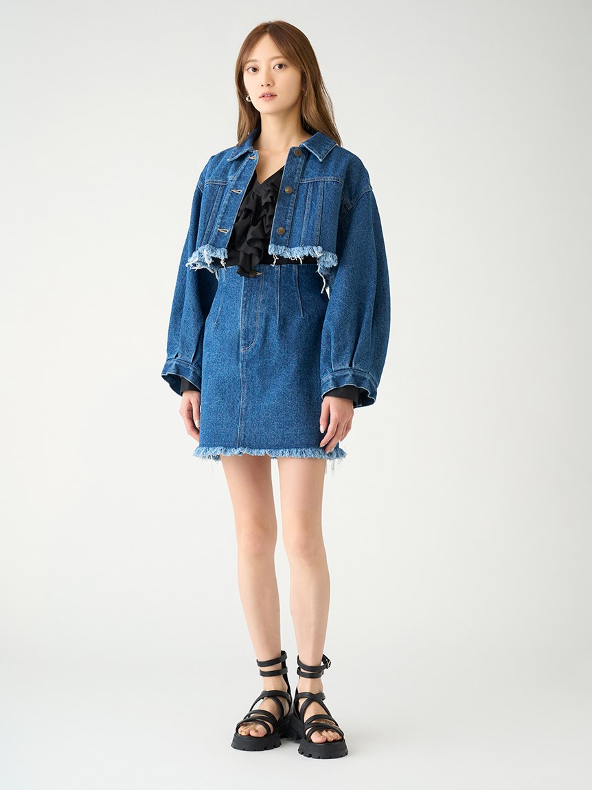 クロップド丈が今年らしいデニムジャケット。裾をカットオフで仕上げることでモードな雰囲気を演出しました。インに合わせるトップス次第で雰囲気ががらりと変わり、幅広いコーディネートが楽しめます。同素材を使用したミニスカート(SWFS231174)と合わせればトレンド感溢れるスタイリングが完成します。