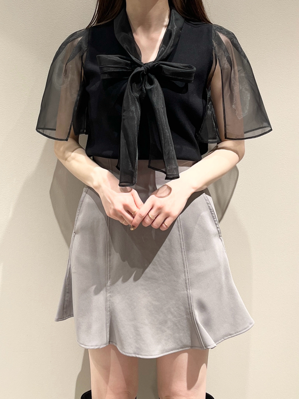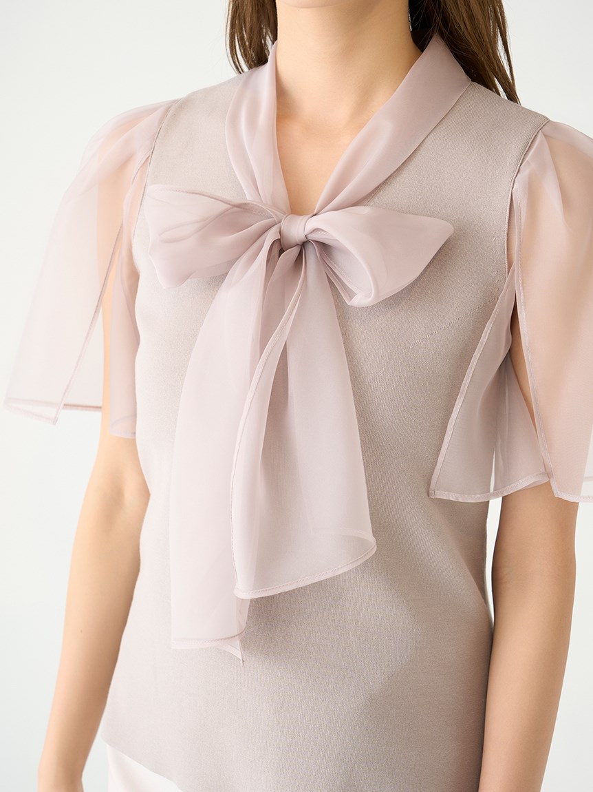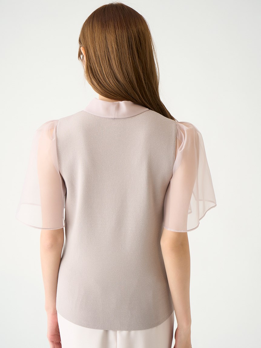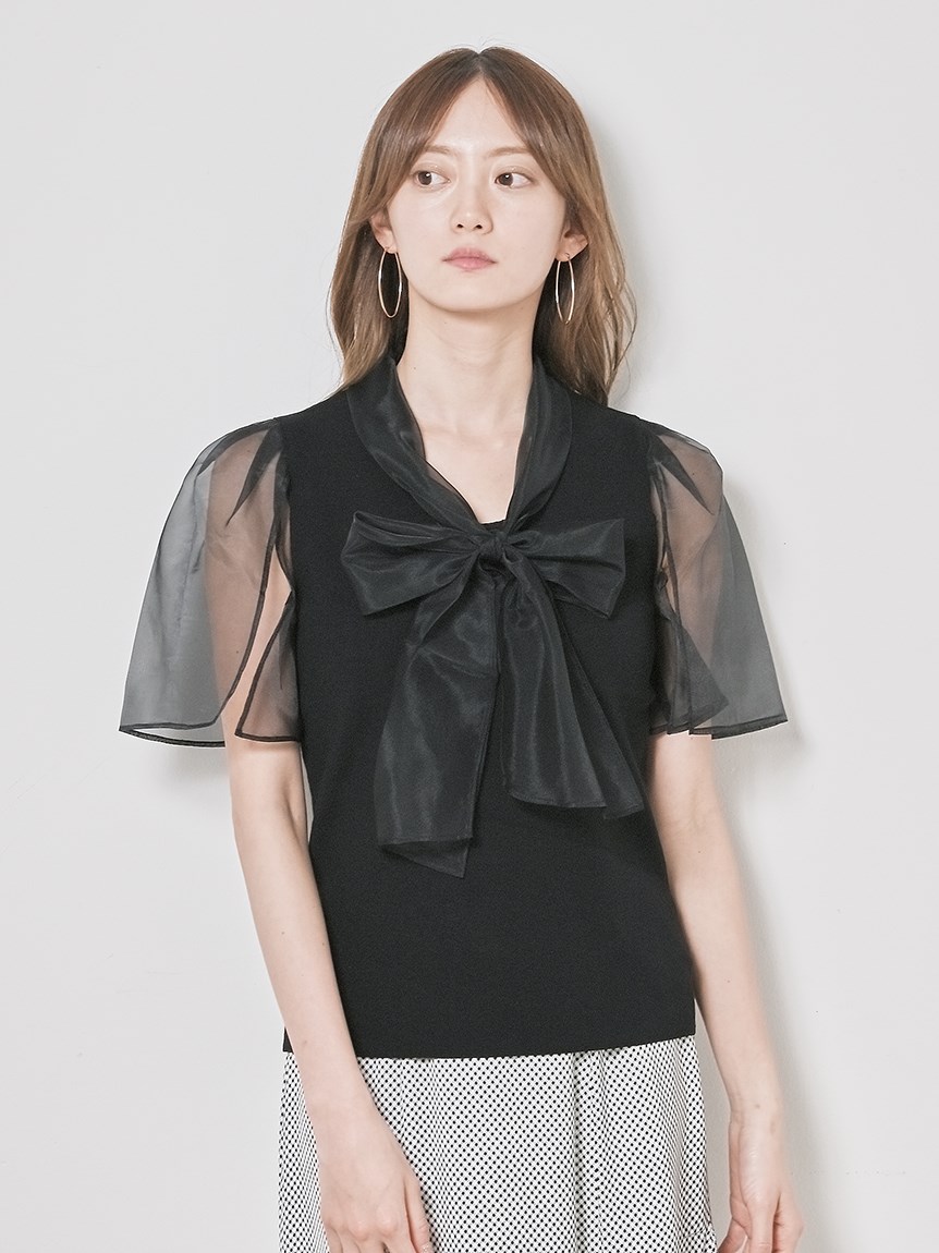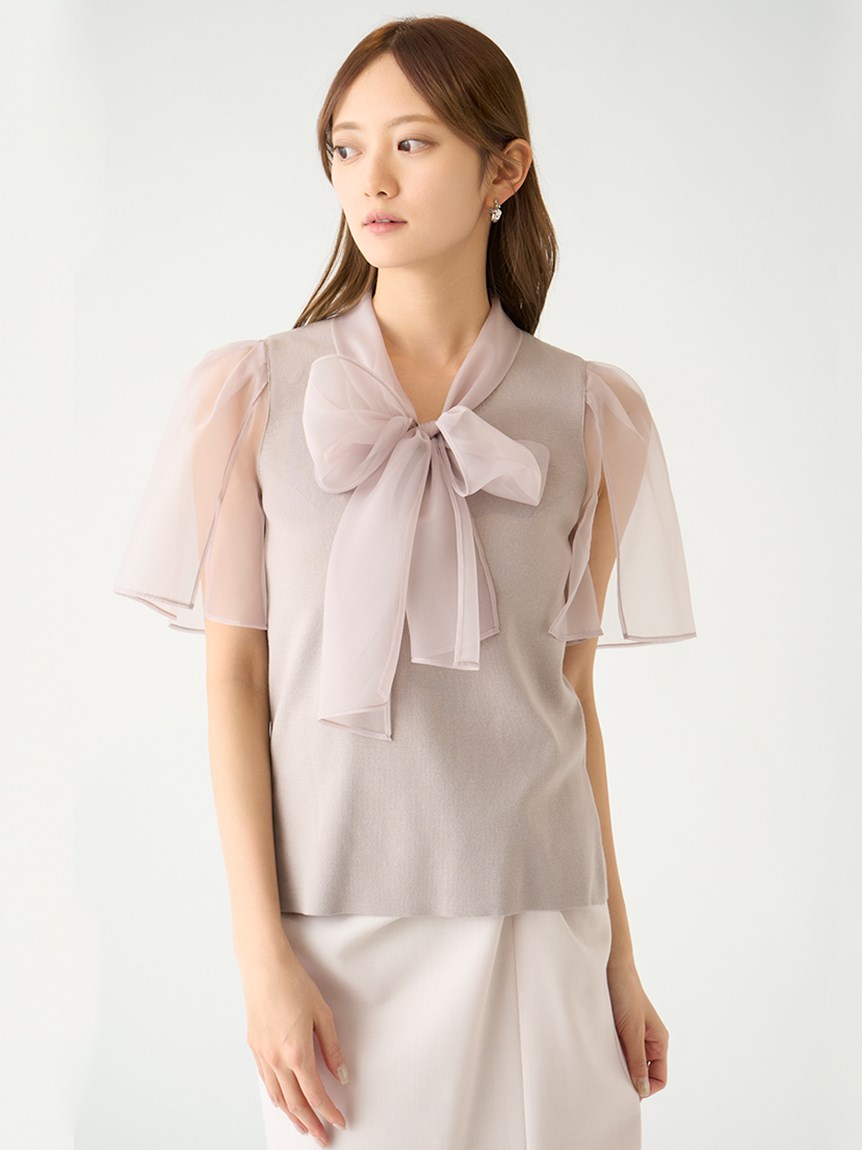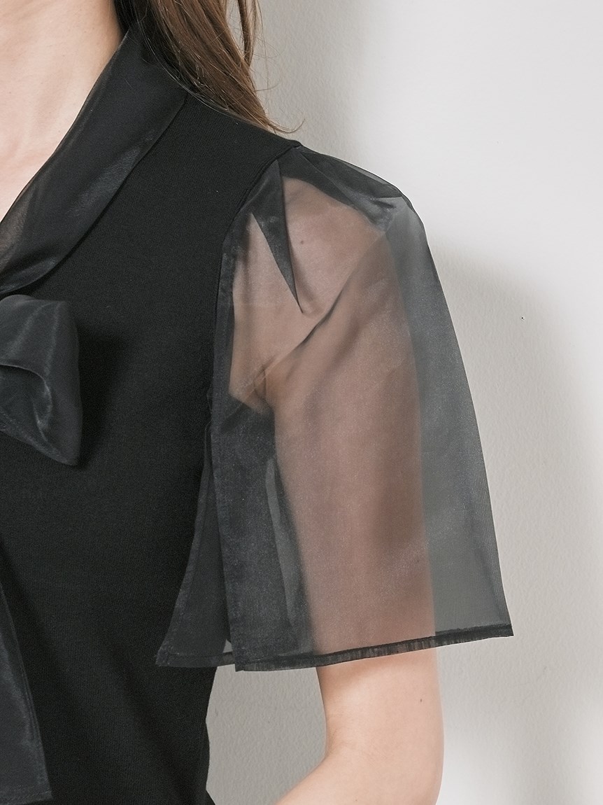 ボウタイと袖部分にシアーな布帛をドッキングした、春らしく軽やかな表情のニットトップス。袖には深くスリットを入れているので適度な肌見せができ、スタイリングに抜け感を与えてくれます。身頃はすっきりとしたタイトシルエットに仕上げスマートな印象に。ボリュームスカートからストレートパンツまで幅広いボトムと合わせやすく、着まわし力も抜群です。