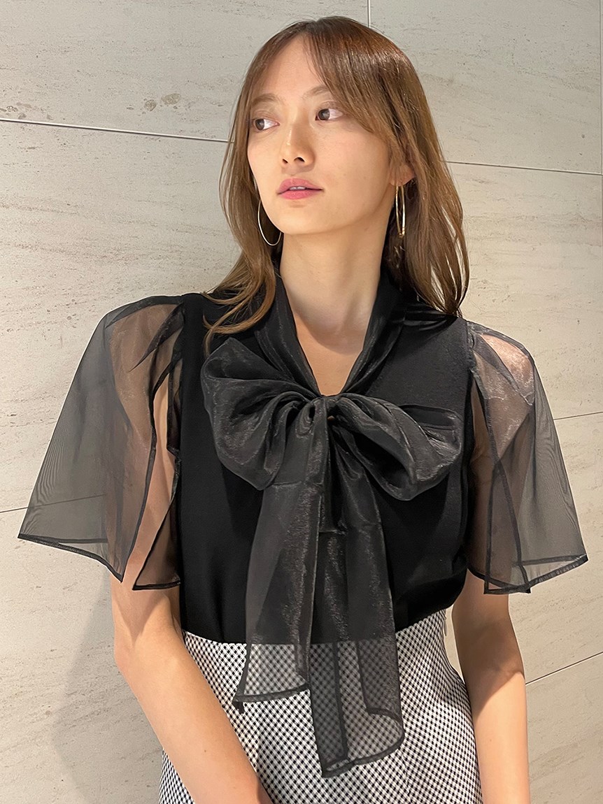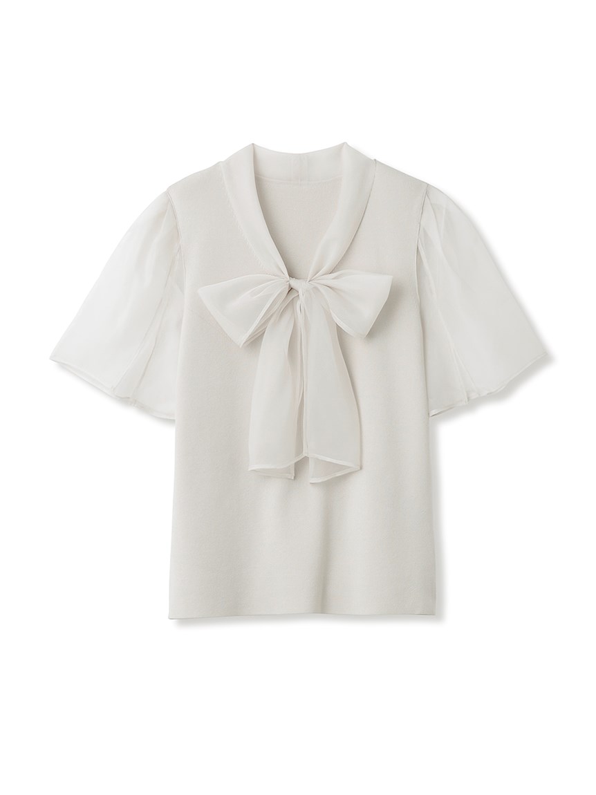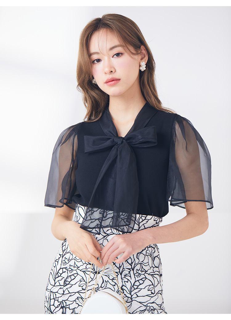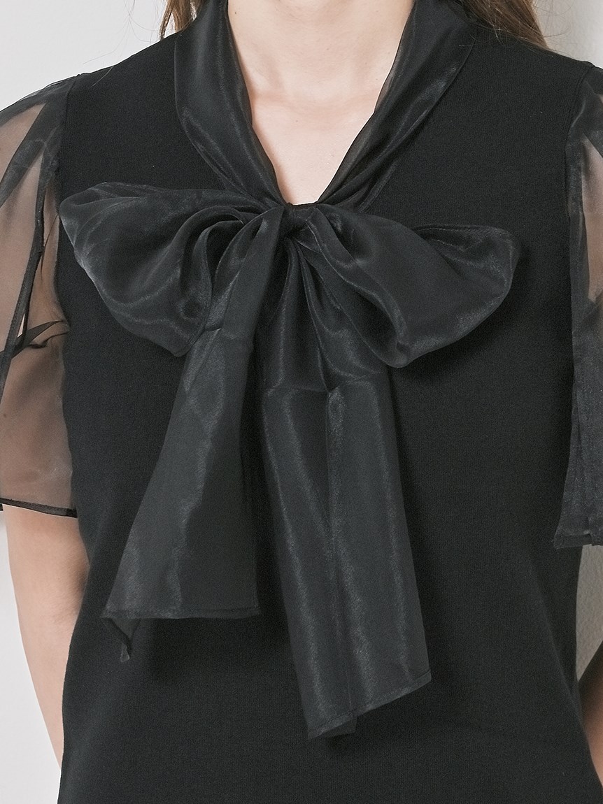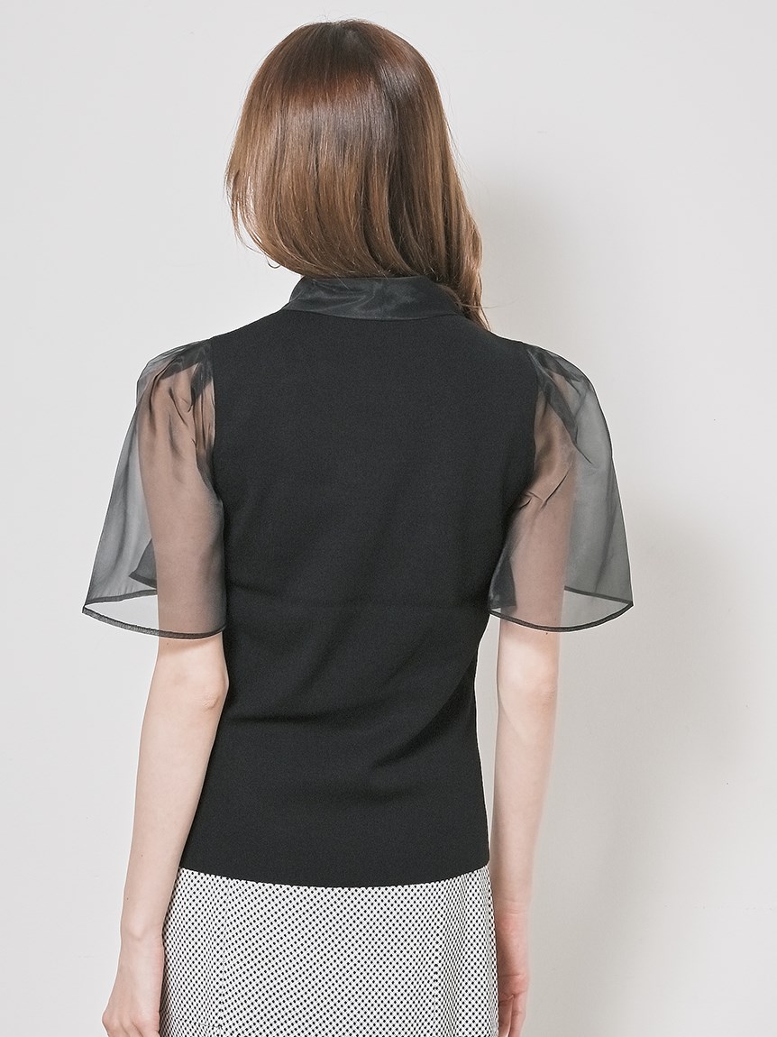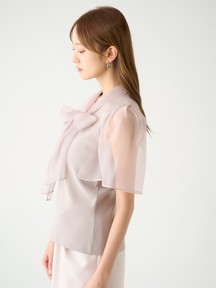ボウタイと袖部分にシアーな布帛をドッキングした、春らしく軽やかな表情のニットトップス。袖には深くスリットを入れているので適度な肌見せができ、スタイリングに抜け感を与えてくれます。身頃はすっきりとしたタイトシルエットに仕上げスマートな印象に。ボリュームスカートからストレートパンツまで幅広いボトムと合わせやすく、着まわし力も抜群です。