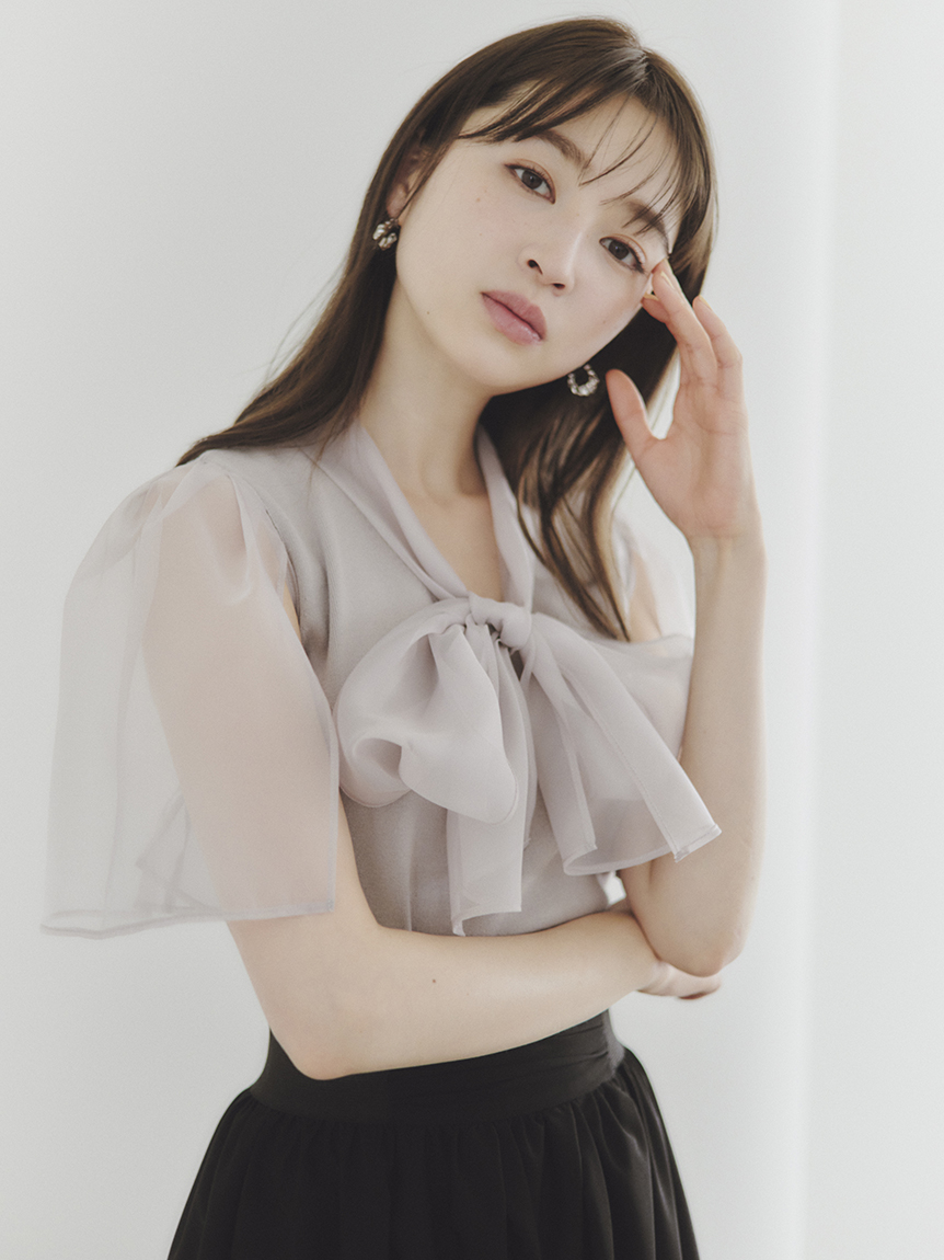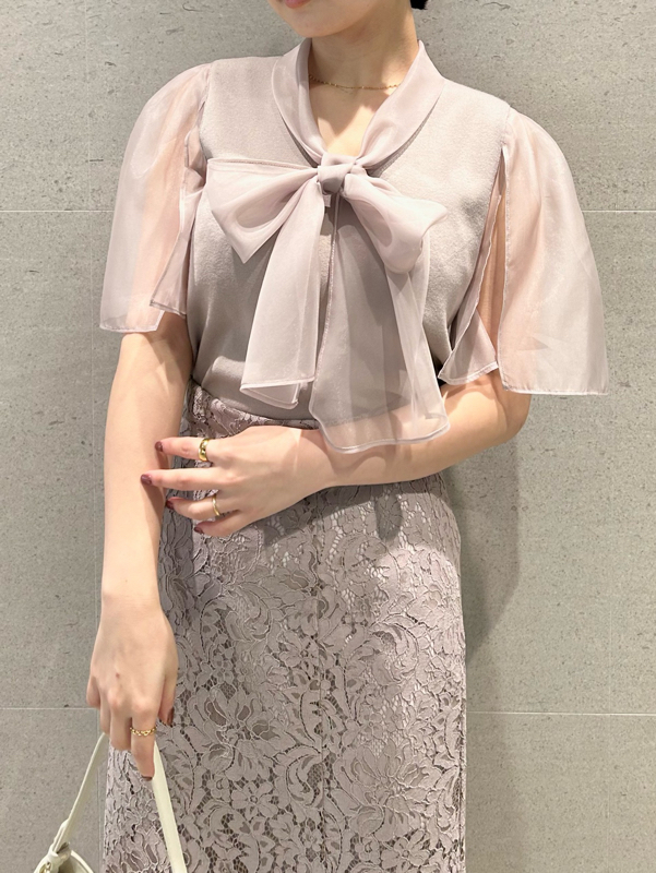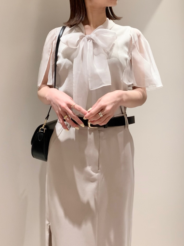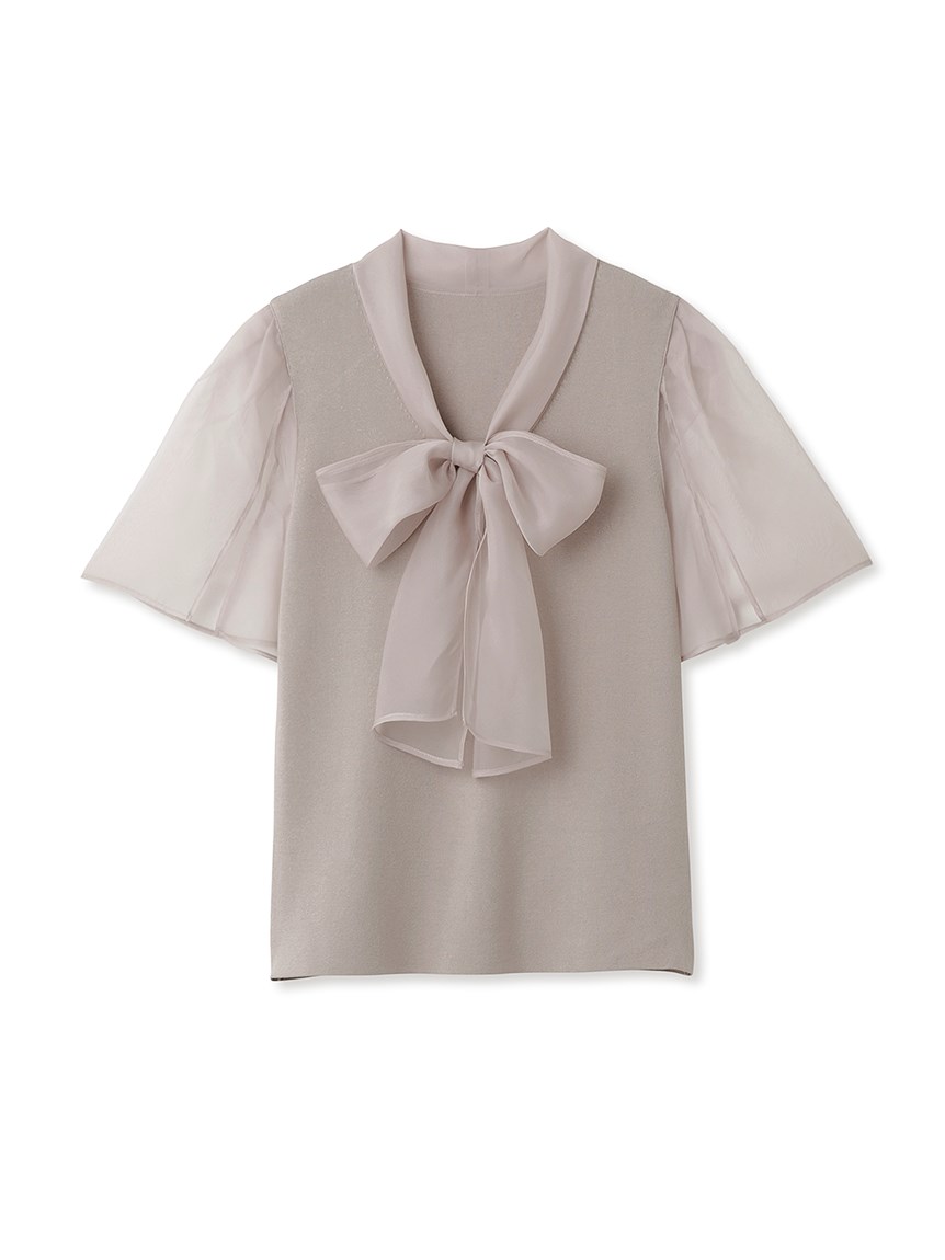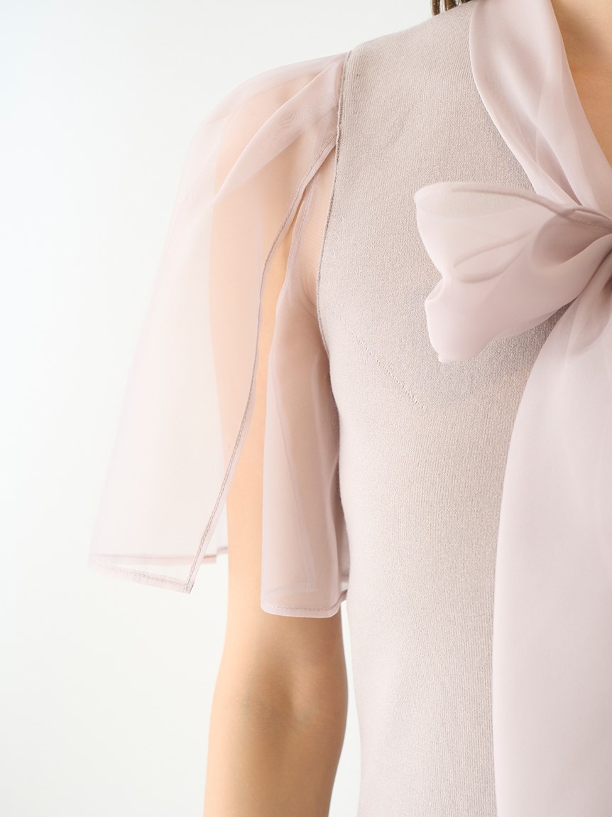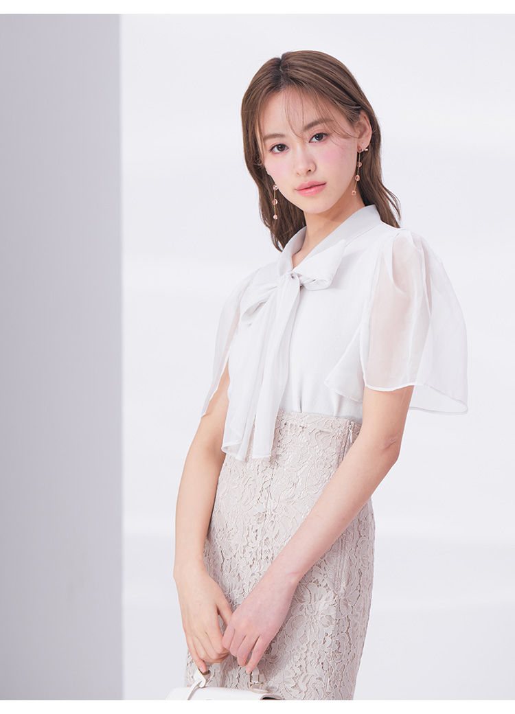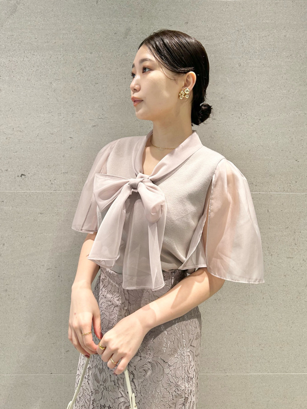 ボウタイと袖部分にシアーな布帛をドッキングした、春らしく軽やかな表情のニットトップス。袖には深くスリットを入れているので適度な肌見せができ、スタイリングに抜け感を与えてくれます。身頃はすっきりとしたタイトシルエットに仕上げスマートな印象に。ボリュームスカートからストレートパンツまで幅広いボトムと合わせやすく、着まわし力も抜群です。