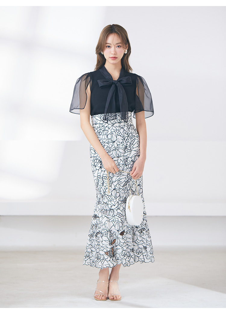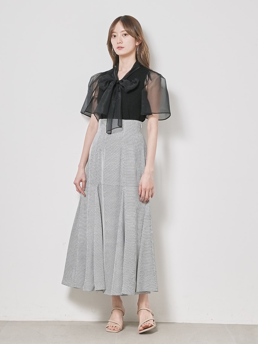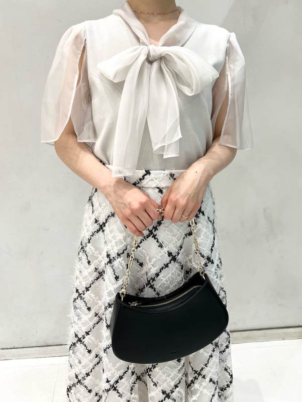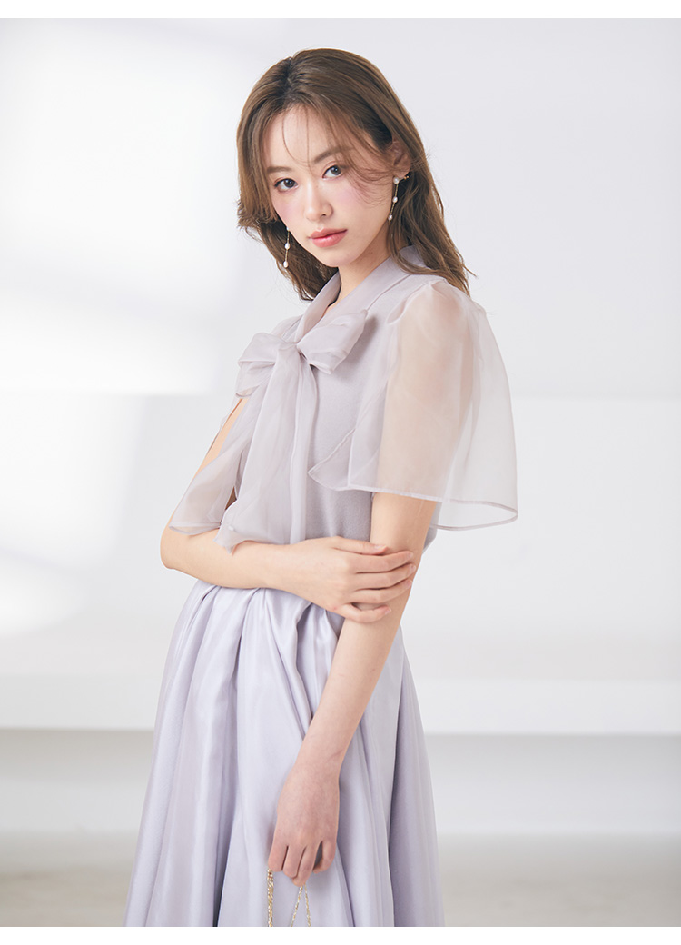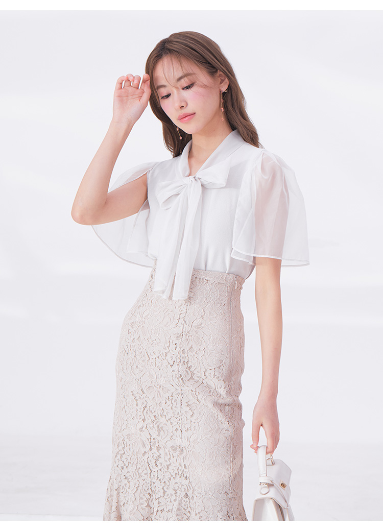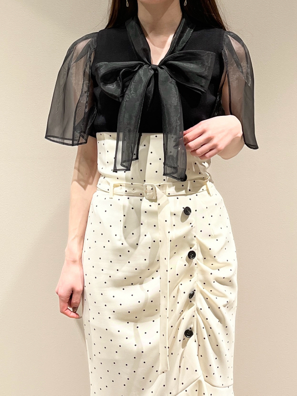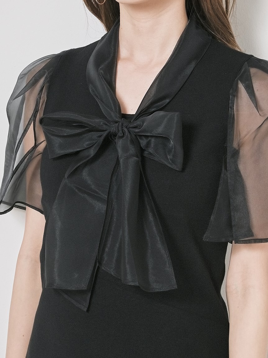 ボウタイと袖部分にシアーな布帛をドッキングした、春らしく軽やかな表情のニットトップス。袖には深くスリットを入れているので適度な肌見せができ、スタイリングに抜け感を与えてくれます。身頃はすっきりとしたタイトシルエットに仕上げスマートな印象に。ボリュームスカートからストレートパンツまで幅広いボトムと合わせやすく、着まわし力も抜群です。