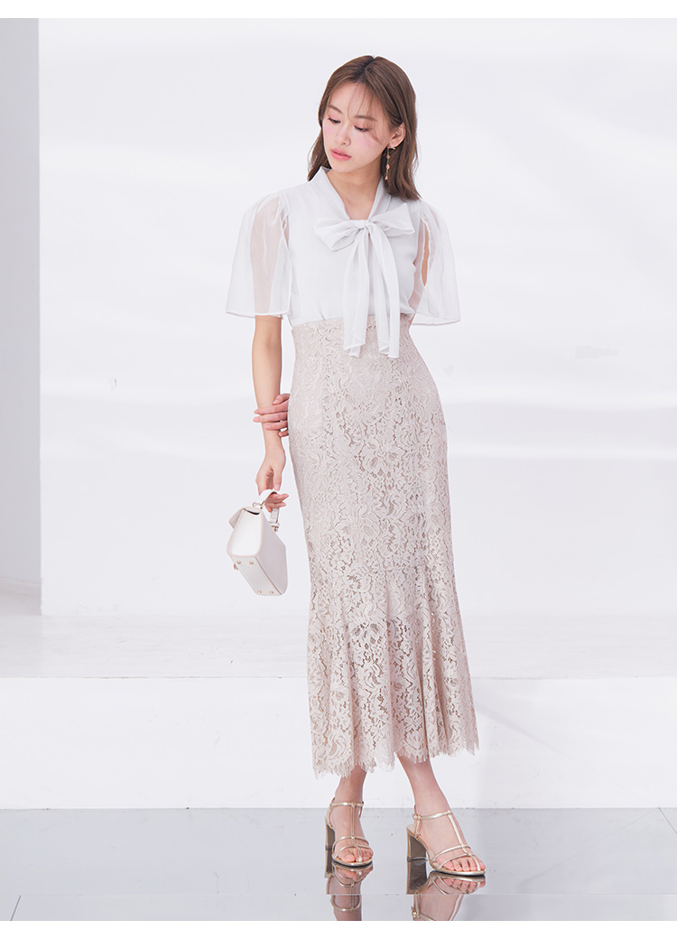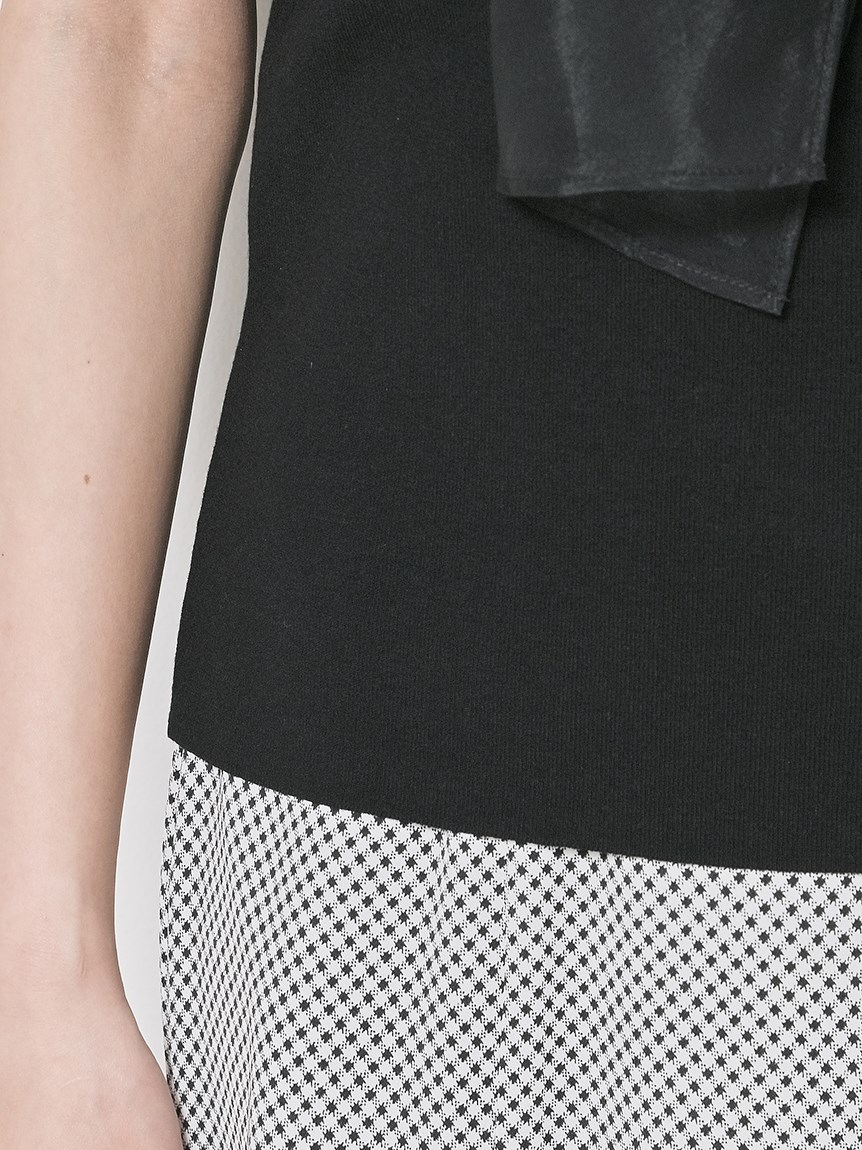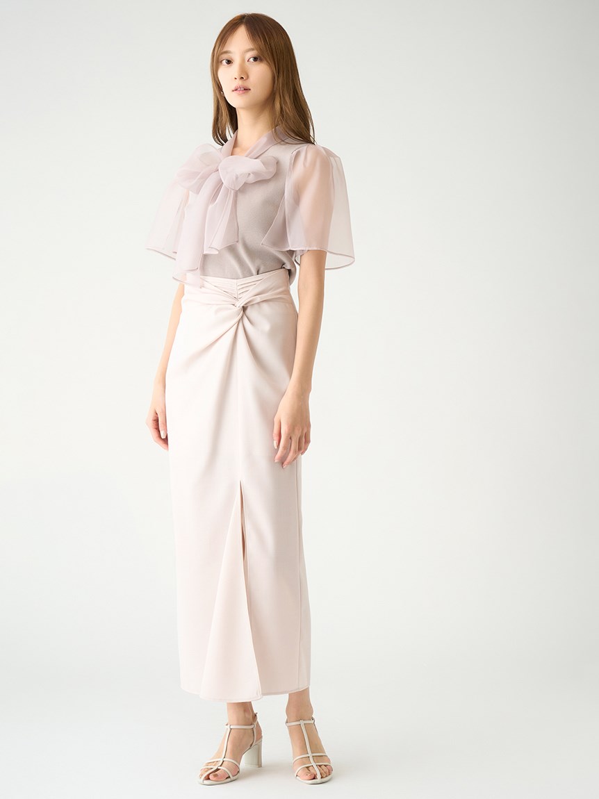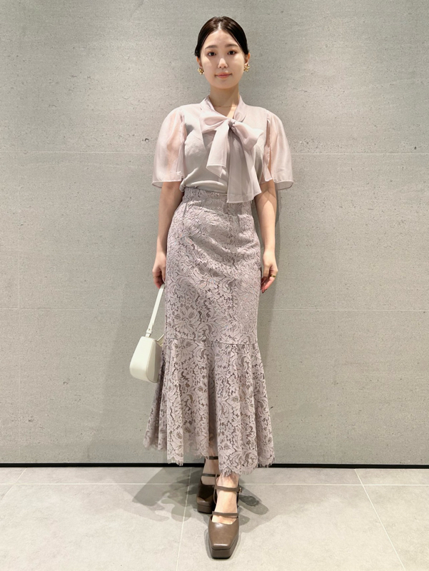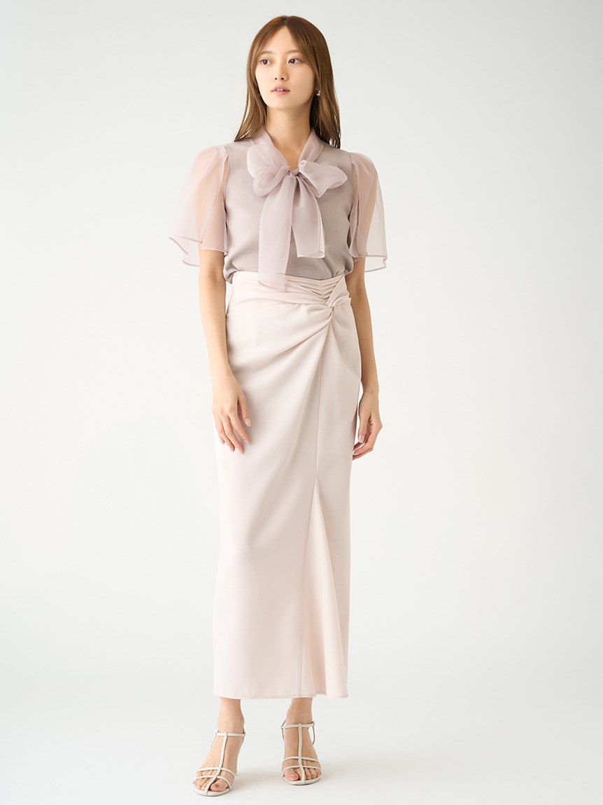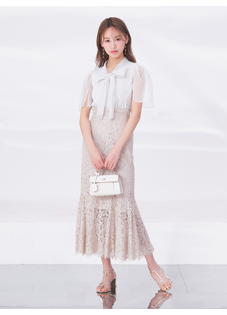 ボウタイと袖部分にシアーな布帛をドッキングした、春らしく軽やかな表情のニットトップス。袖には深くスリットを入れているので適度な肌見せができ、スタイリングに抜け感を与えてくれます。身頃はすっきりとしたタイトシルエットに仕上げスマートな印象に。ボリュームスカートからストレートパンツまで幅広いボトムと合わせやすく、着まわし力も抜群です。