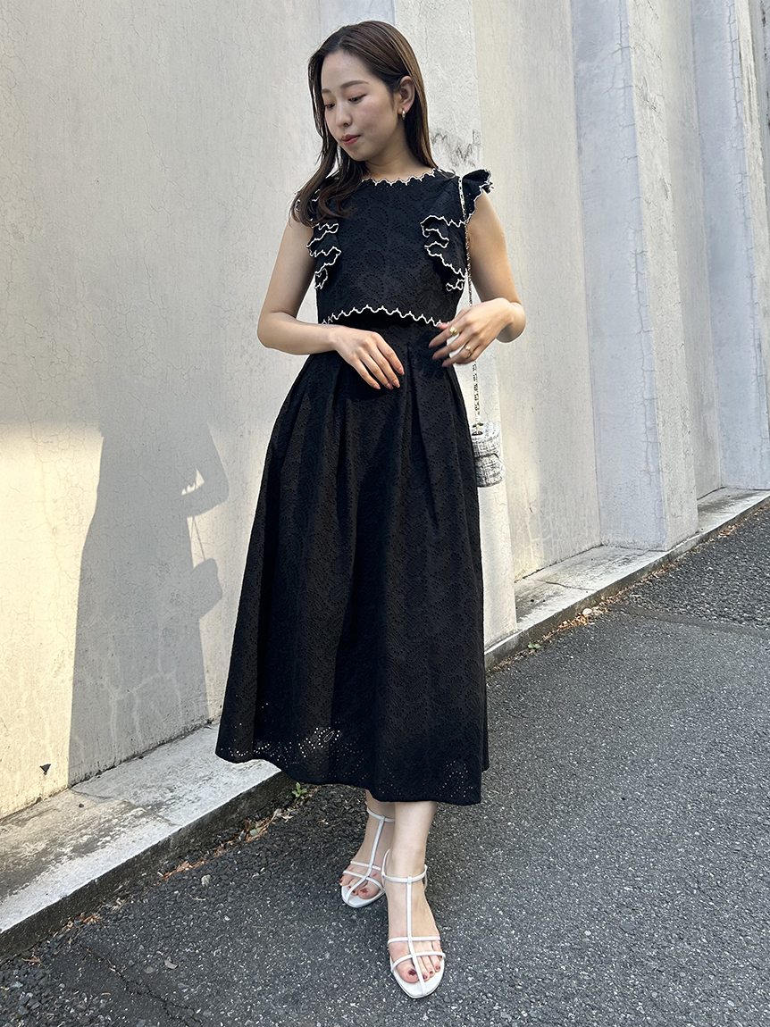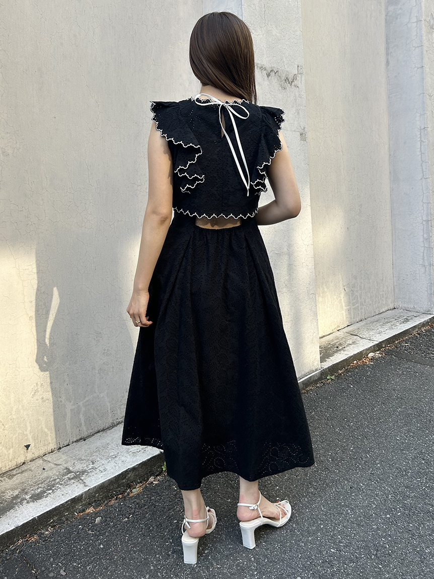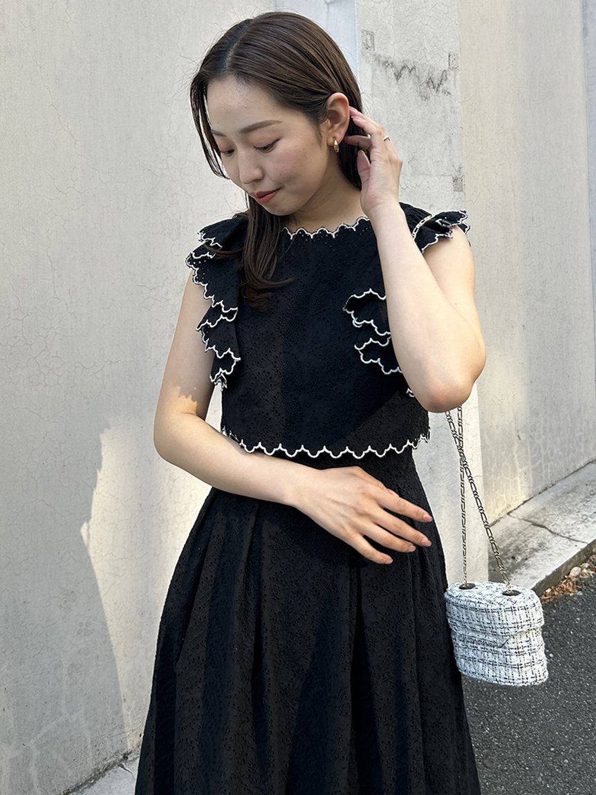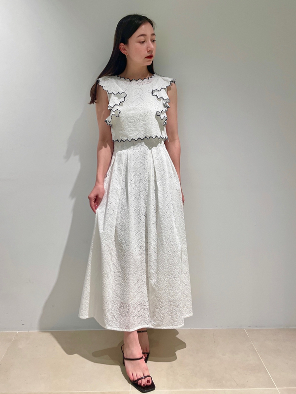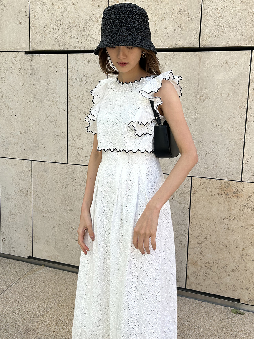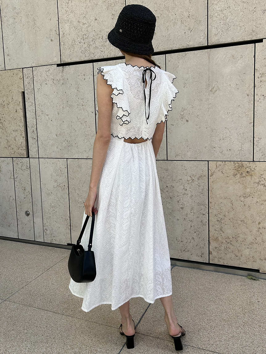季節感漂うカットワークレースワンピースがWEB限定で登場!サイドを飾る大きなフリルが周囲の目を引くポイントに。バックスタイルは今季らしく、程よい肌見せの叶うデザインに仕上げました。スタイルが良く見えるようトップス部分をクロップド丈にし、スタイルアップを叶えました。