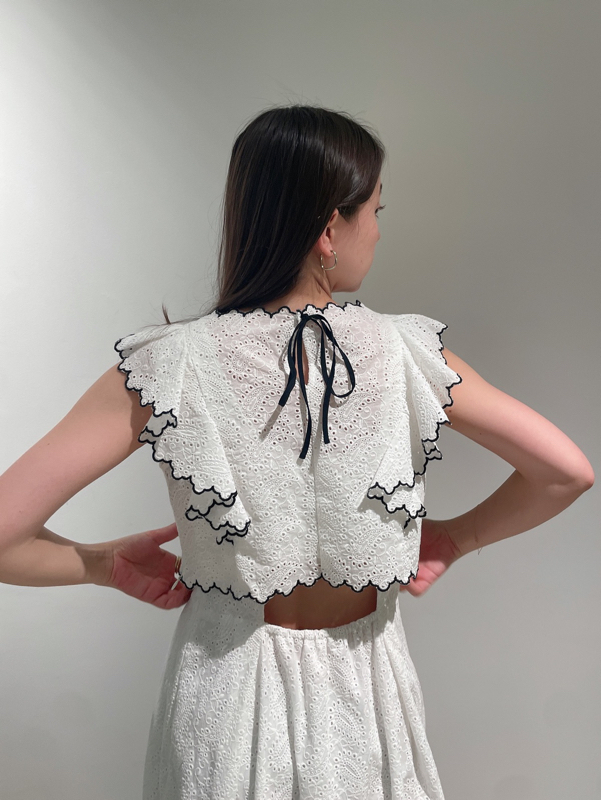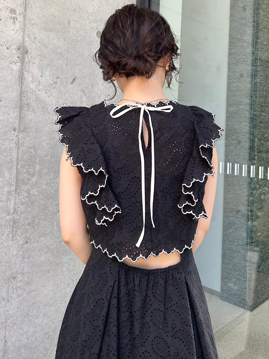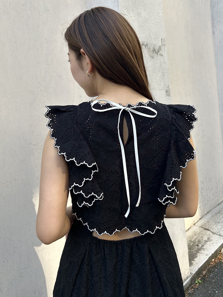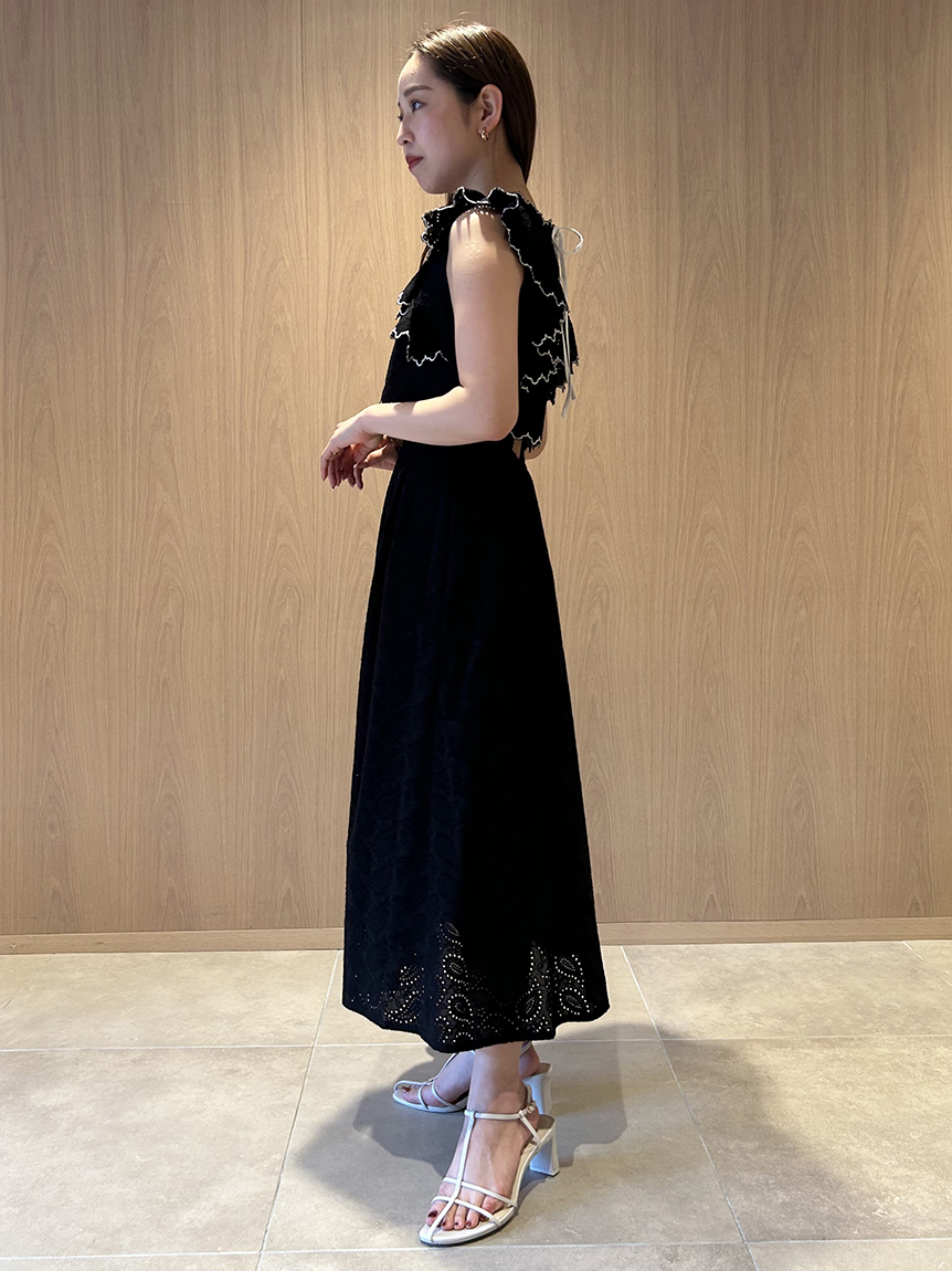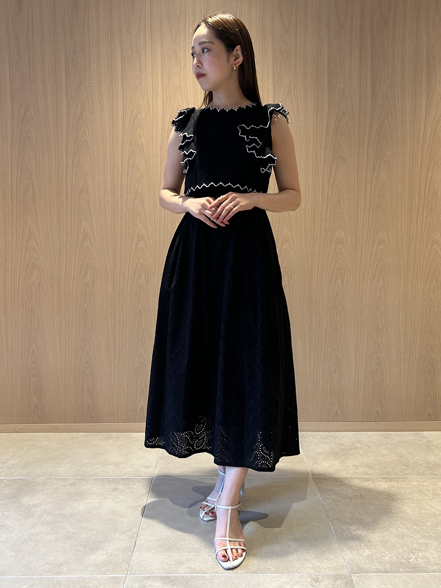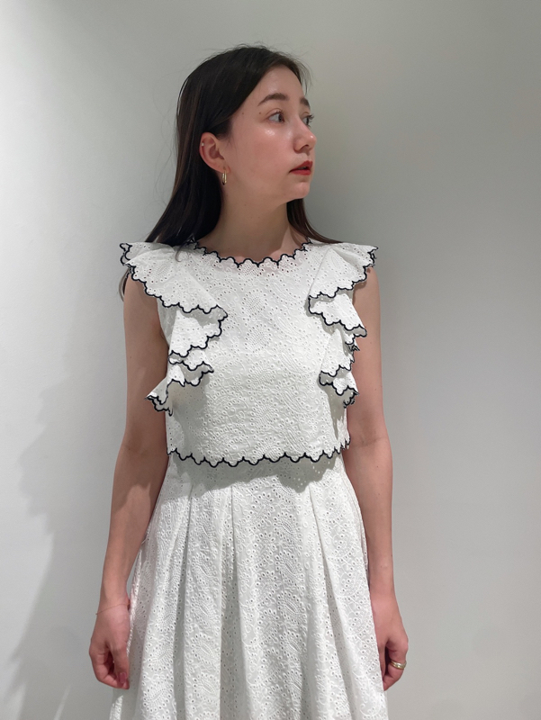 季節感漂うカットワークレースワンピースがWEB限定で登場!サイドを飾る大きなフリルが周囲の目を引くポイントに。バックスタイルは今季らしく、程よい肌見せの叶うデザインに仕上げました。スタイルが良く見えるようトップス部分をクロップド丈にし、スタイルアップを叶えました。