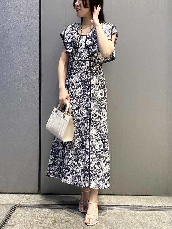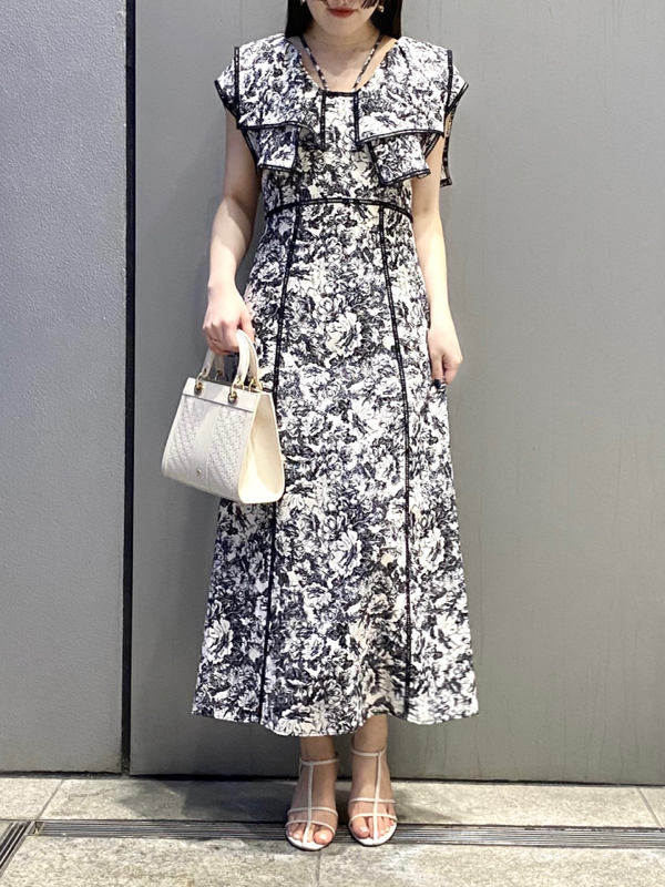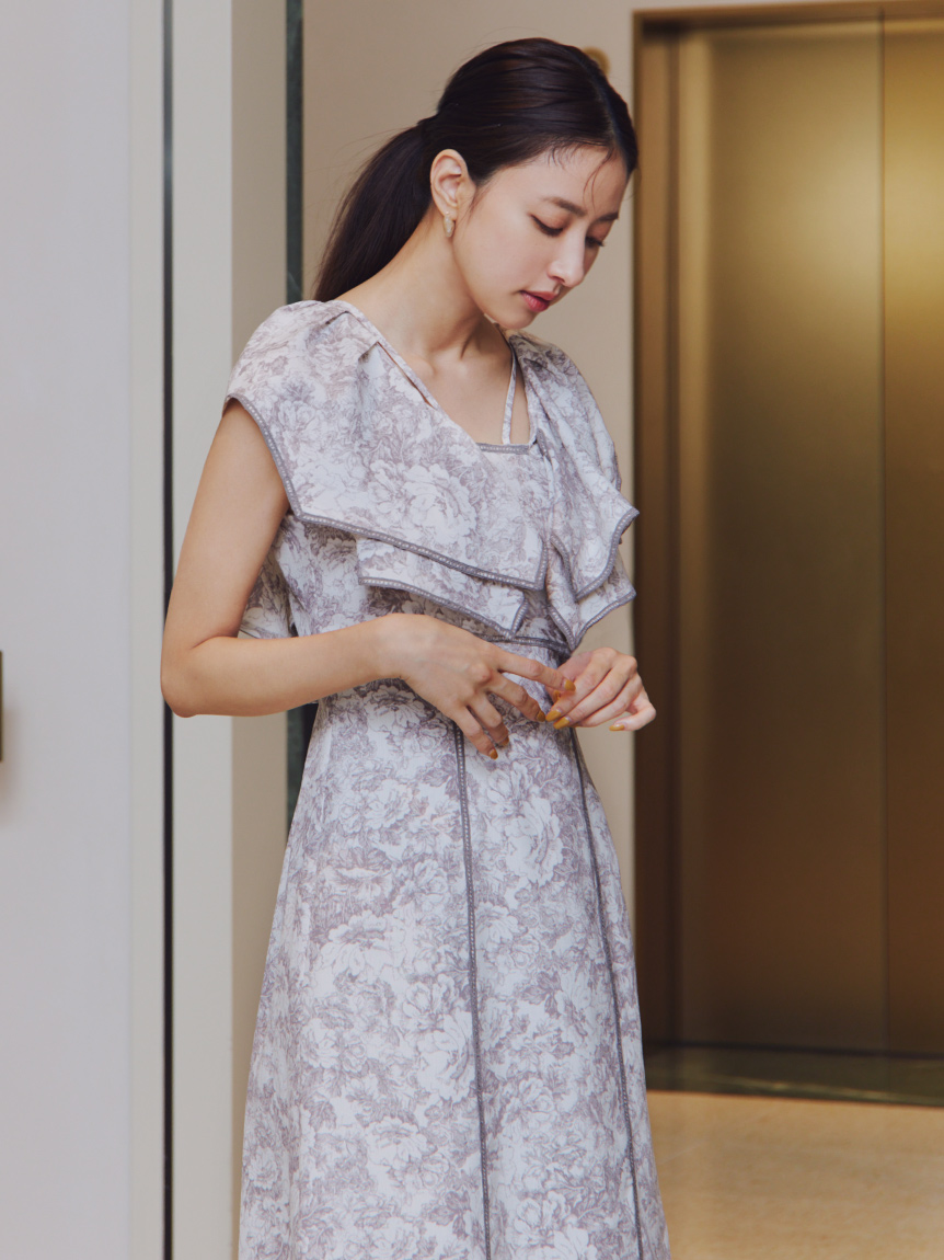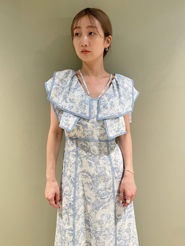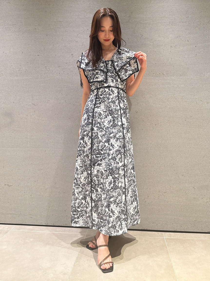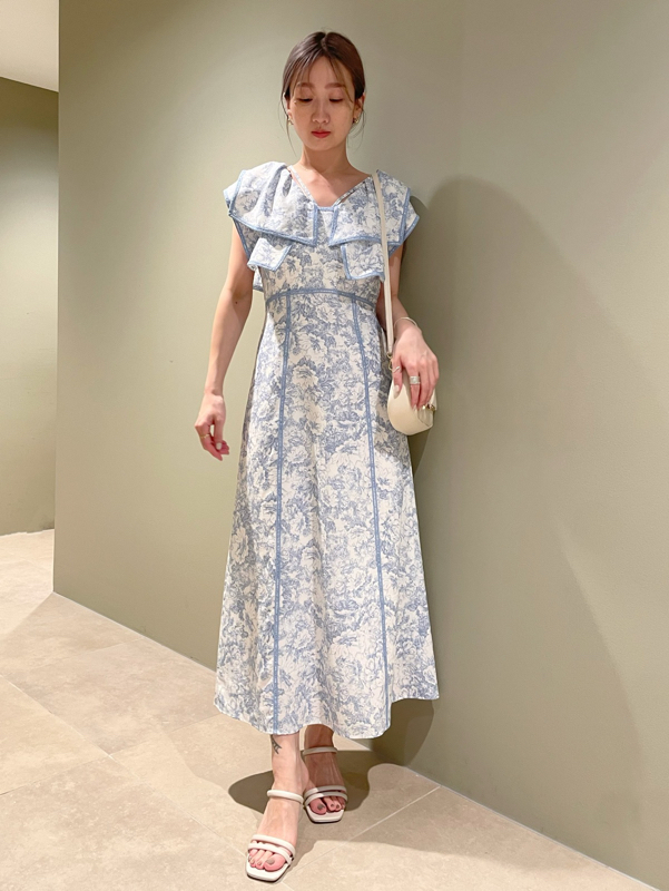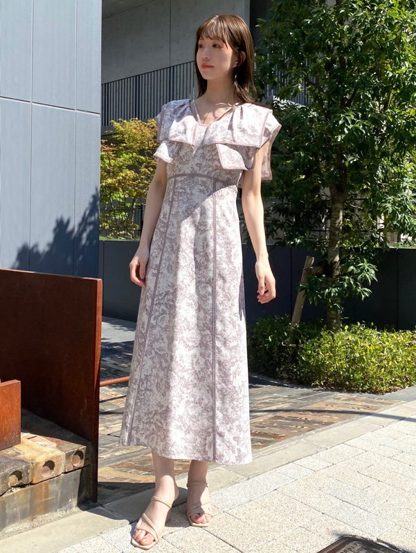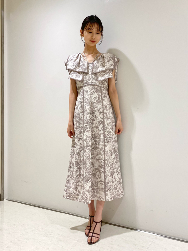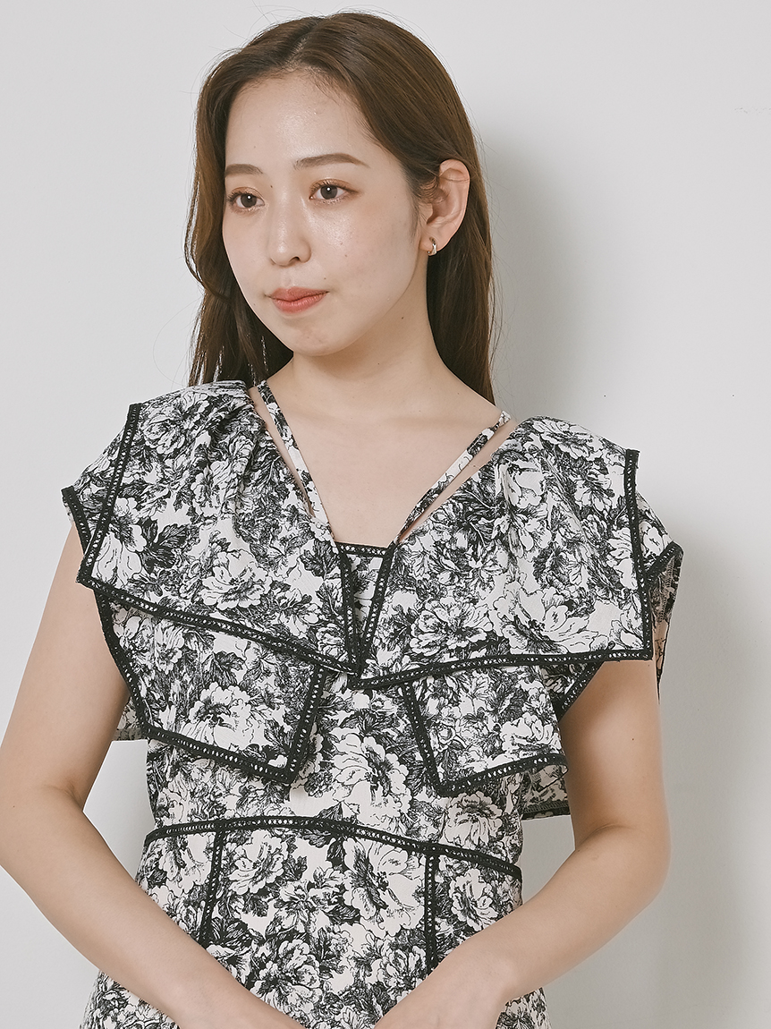 人気のラッフルカラーワンピースがアップグレードして登場。フリルのバランスは今季らしく、更にレースのパイピングや大胆な花柄で華やかに仕上げました。袖は横から腕が見える幅を少し狭くしたことで、気になるパーツをカバー。ハイウエストの切り替えから裾に向かって緩やかに広がるAラインシルエットで、スタイルアップ効果は抜群です。