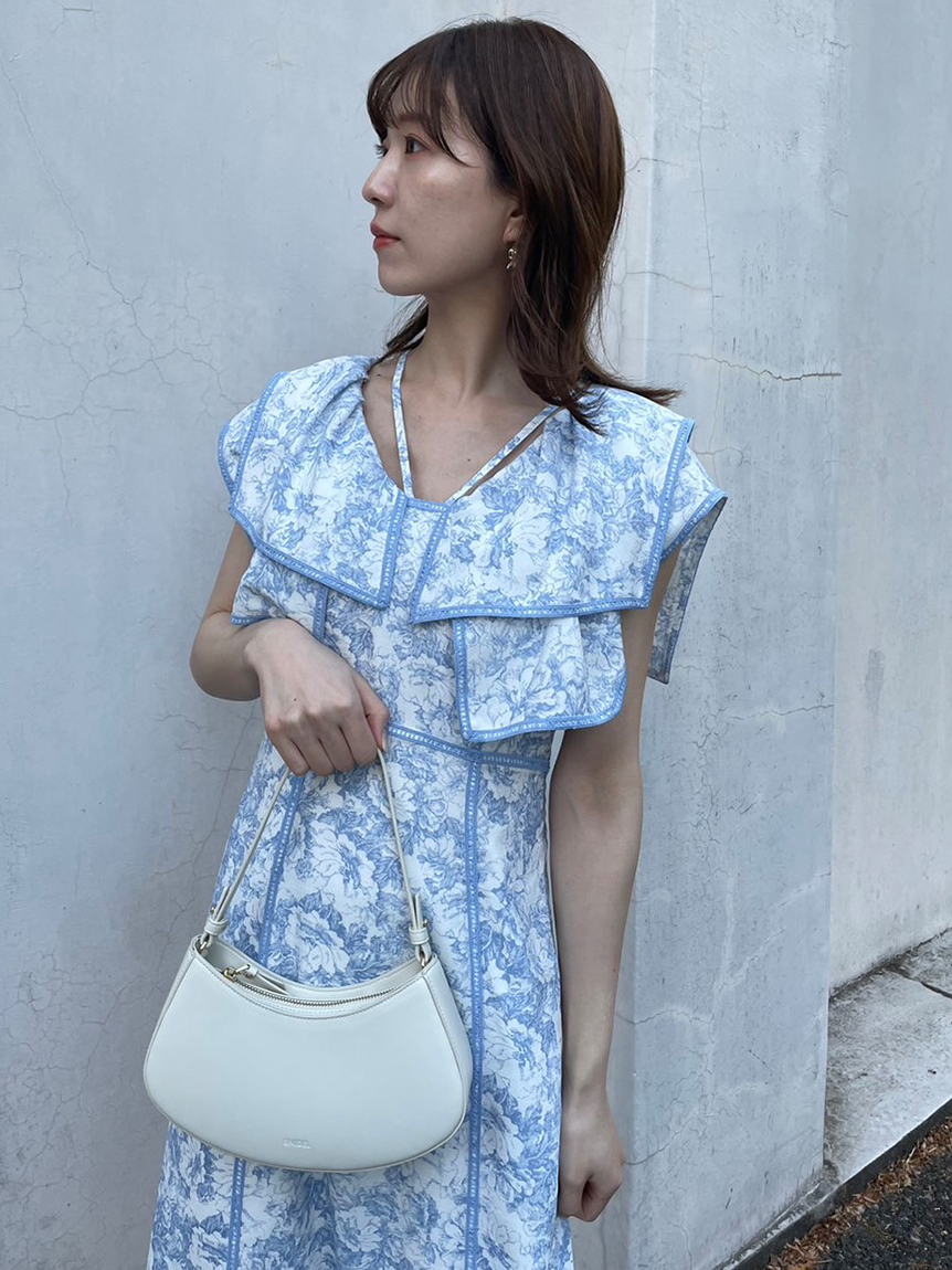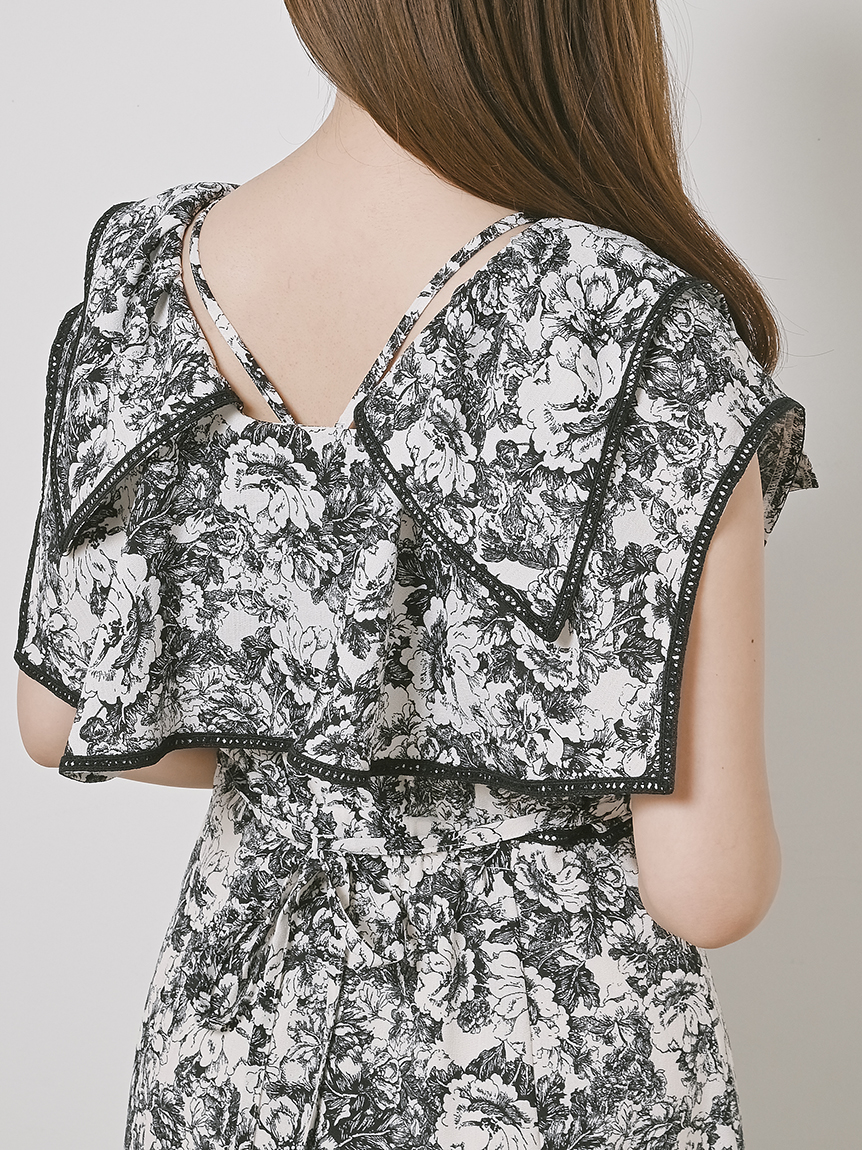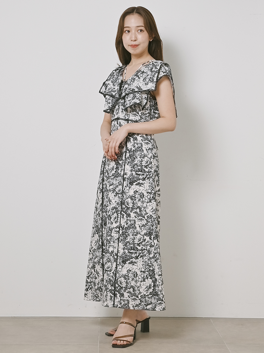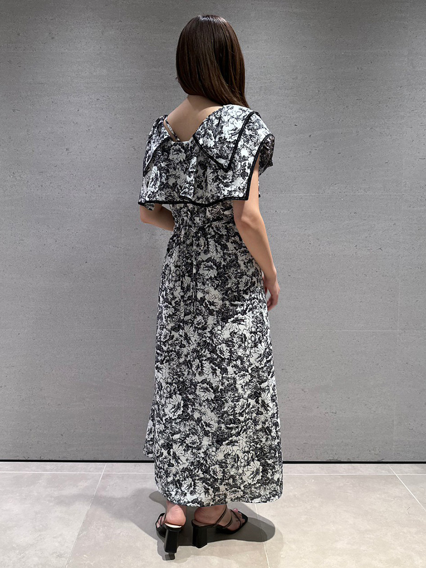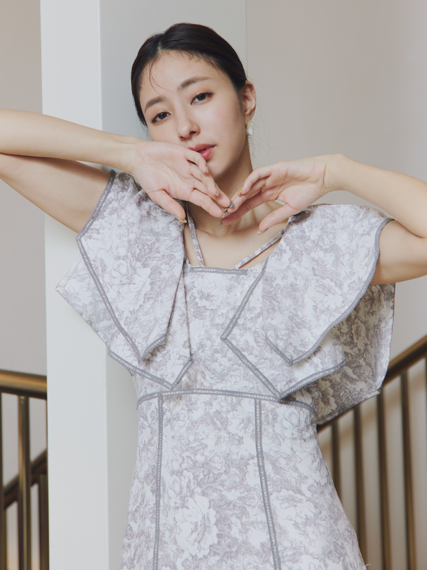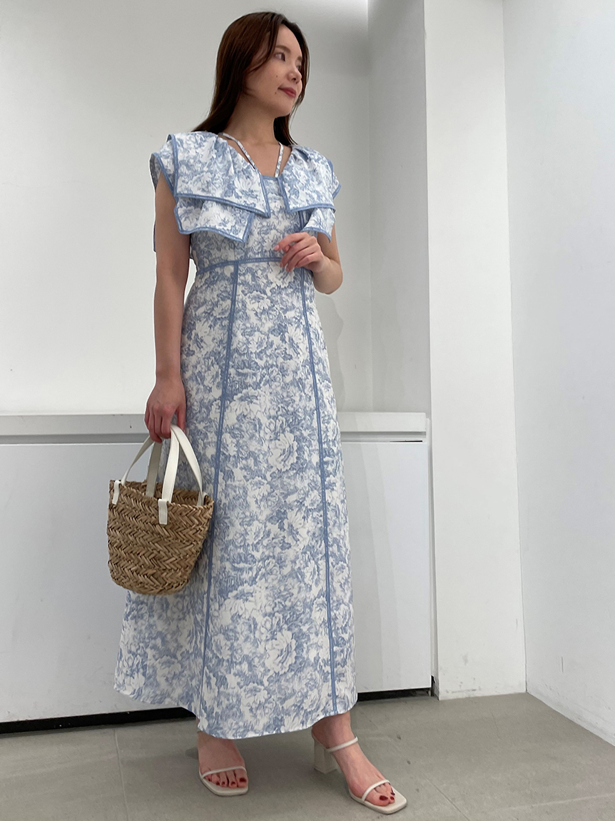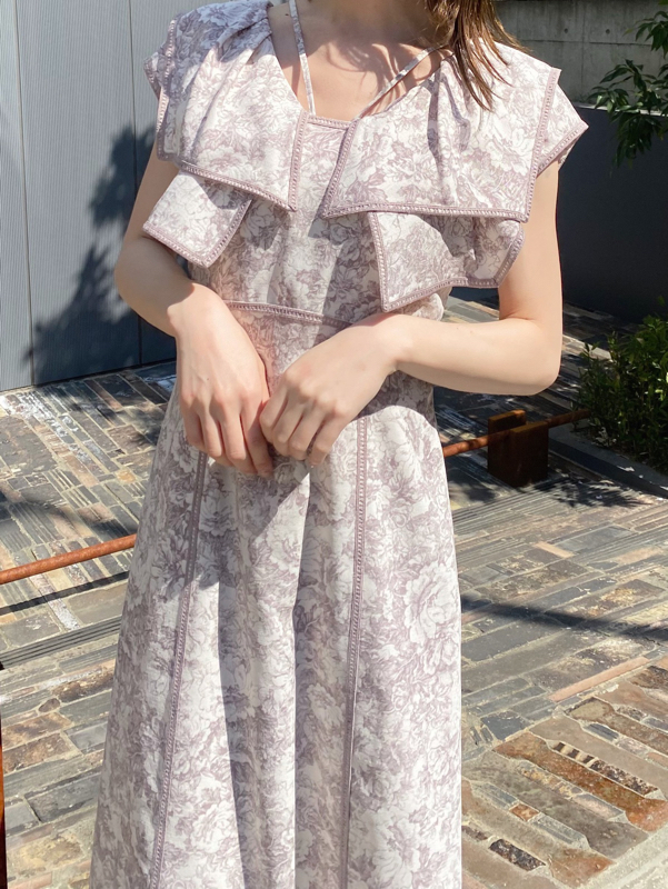 人気のラッフルカラーワンピースがアップグレードして登場。フリルのバランスは今季らしく、更にレースのパイピングや大胆な花柄で華やかに仕上げました。袖は横から腕が見える幅を少し狭くしたことで、気になるパーツをカバー。ハイウエストの切り替えから裾に向かって緩やかに広がるAラインシルエットで、スタイルアップ効果は抜群です。