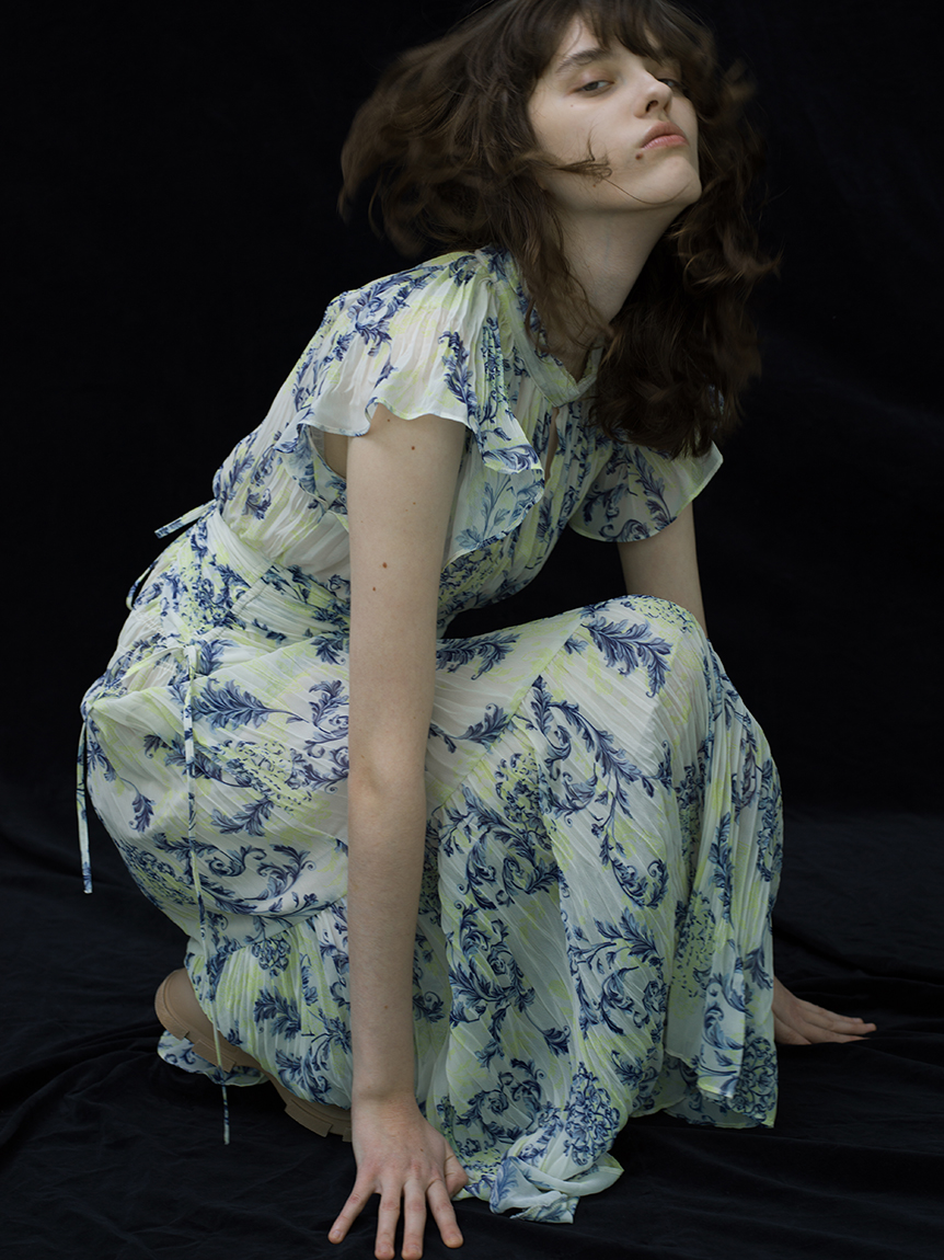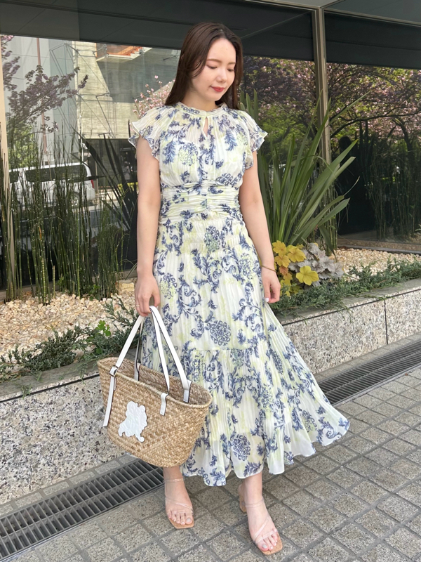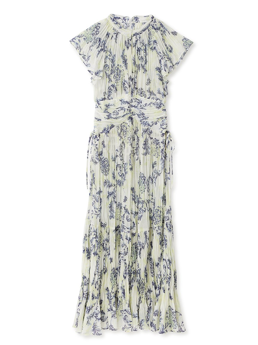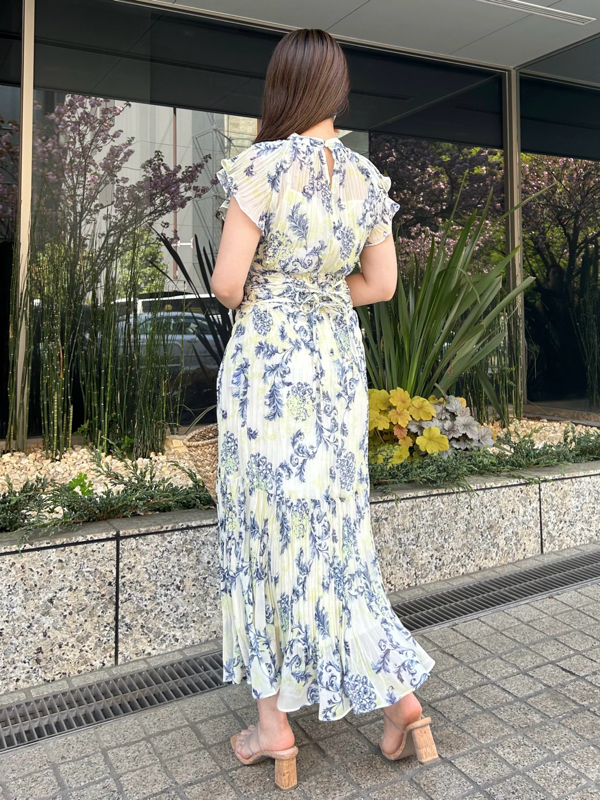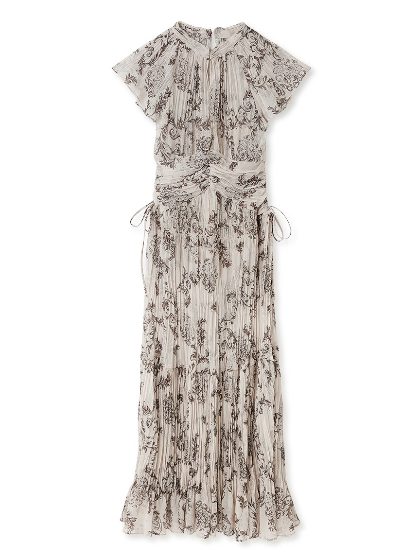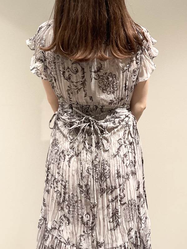 オリジナルのオーナメントプリントを浮かべた、春ムード薫るワンピース。全体にプリーツをふんだんに施すことで華やかさが高まり、主役級の存在感を放つ1着です。ウエスト部分にコルセットのような切り替えを入れ、スタイルアップ効果の高いメリハリシルエットに。バックウエストのレースアップで絞り方を調節でき、シルエットの変化も楽しめます。