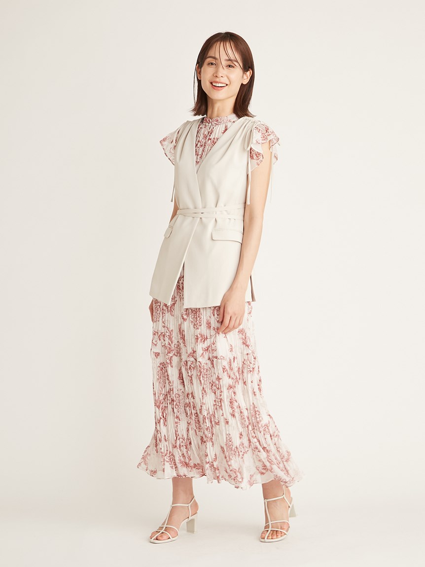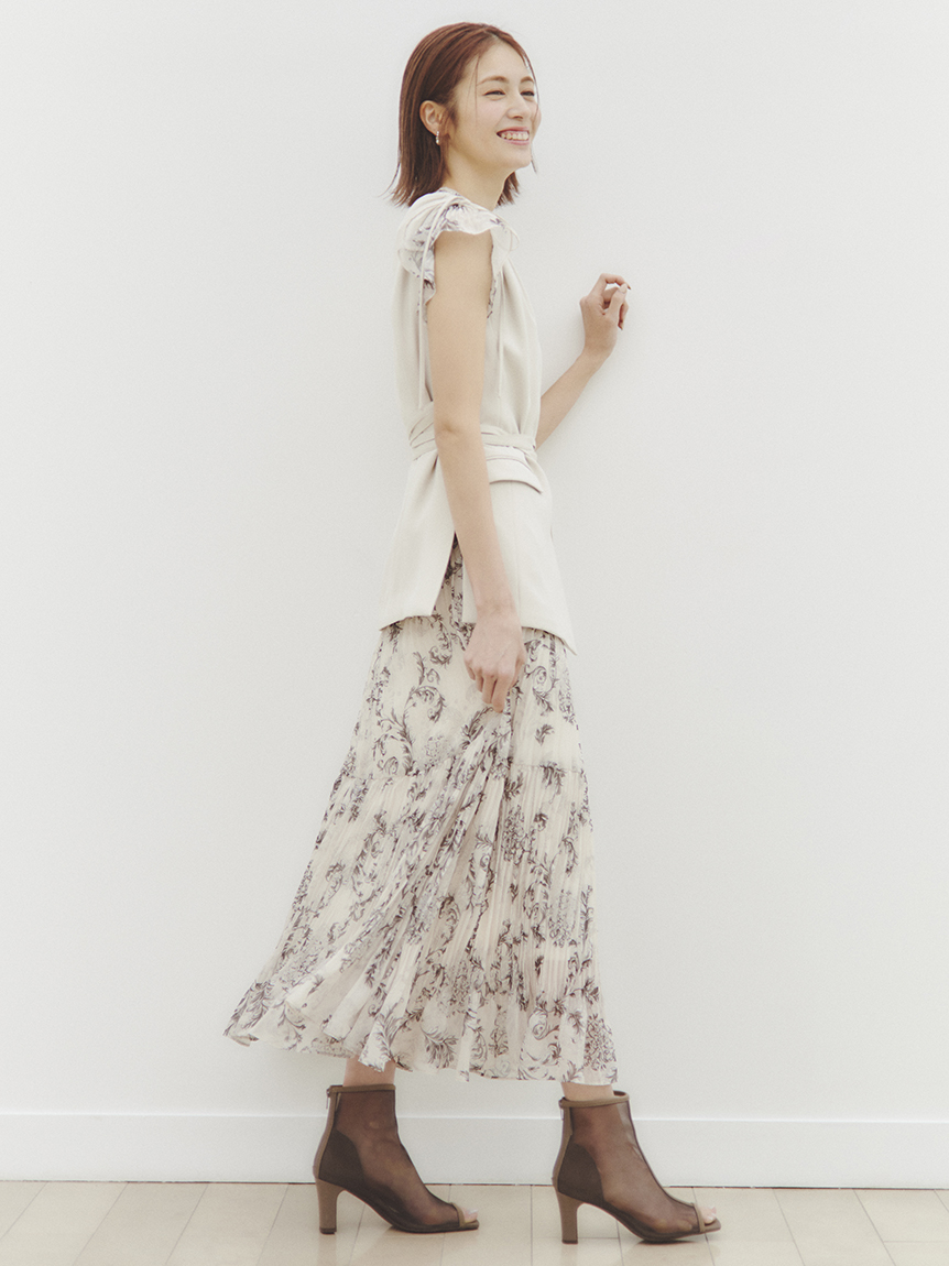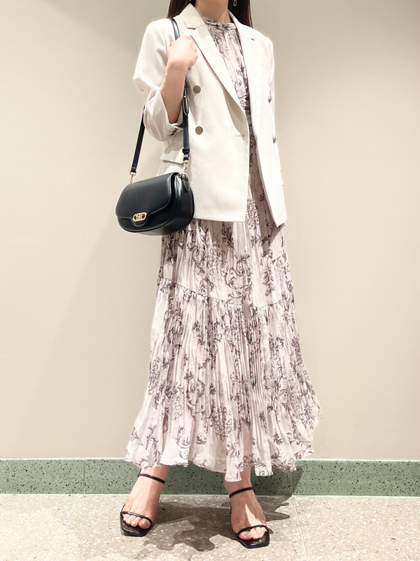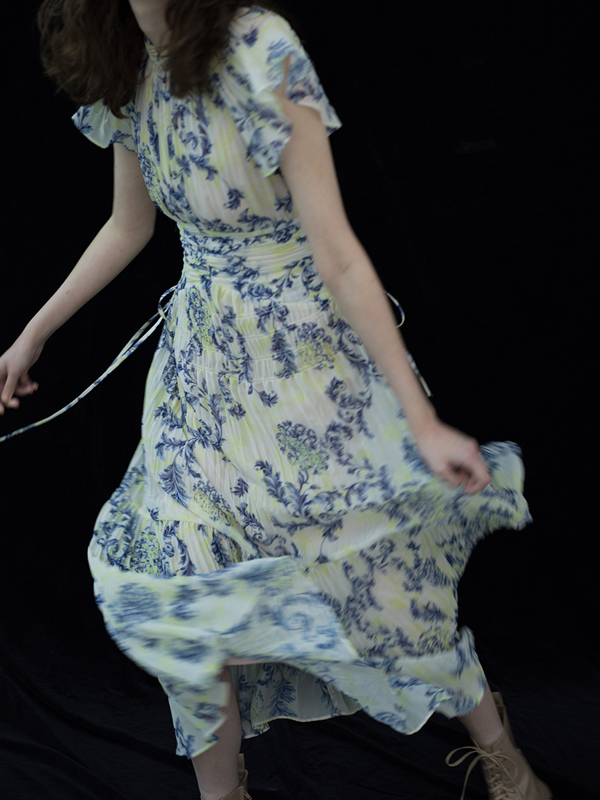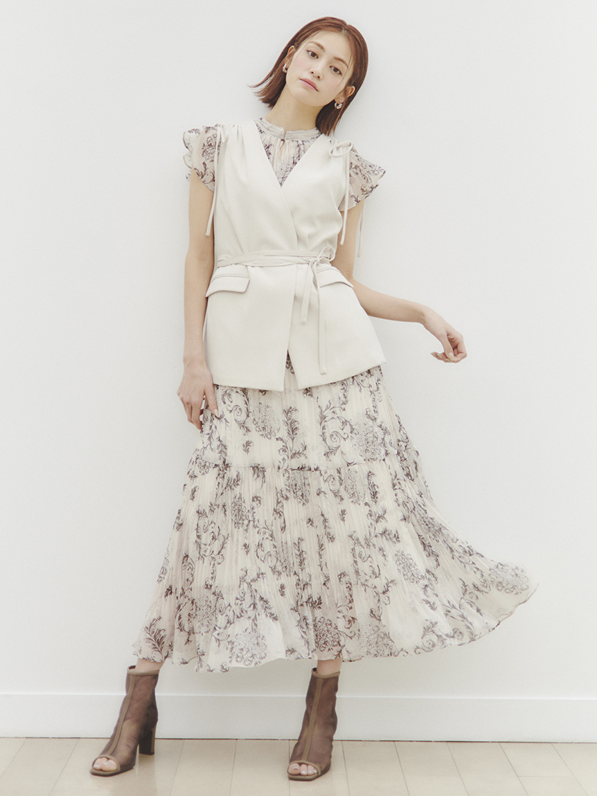 オリジナルのオーナメントプリントを浮かべた、春ムード薫るワンピース。全体にプリーツをふんだんに施すことで華やかさが高まり、主役級の存在感を放つ1着です。ウエスト部分にコルセットのような切り替えを入れ、スタイルアップ効果の高いメリハリシルエットに。バックウエストのレースアップで絞り方を調節でき、シルエットの変化も楽しめます。