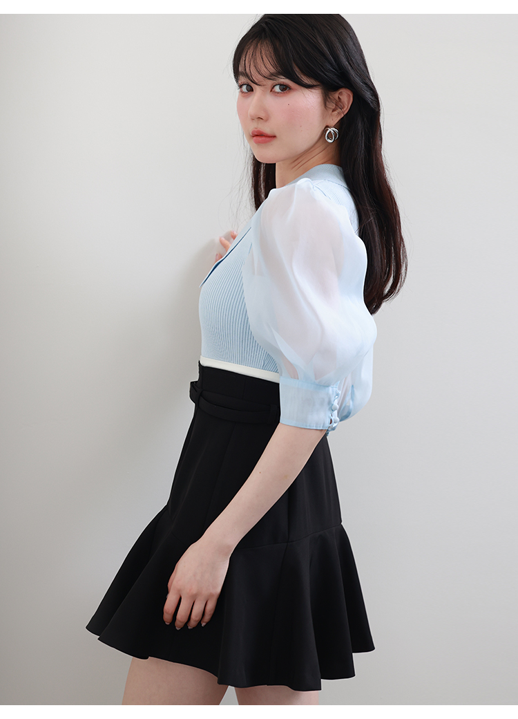 エコレーヨンを用いたサステナブルなニットとシアー素材を組み合わせました。優しい色合いのアイボリー、バイカラーでモード感のあるブラック、春夏らしい爽やかなサックスの3色をご用意。