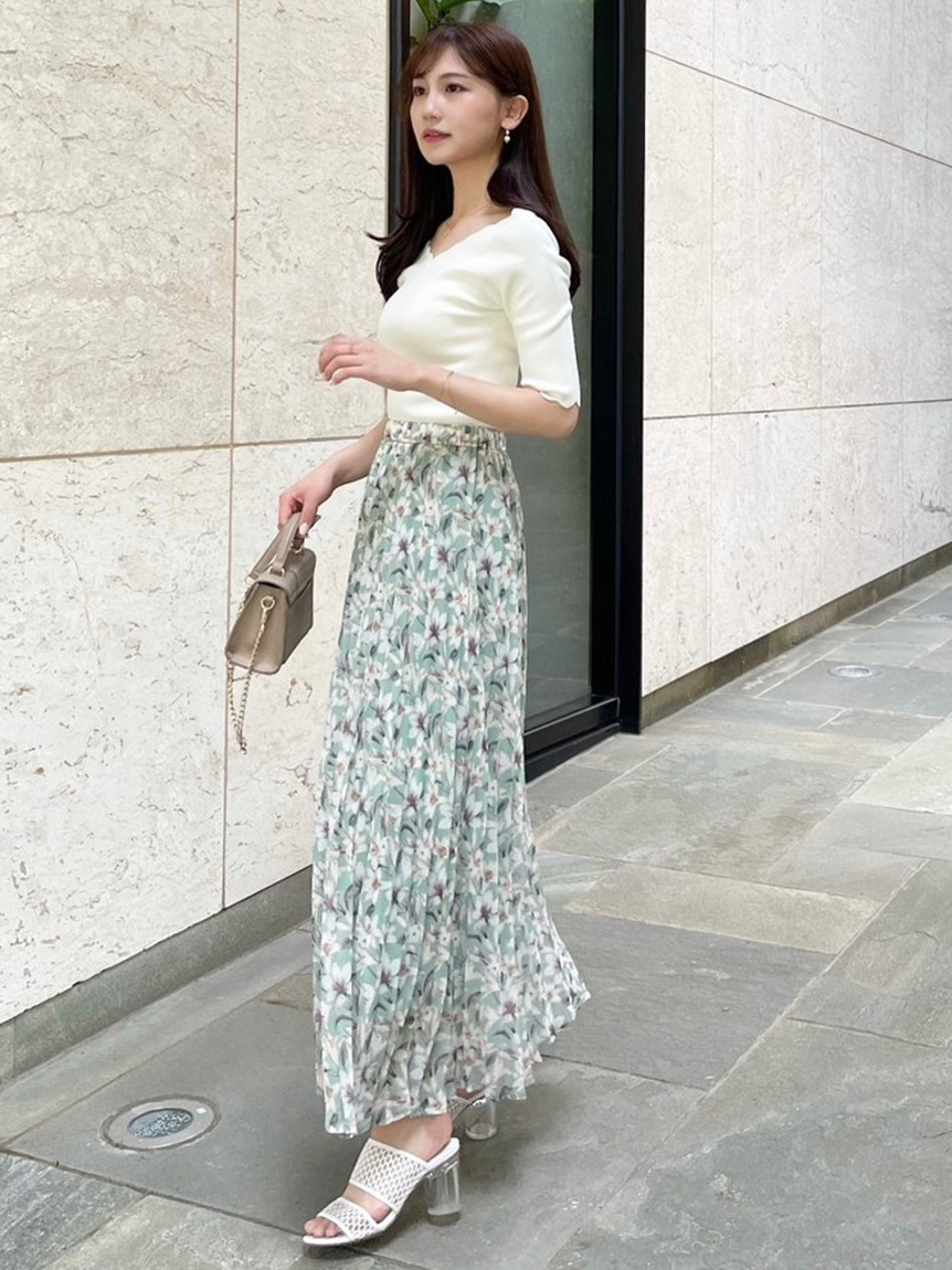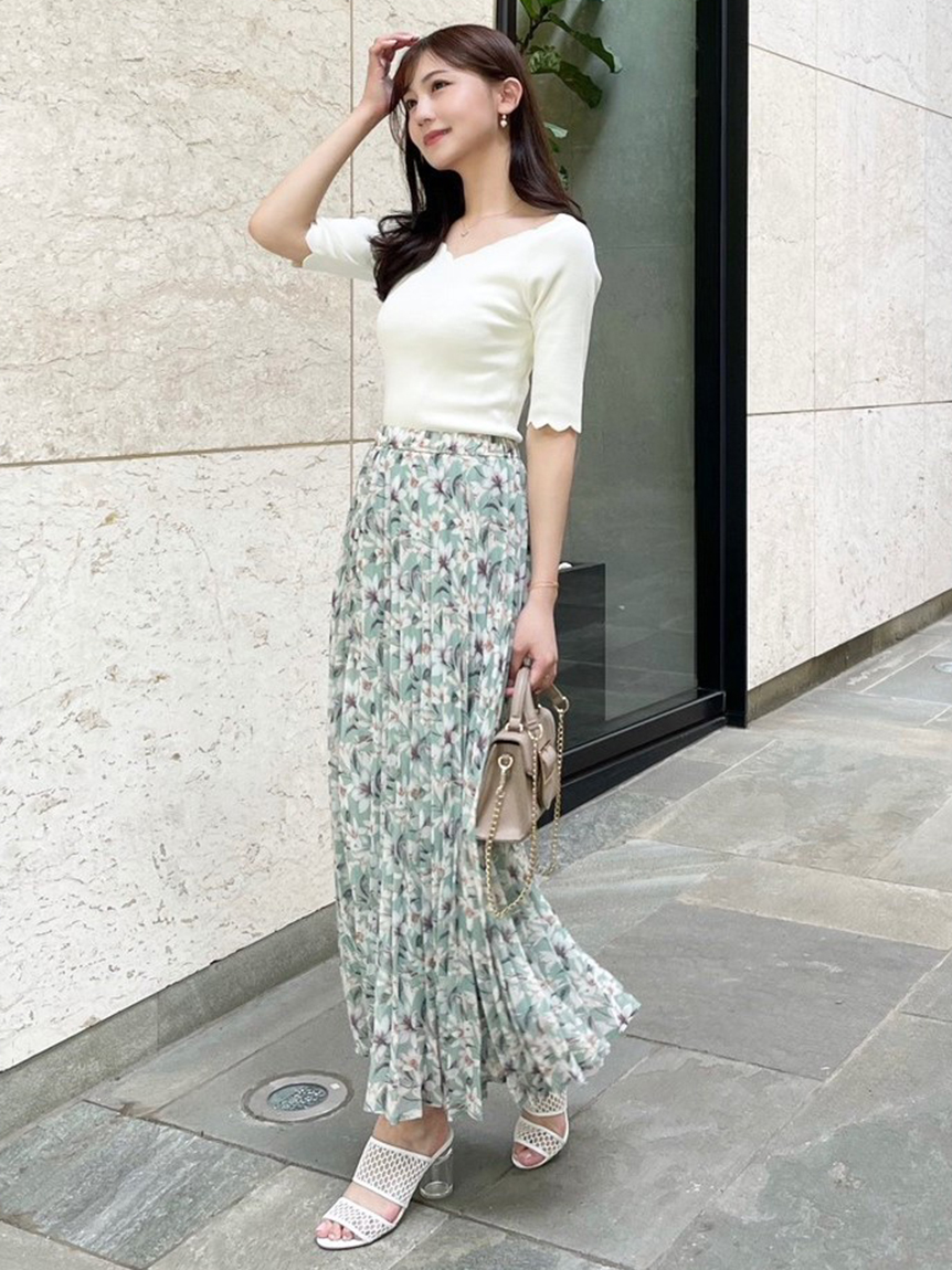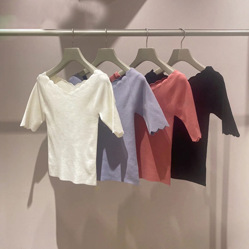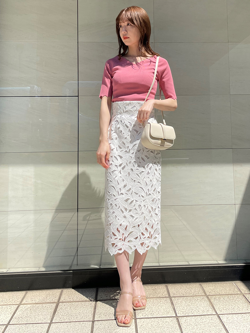スカラップカットした襟ぐり&袖口が特徴的な、シンプルながらも女性らしさを感じさせるニットトップス。広めに開いたネックラインでヘルシーに肌見せでき、トレンド感をプラスしました。ボディラインを美しく見せるタイトシルエットも◎。スカートからパンツまで幅広いボトムと合わせやすく、着まわし力も抜群です。
