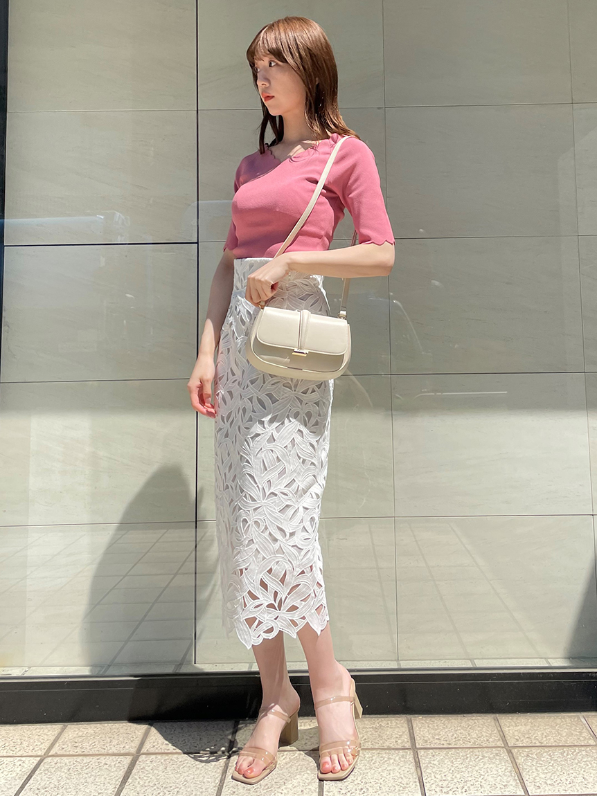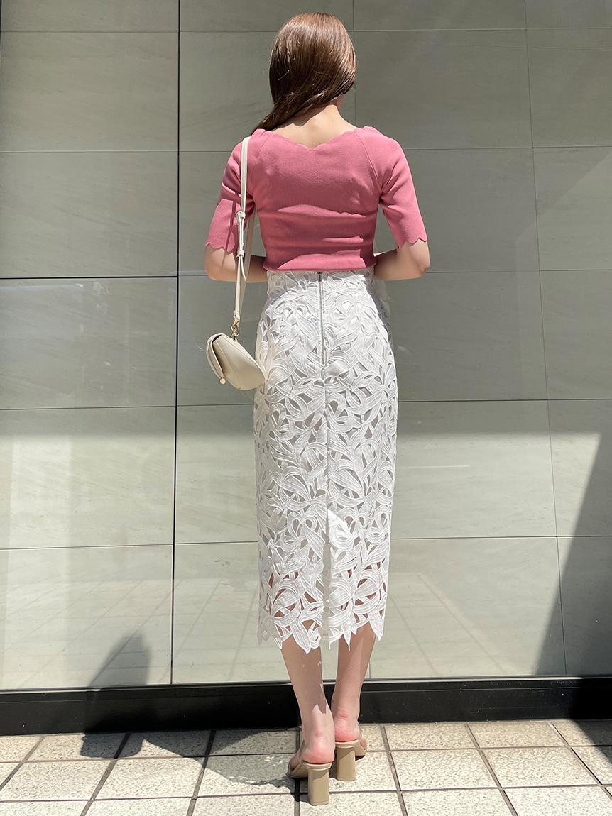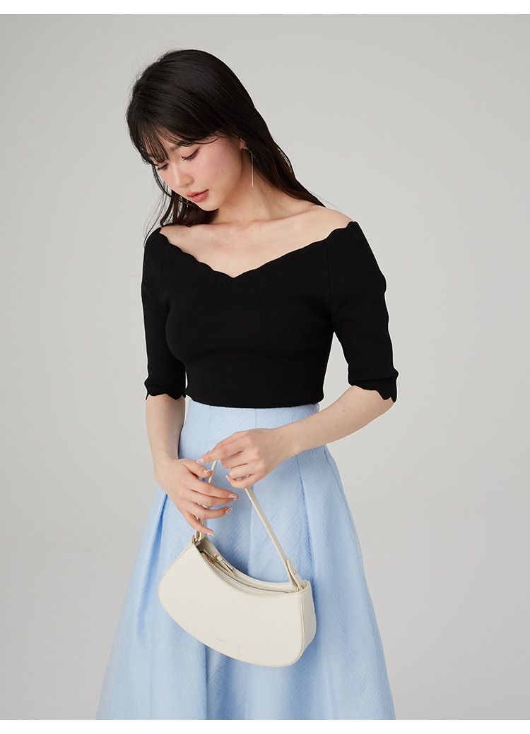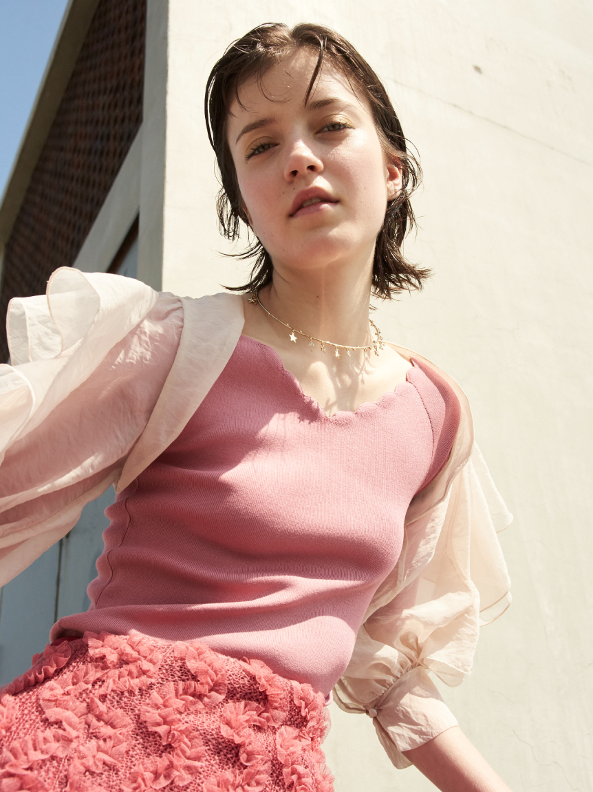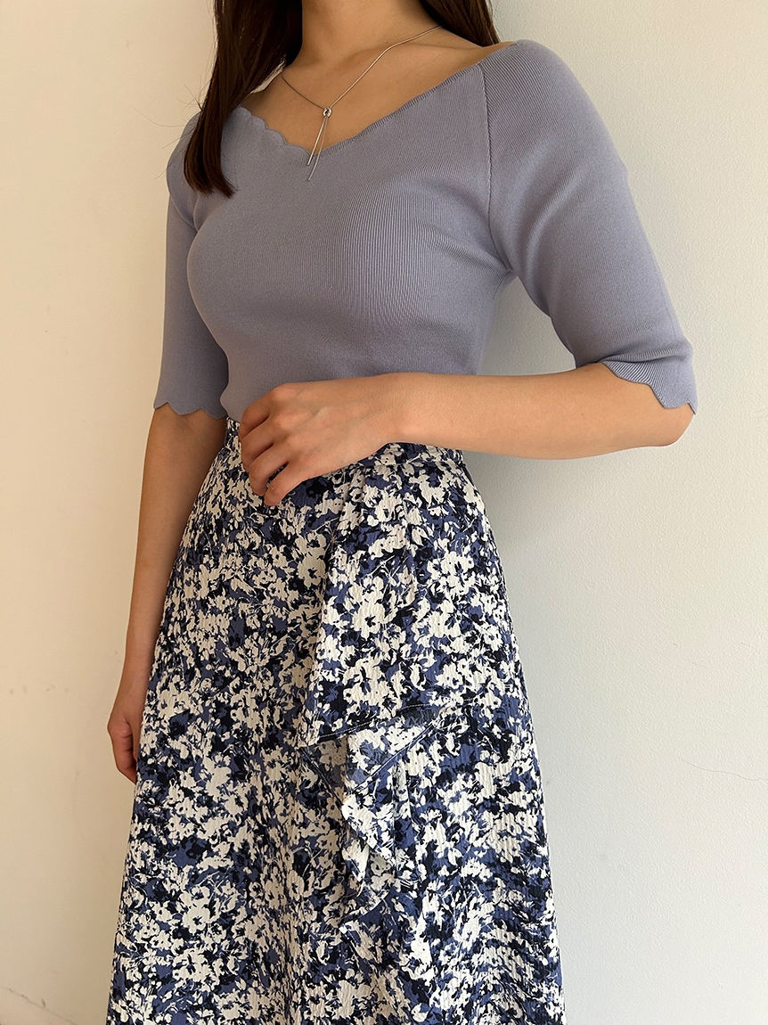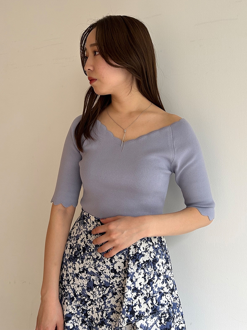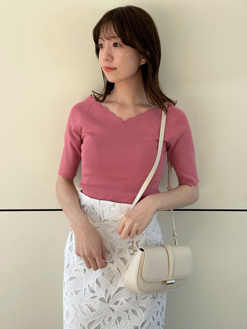 【女性らしいスカラップラインが目を引くニットトップス】