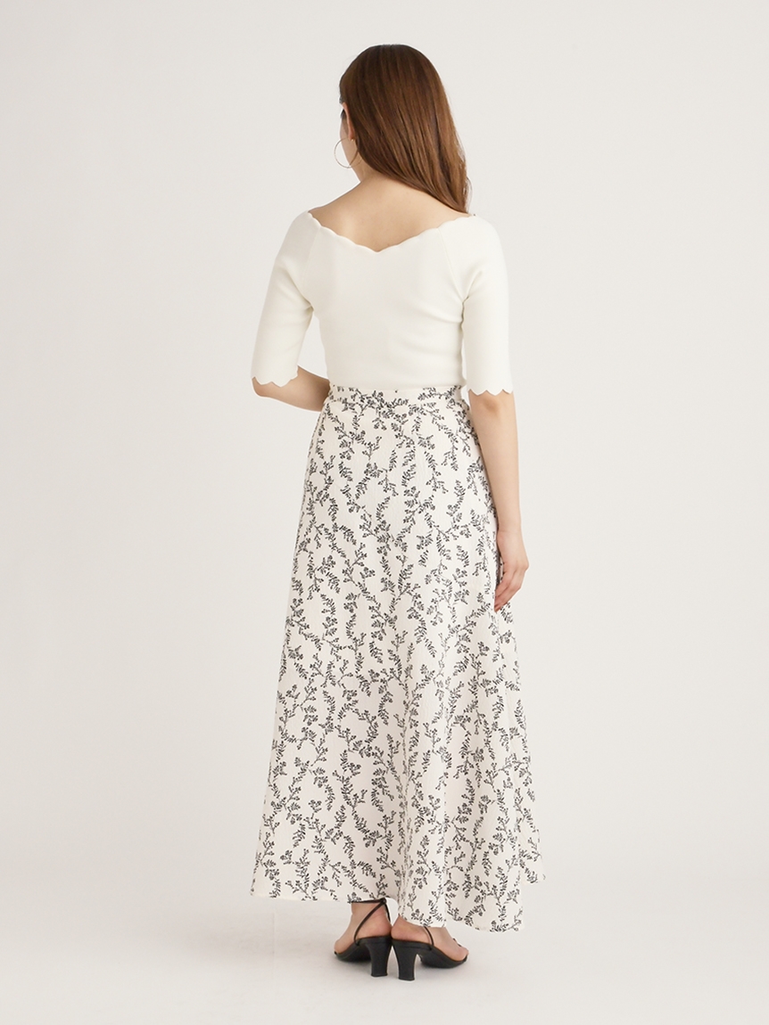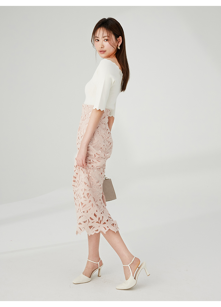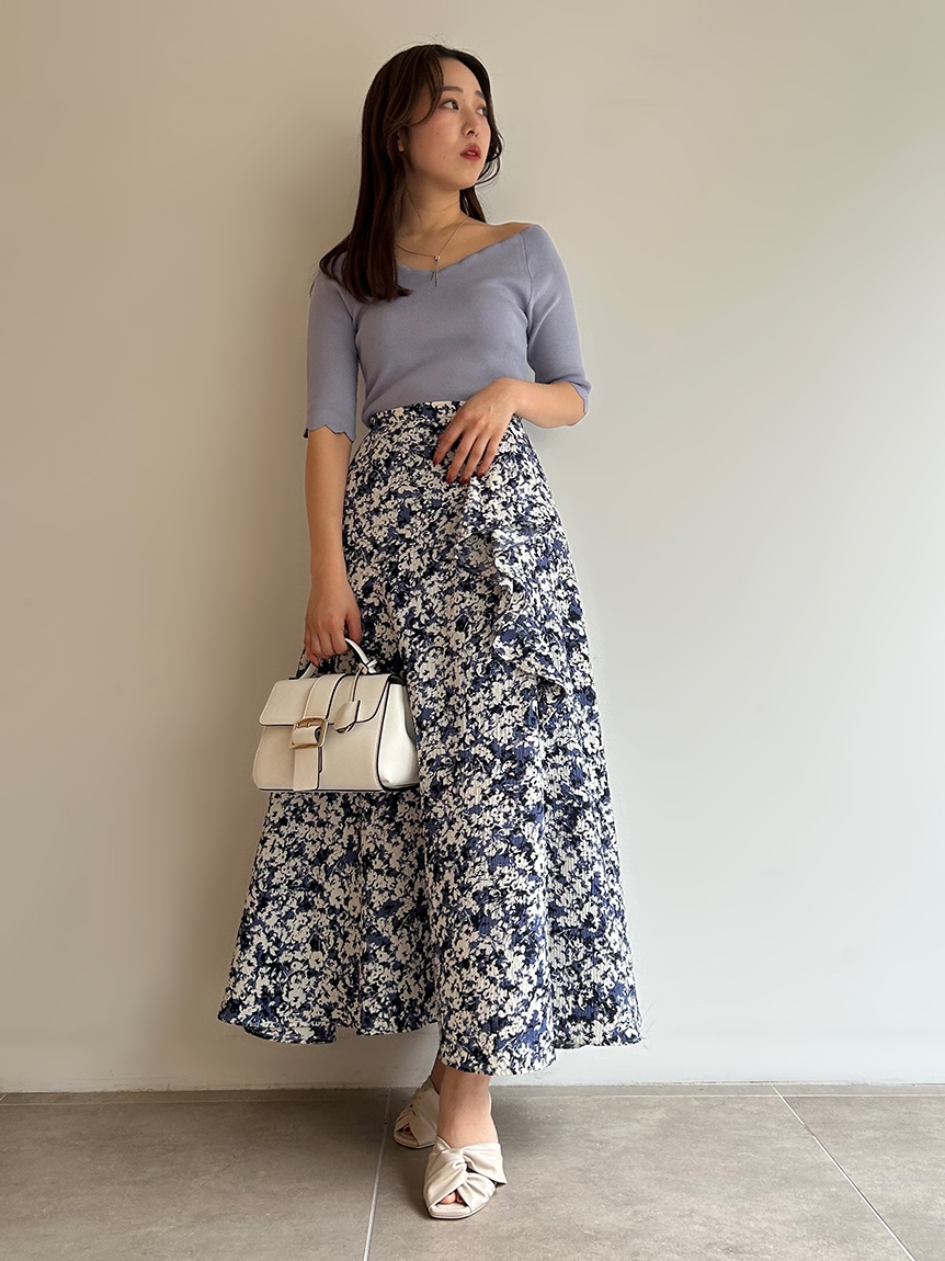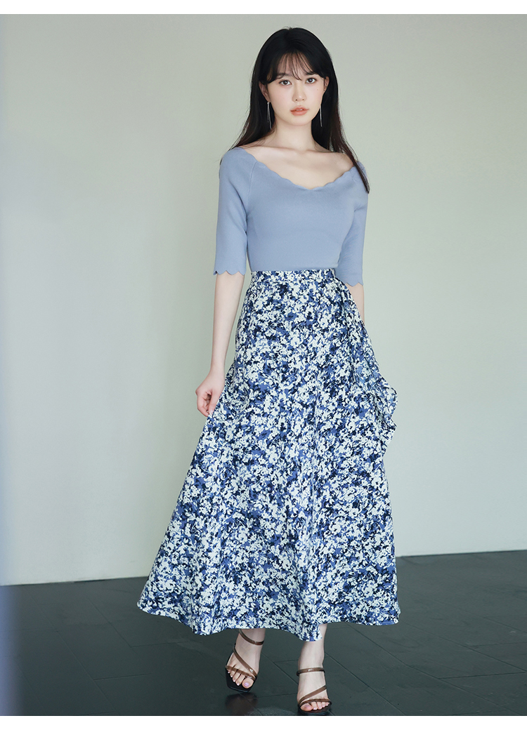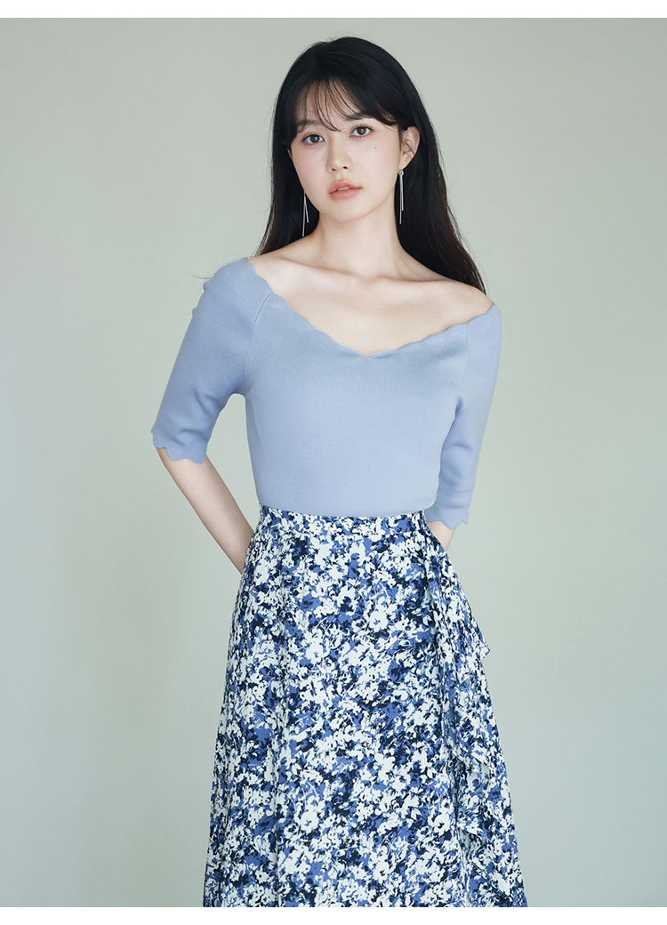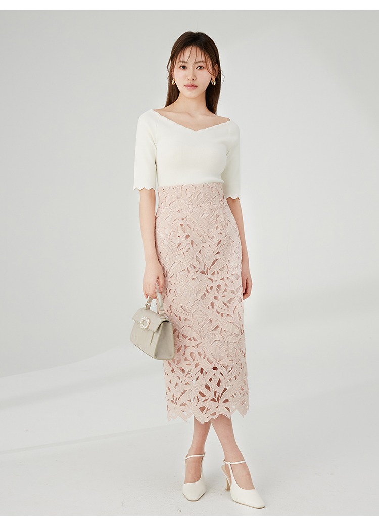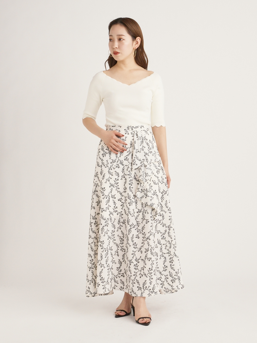【女性らしいスカラップラインが目を引くニットトップス】