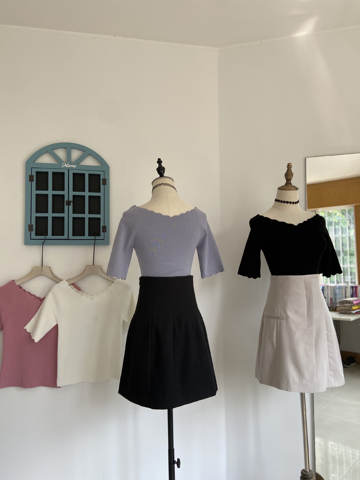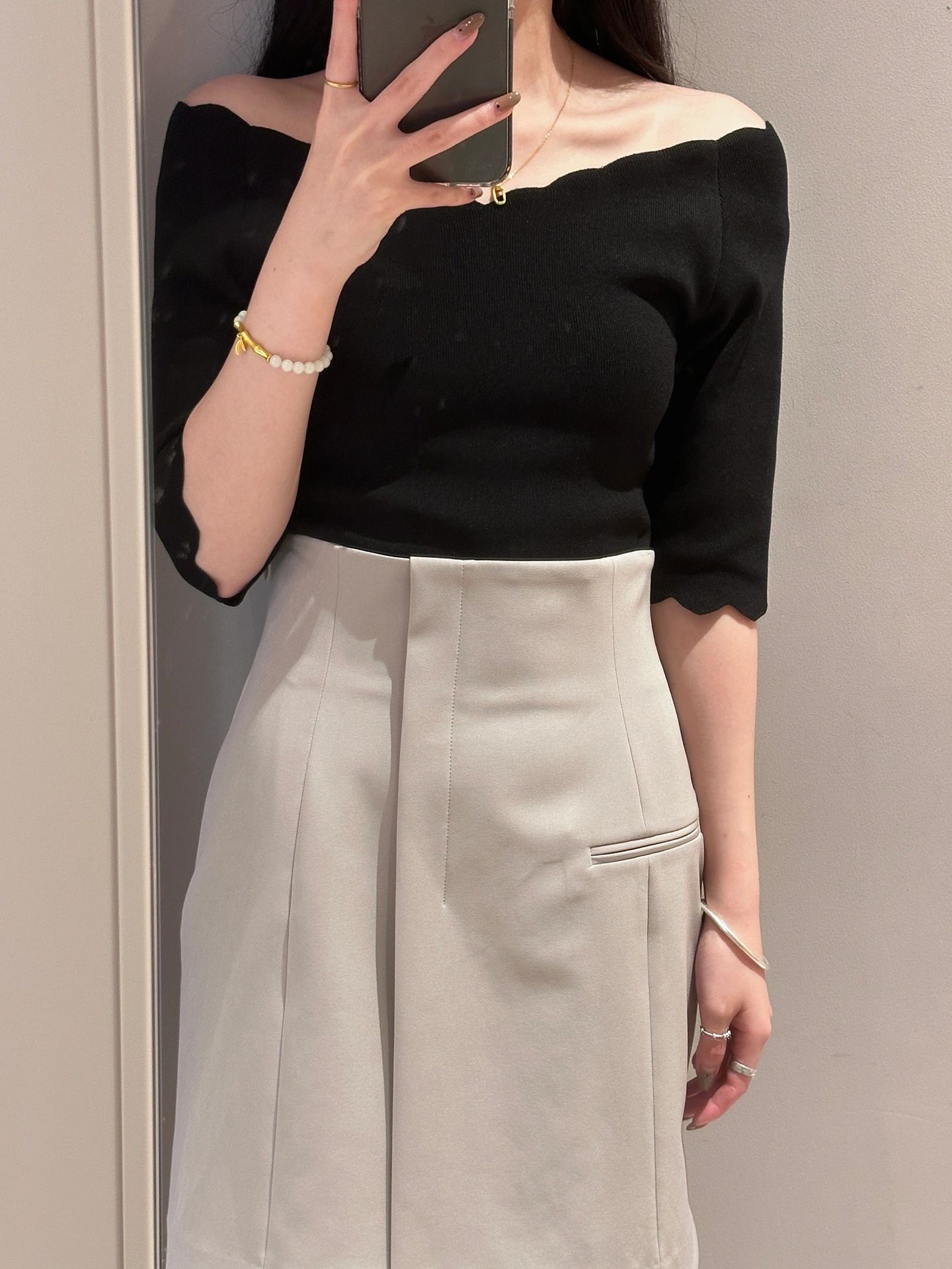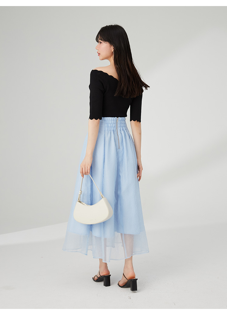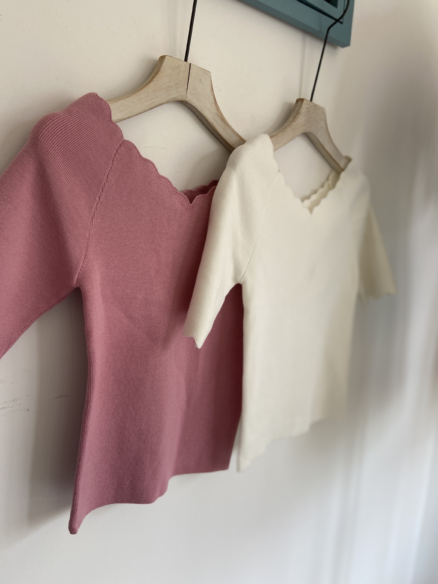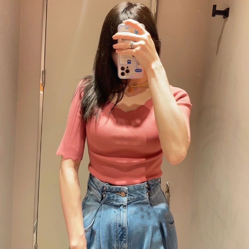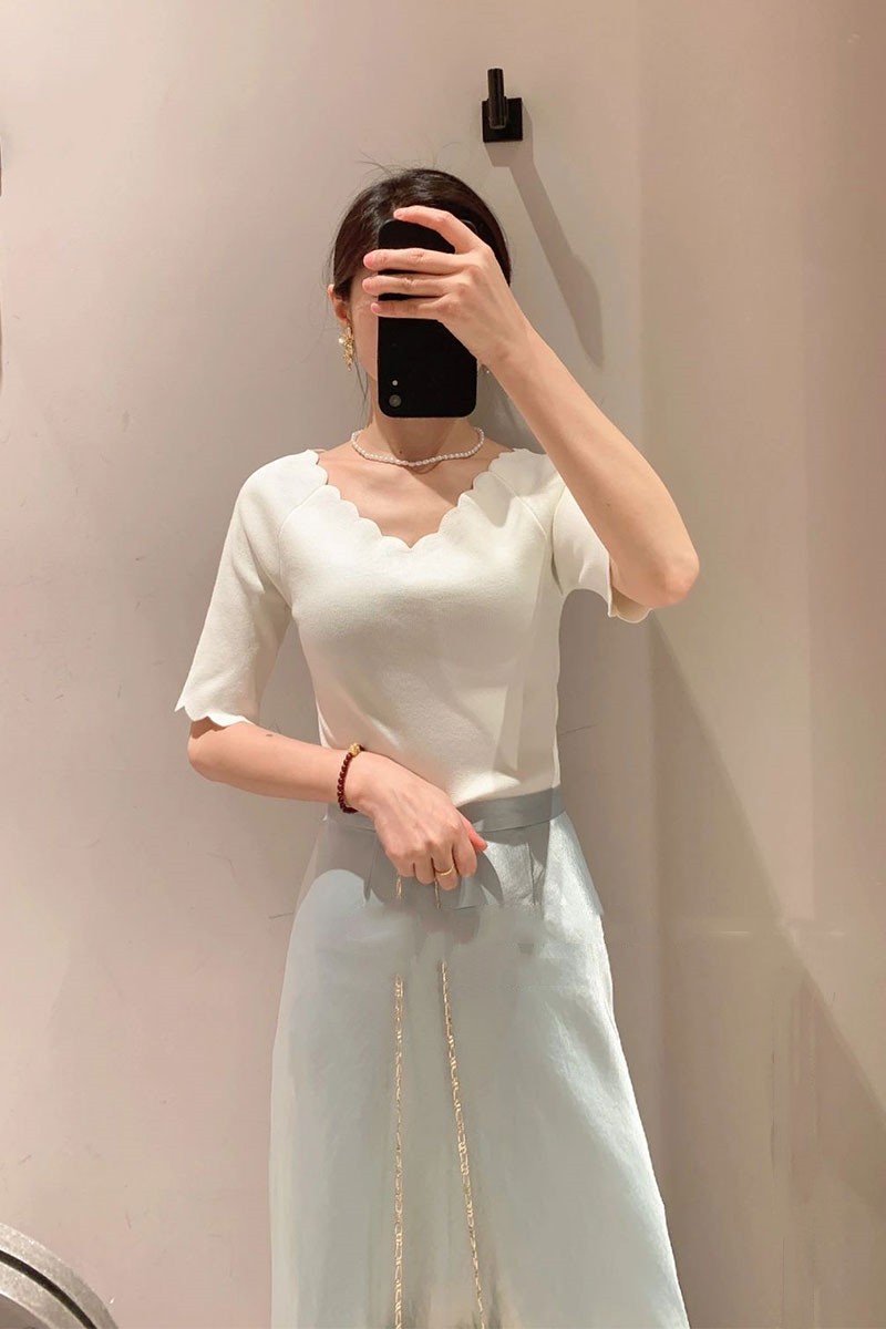 【女性らしいスカラップラインが目を引くニットトップス】
