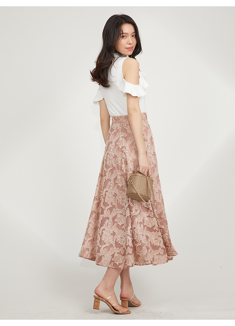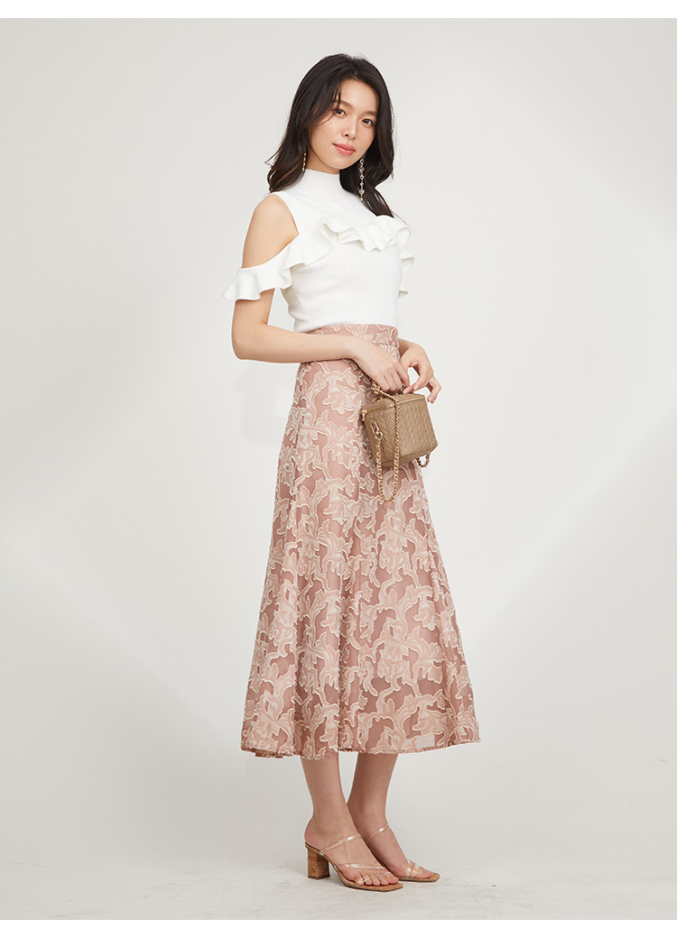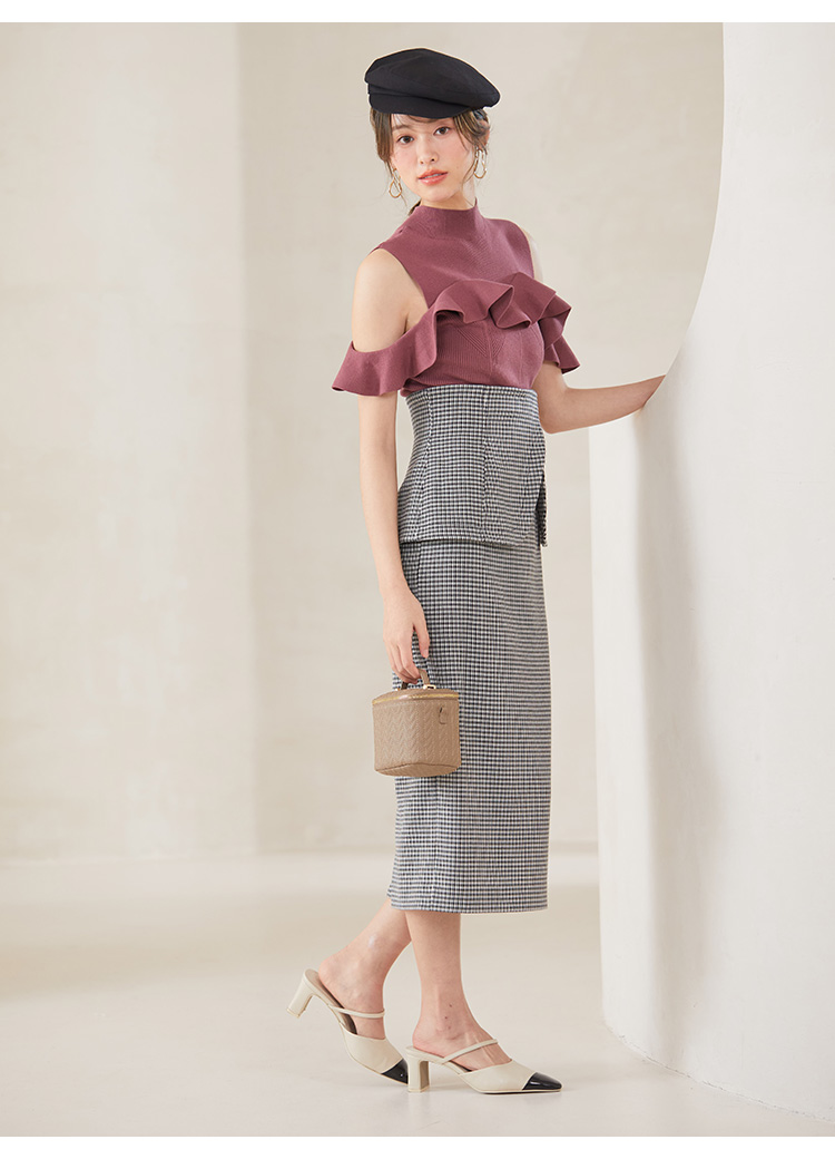 バストから腕にかけてのフリルが目を引く、女子力高めなニットプルオーバー。身頃部分にはコルセットのような柄編みを浮かべトレンド感を演出しています。フィット感のあるタイトシルエットが女性らしさを高める秘訣。ボリュームスカートからストレートパンツまで幅広いボトムと合わせやすく、スタイリング力も抜群です。