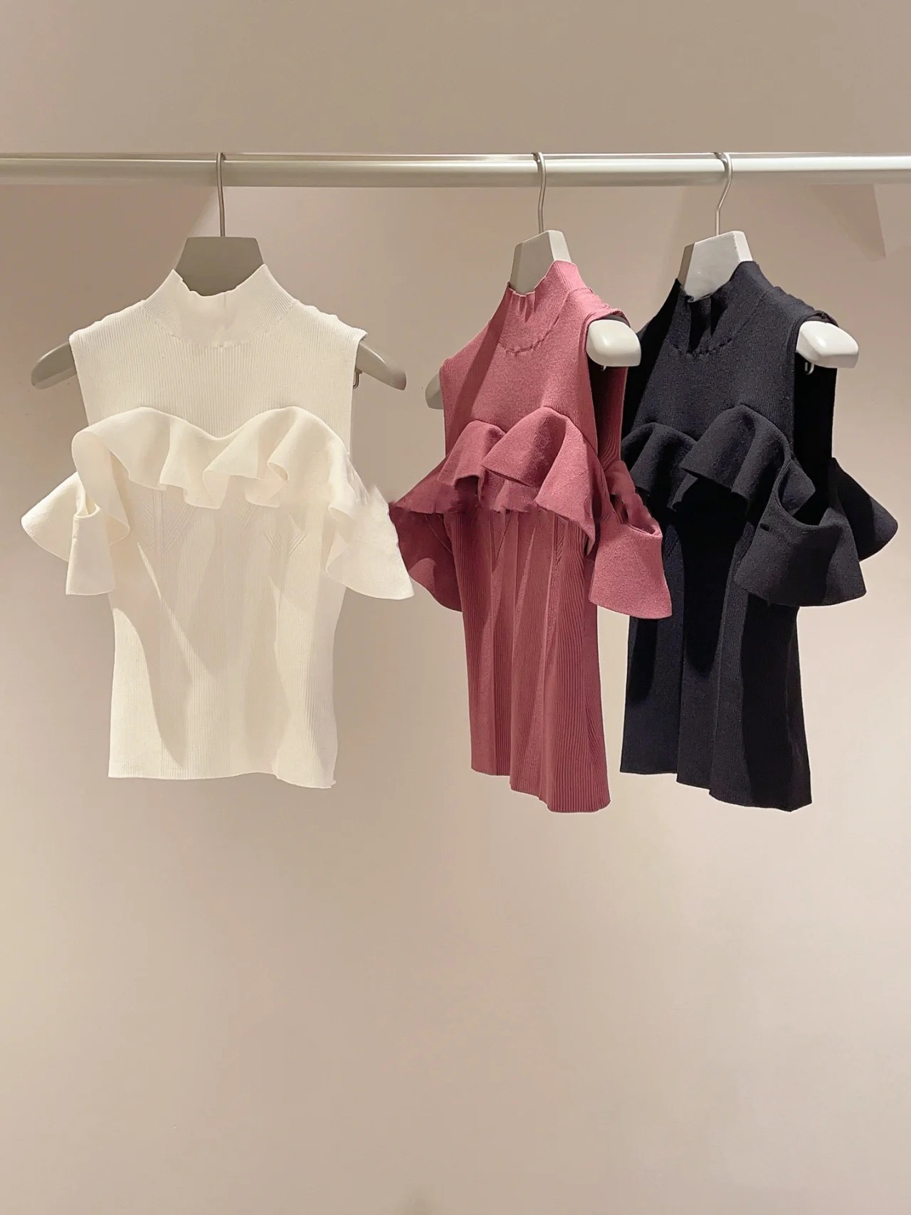 伸縮性のある柔らかなリブニットを使用しました。ベーシックカラーのアイボリーとブラックに、華やかなローズを加えた3色展開でお届けします。