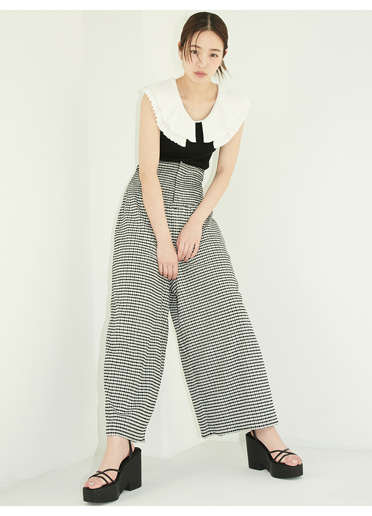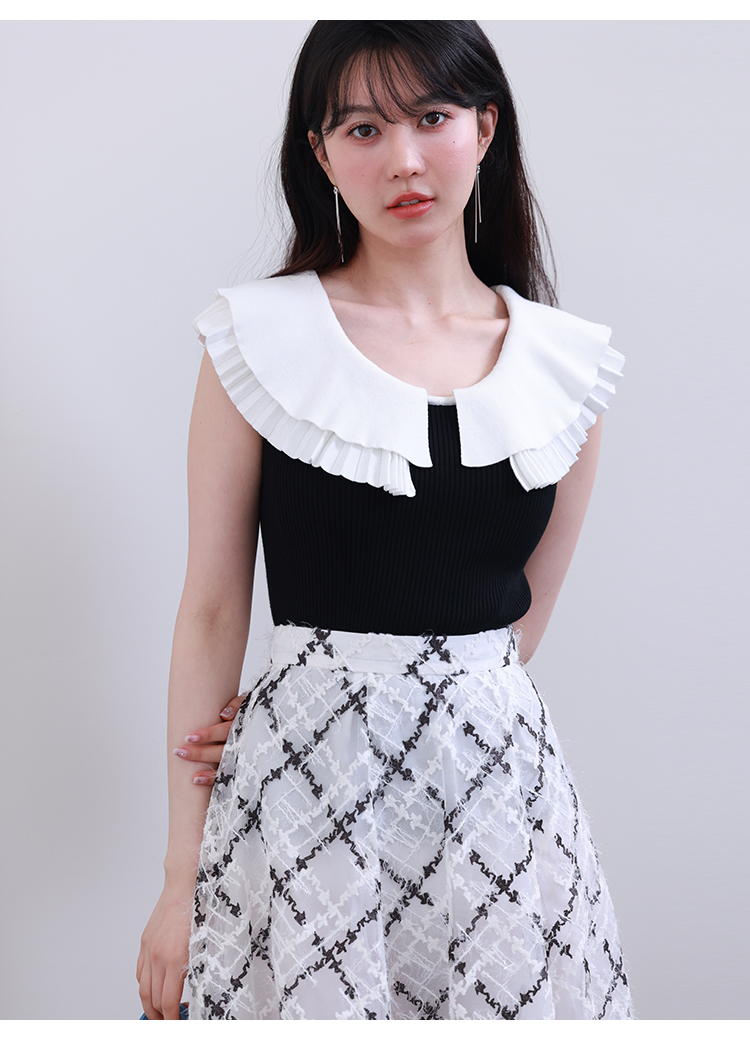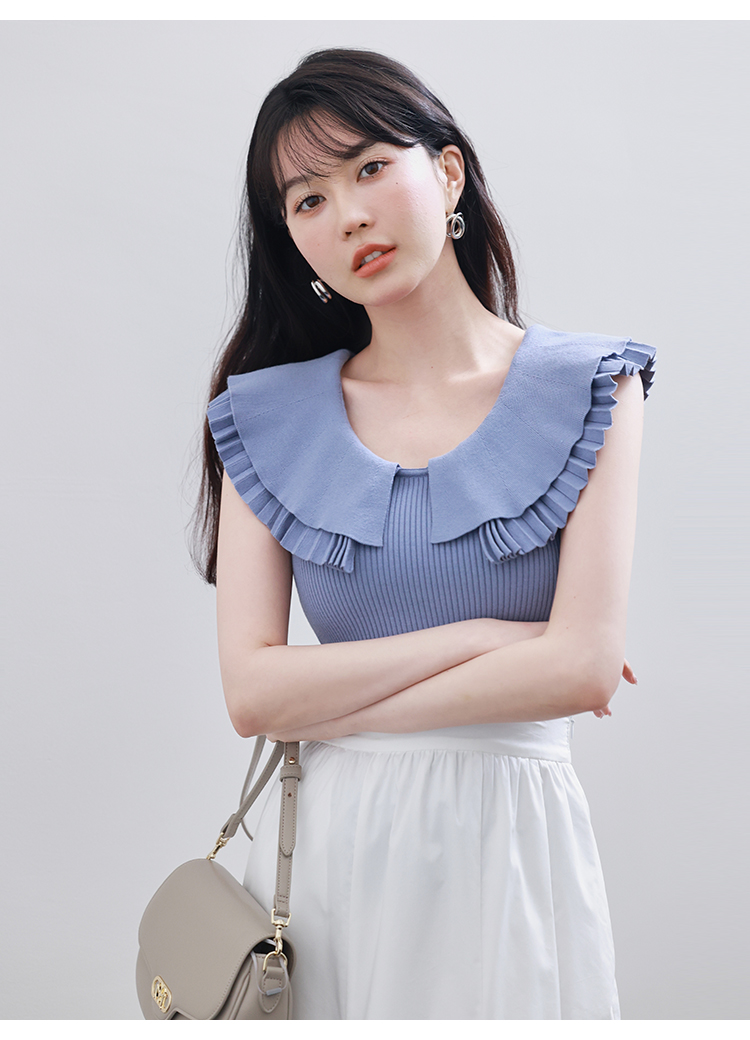 ニットプリーツをレイヤードした襟が印象的な、華やかな雰囲気のニットトップス。身頃部分をシンプルかつタイトに仕上げることでこだわりの襟が引き立ち、より女性らしい印象に仕立てました。ボリュームスカートから細身のパンツまで合わせるボトムを選ばないので、幅広いスタイリングに重宝します。