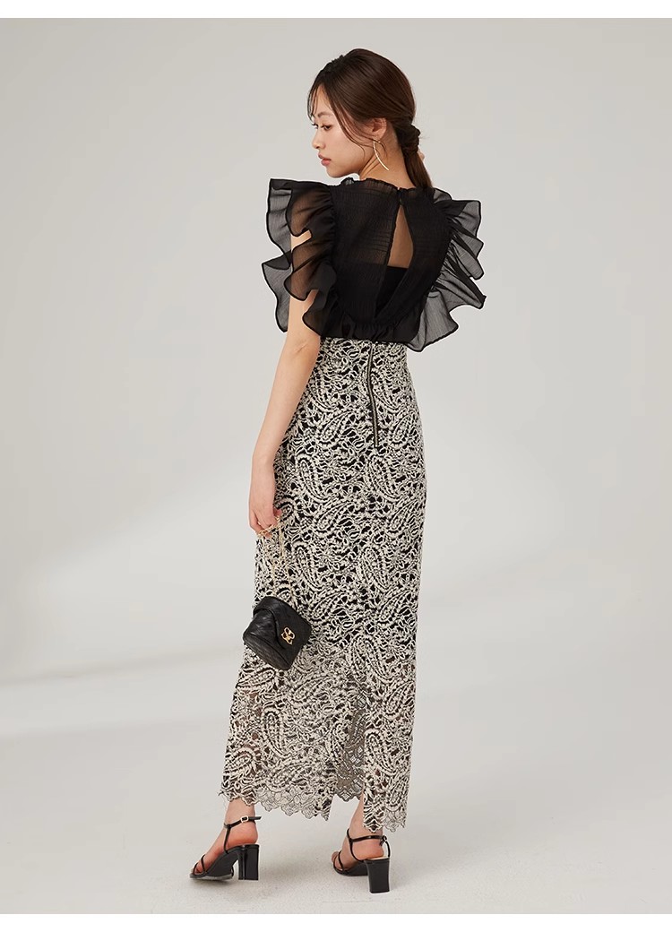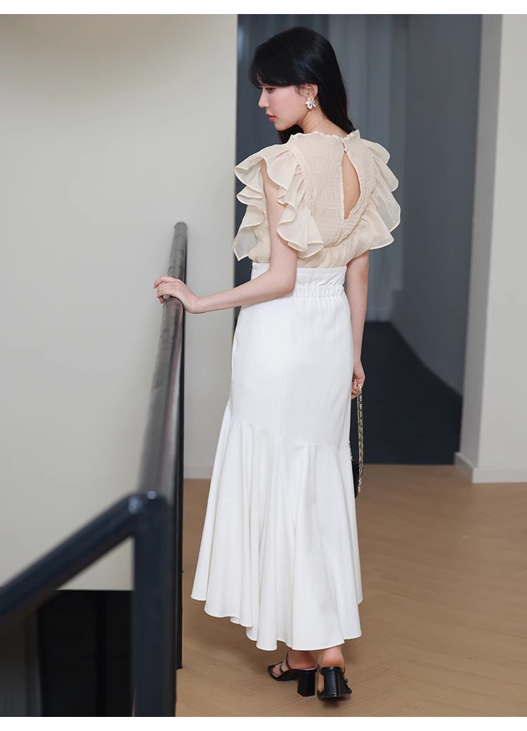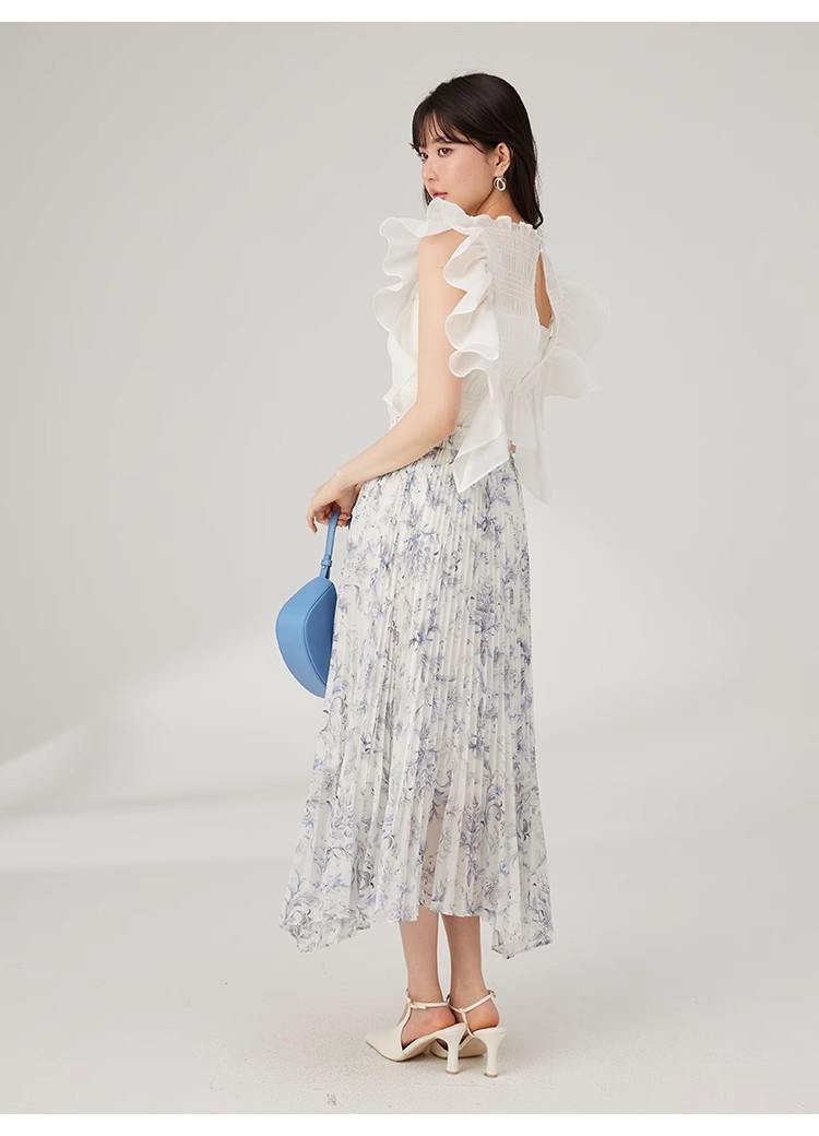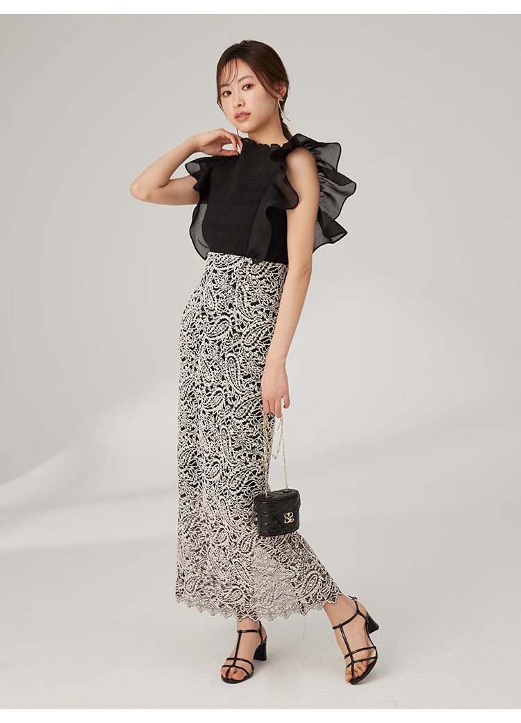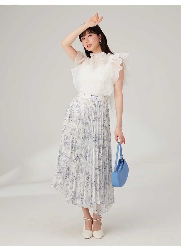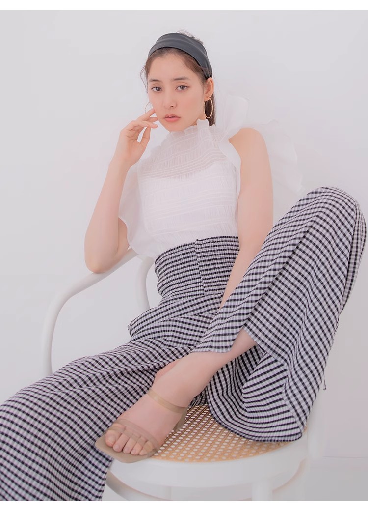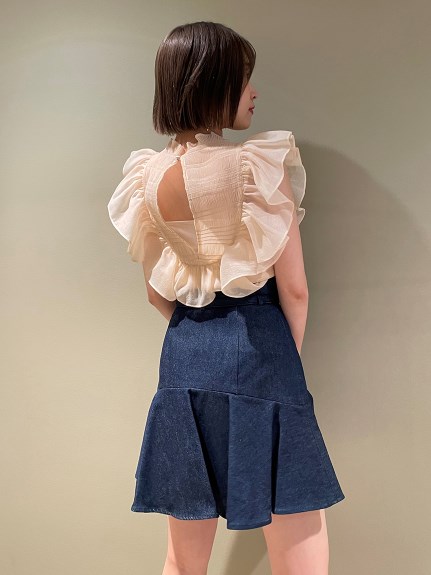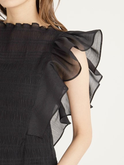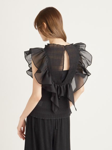 全面に細かいシャーリングが施された、優しい印象のブラウス。袖から背中にかけてあしらわれたボリュームのあるフリルで女性らしく華やかに仕上げました。背中には深めにスリットを入れ、今年らしいヘルシーな肌見せを演出。薄手素材のワイドパンツ(SWFP232142)と合わせてワンピースっぽく着用するのもオススメです。