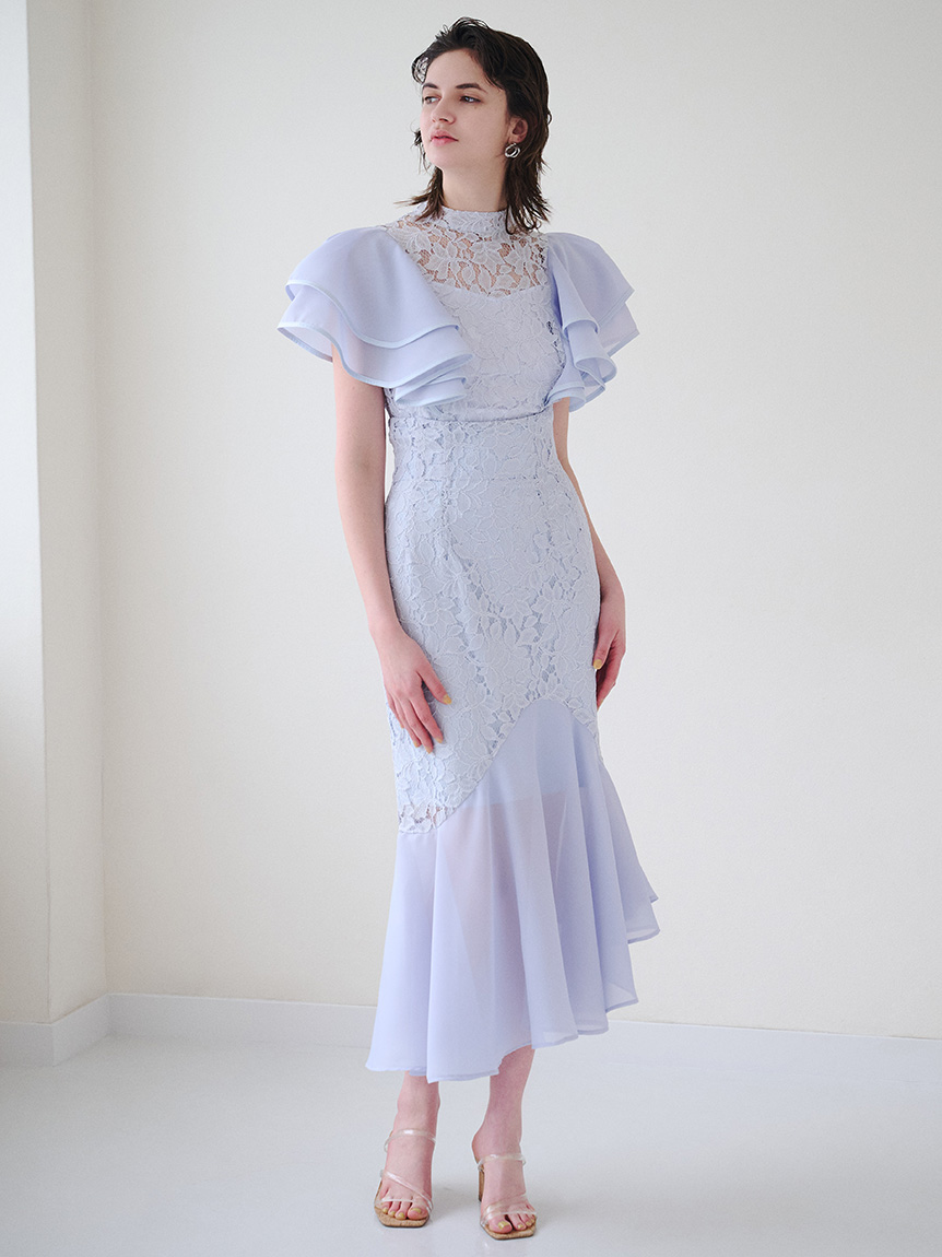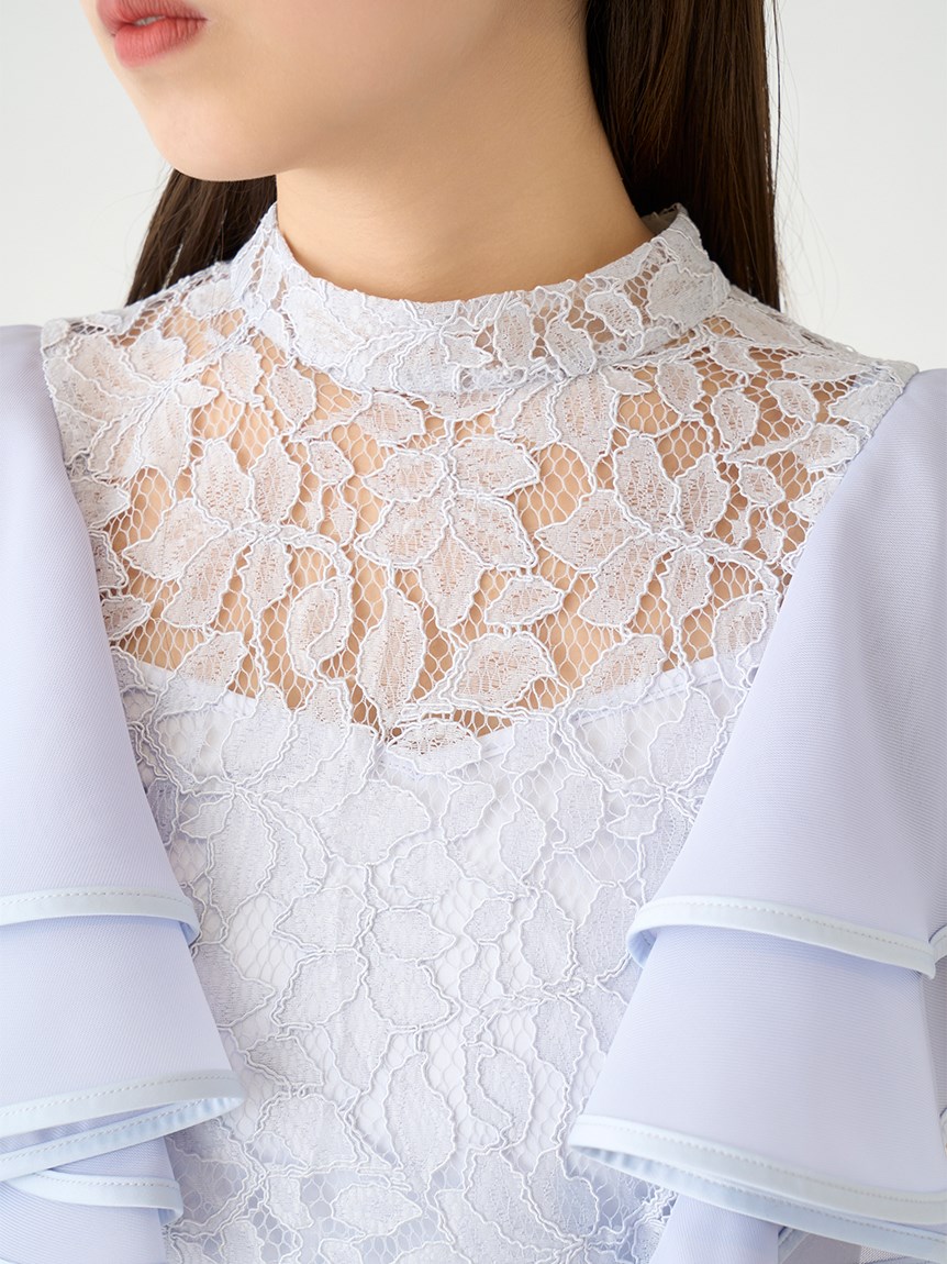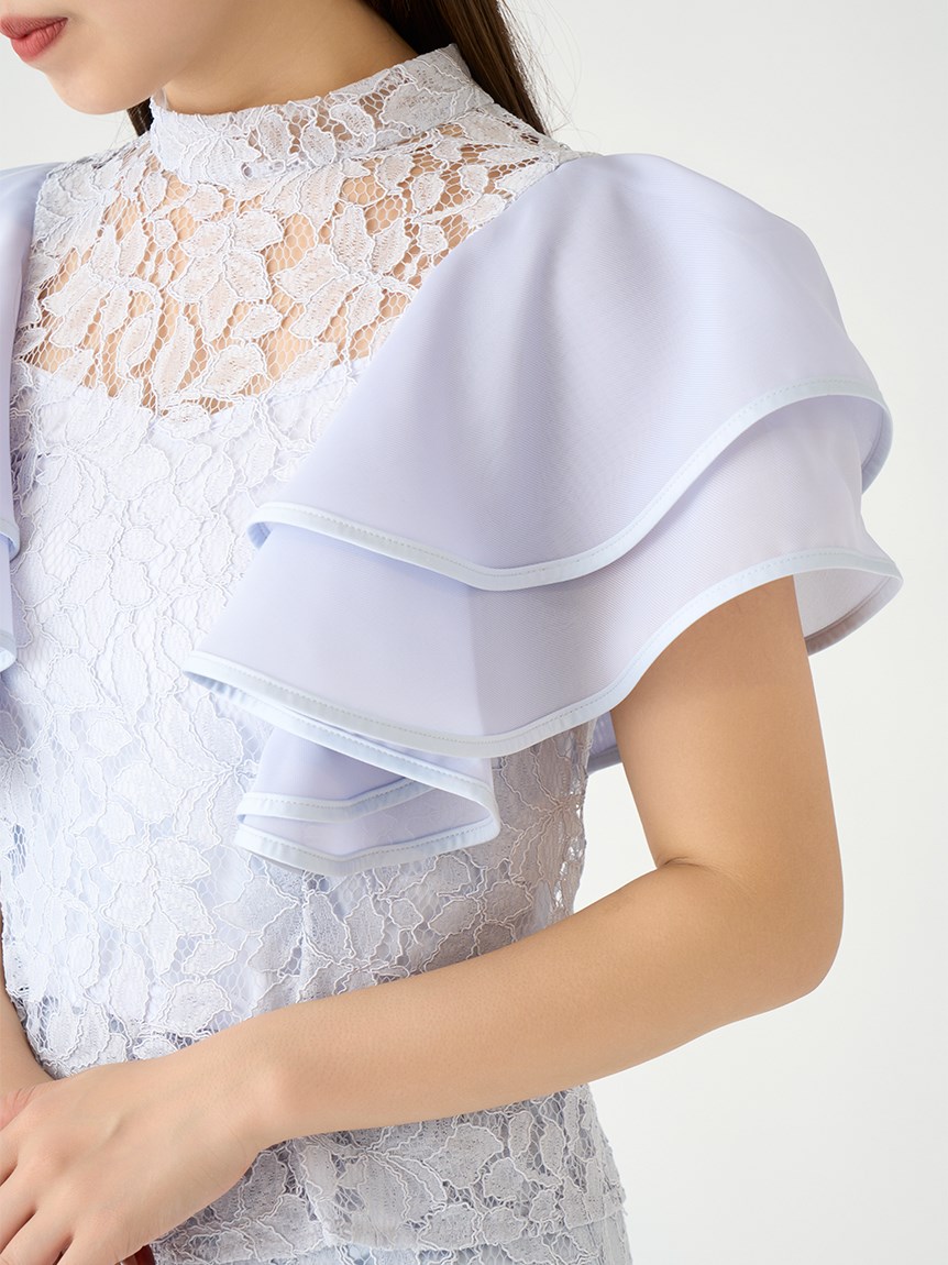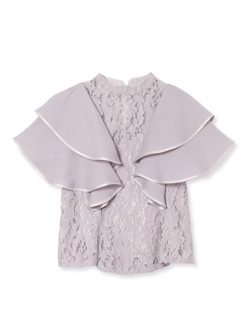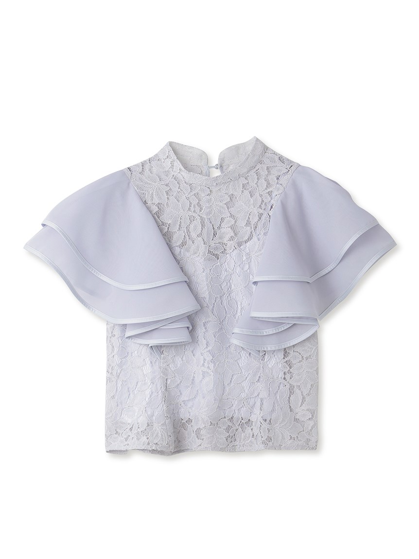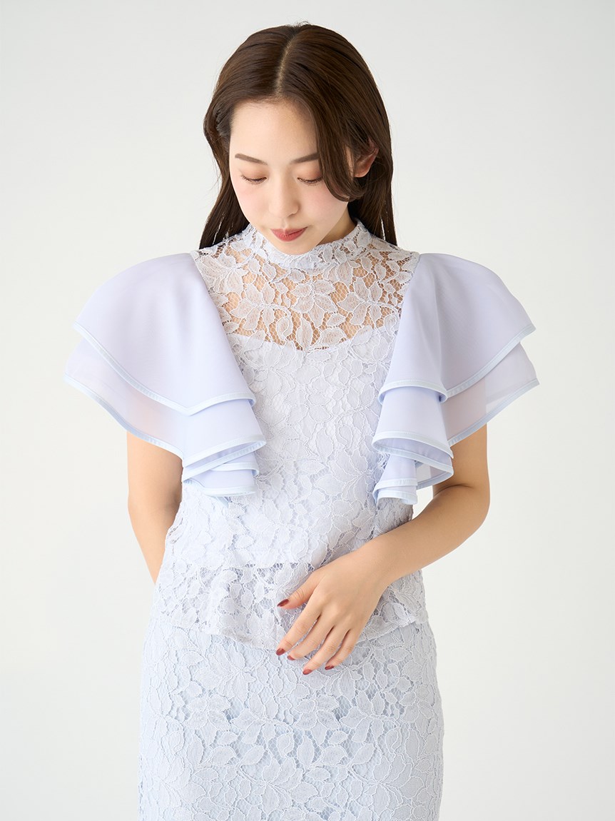 繊細なレースとシアー素材をドッキングした、女性らしくセンシュアルなブラウス。程よいボリューム感で存在感のあるフリルスリーブがエレガントなアクセントに。サテンテープのトリミングを施すことでより華やかな表情を演出しています。同素材を用いたスカート(SWFS231177)と合わせたワンピース見えのセットアップスタイルもおすすめ。