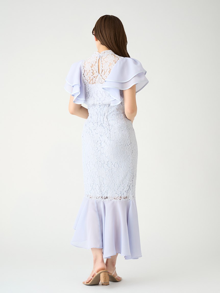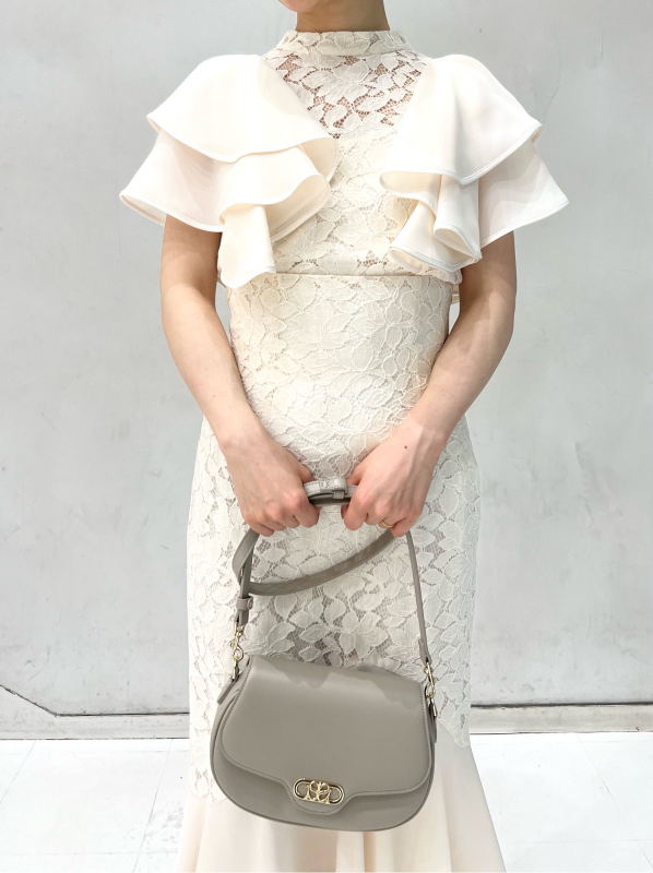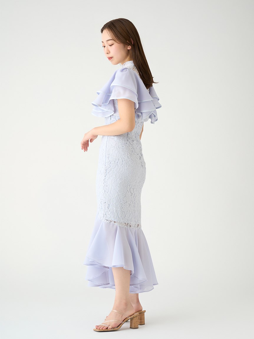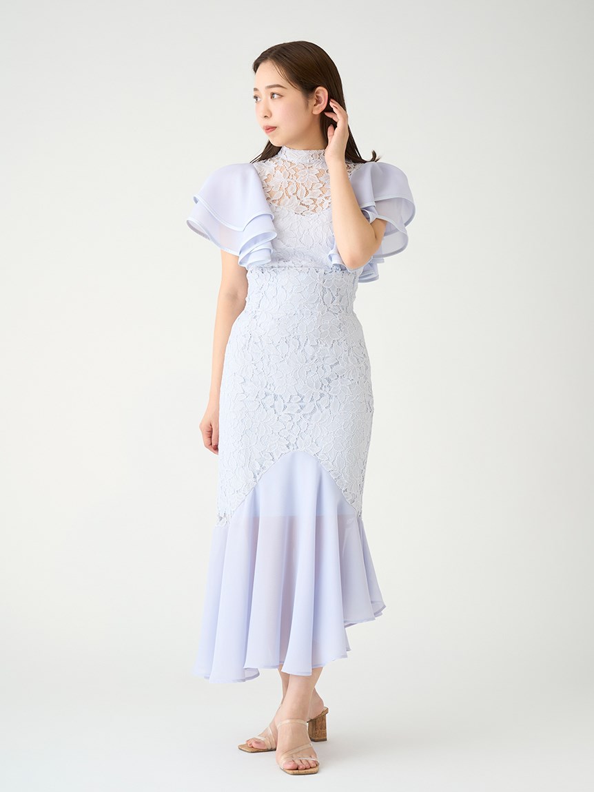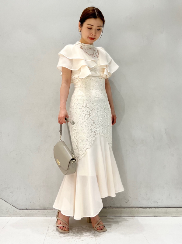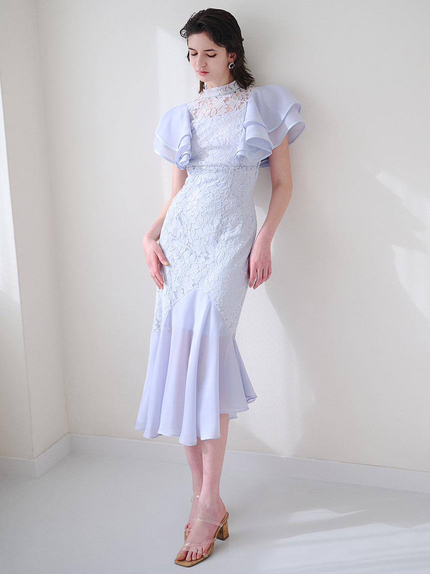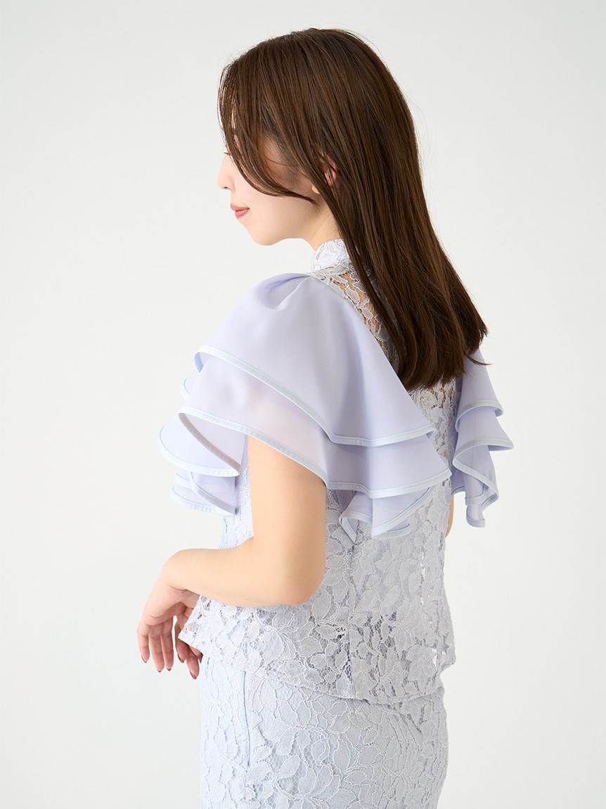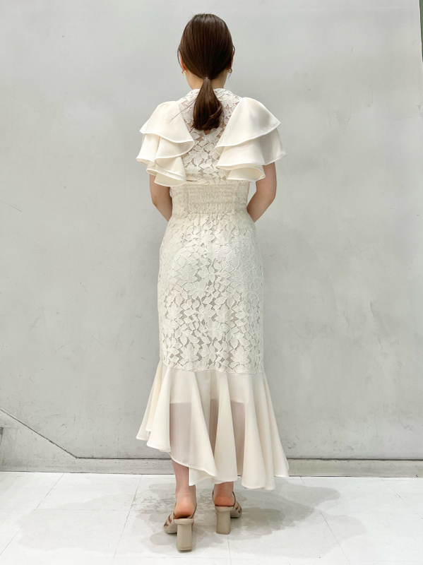 繊細なレースとシアー素材をドッキングした、女性らしくセンシュアルなブラウス。程よいボリューム感で存在感のあるフリルスリーブがエレガントなアクセントに。サテンテープのトリミングを施すことでより華やかな表情を演出しています。同素材を用いたスカート(SWFS231177)と合わせたワンピース見えのセットアップスタイルもおすすめ。