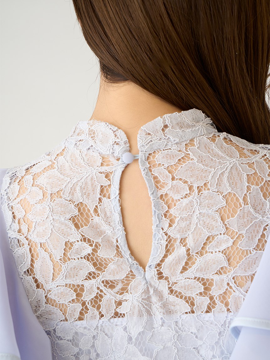 繊細なフラワー模様が浮かぶレースとシアーな生地を組み合わせました。淡い色合いでフェミニンなアイボリー、グレーベージュ、ライトブルーの3色をご用意。