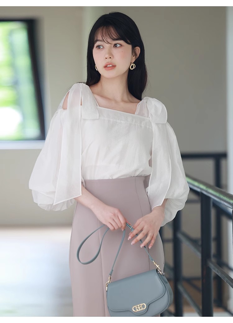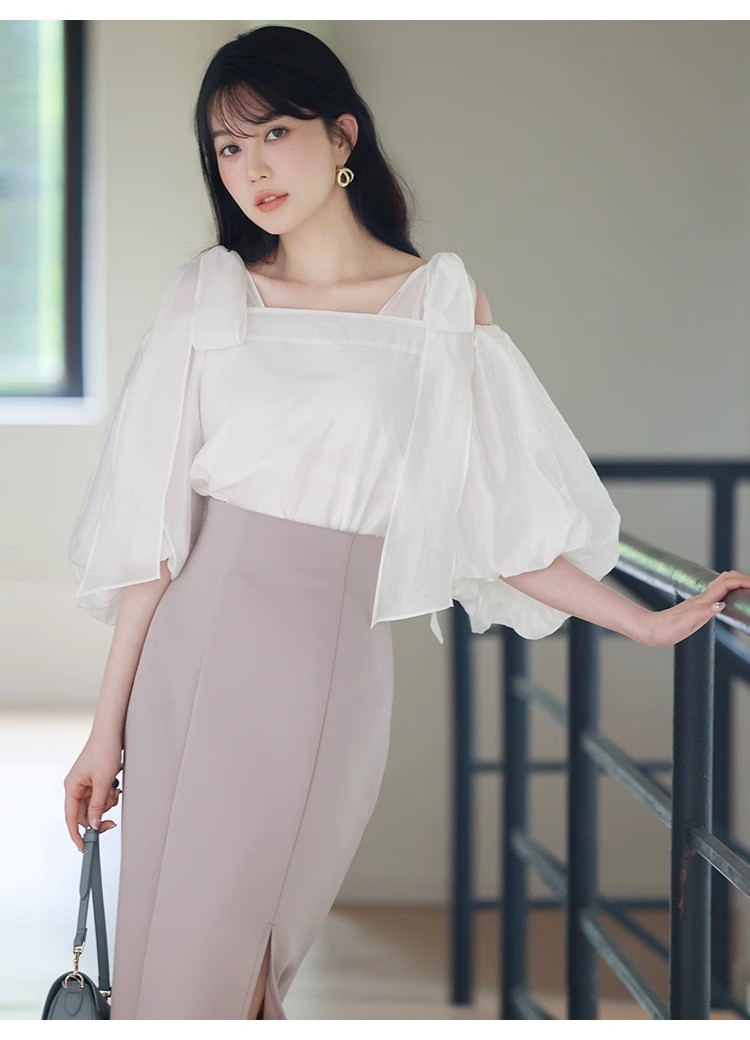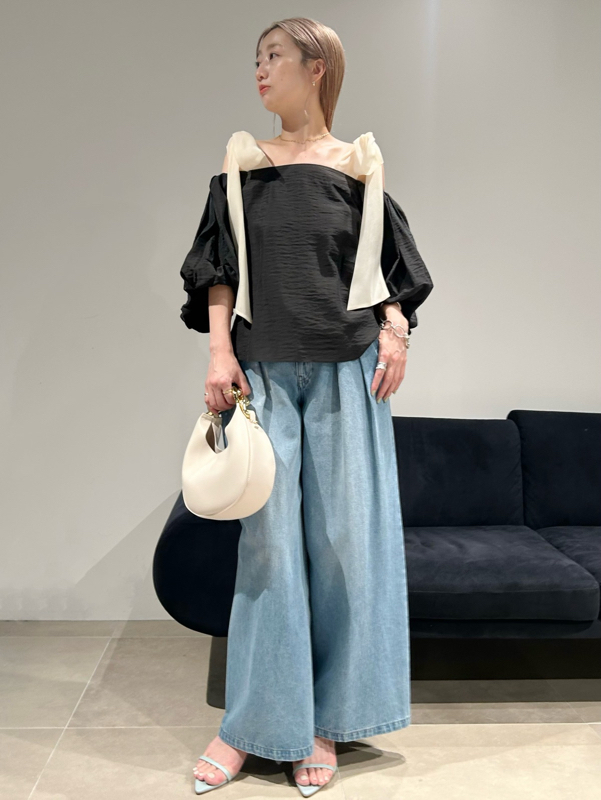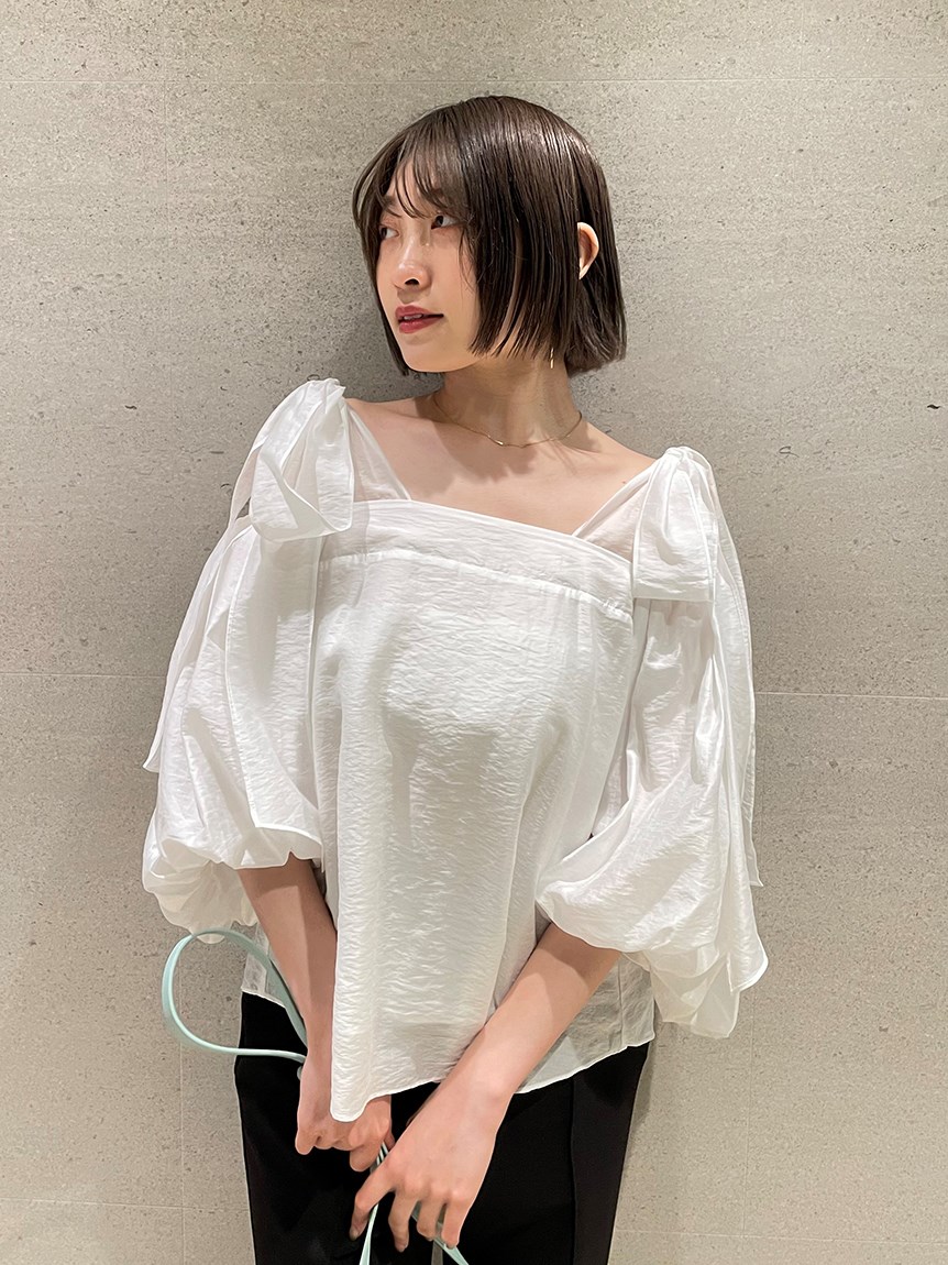 ヘルシーな肌見せで女性らしさを引き立てるオフショルデザインのブラウス。肩に大きめのリボンをあしらうことでとことんフェミニンに仕上げました。ふんわりと丸みを持たせたボリュームスリーブで華奢見えを演出。レディライクなスカートにはもちろん、敢えてカジュアルなデニムなどと合わせたMIXスタイルもおすすめです。