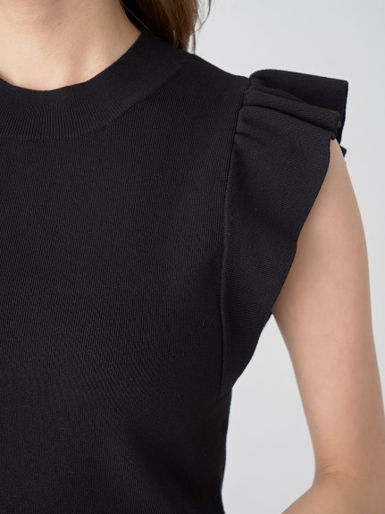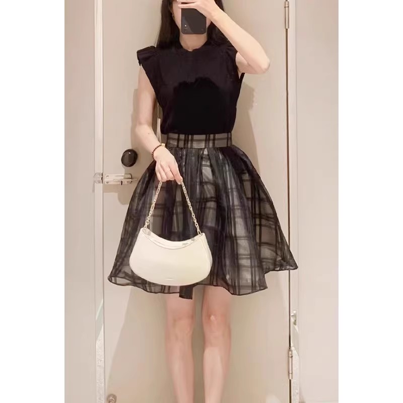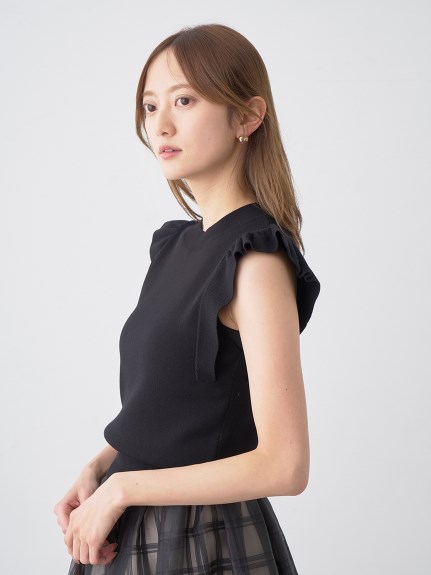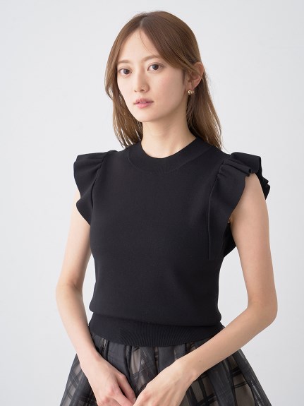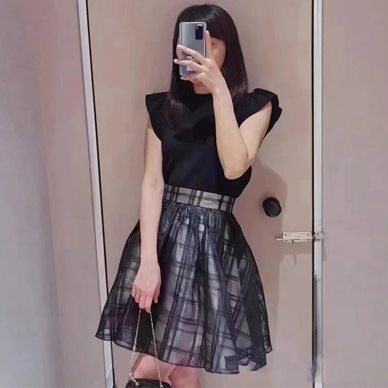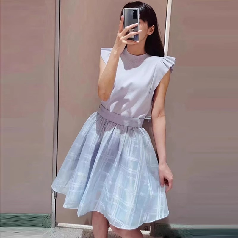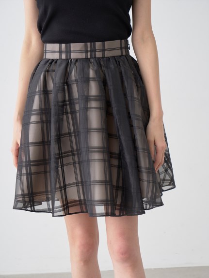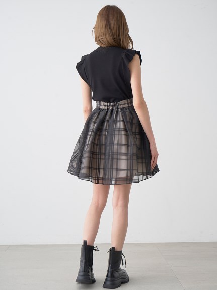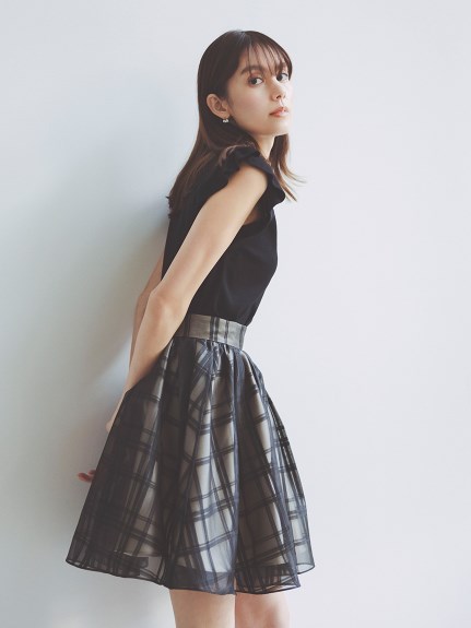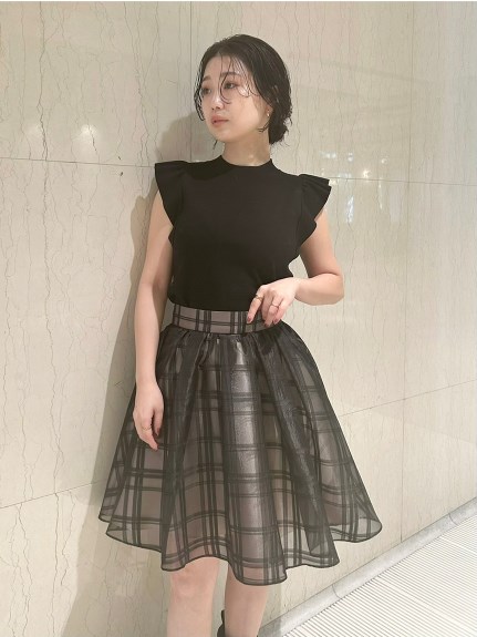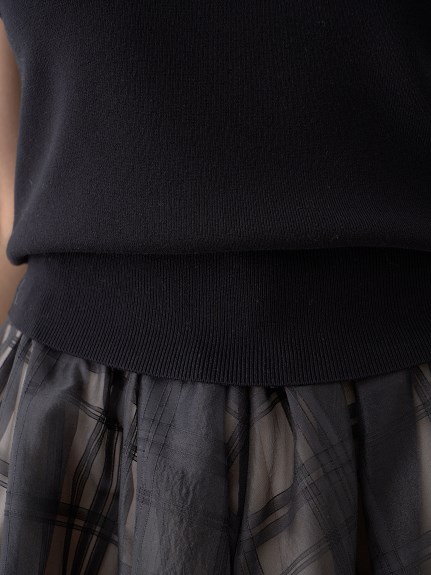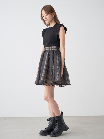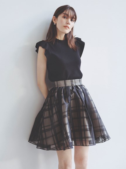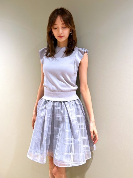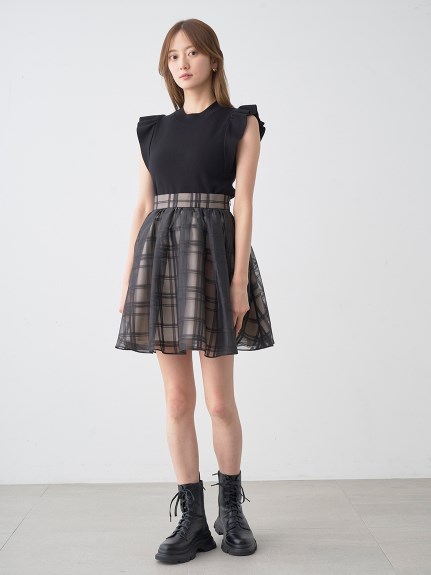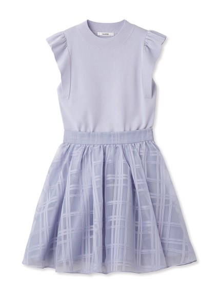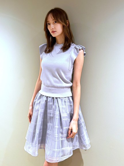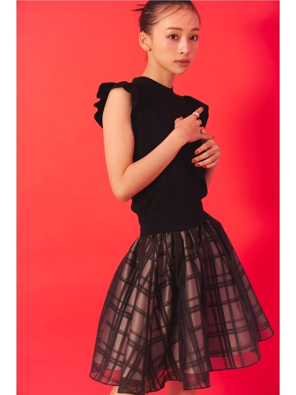 チェック柄のオーガンジー素材が、エアリーな表情を加えるニットコンビワンピース。ショルダーにあしらったフリルで、フェミニンな雰囲気を演出します。スマートなハイネックも魅力のひとつ。ニットとスカートが別でコーディネートができるので、スタイリングの幅がぐっと広がります。