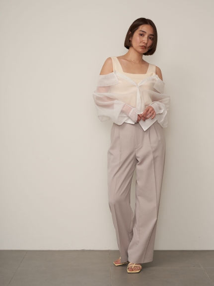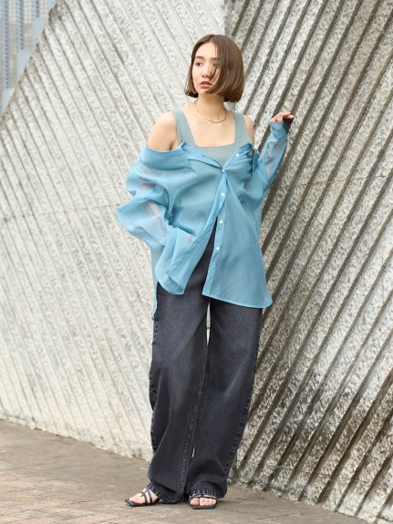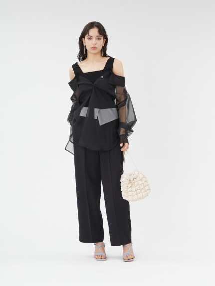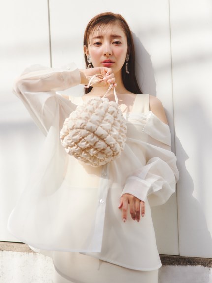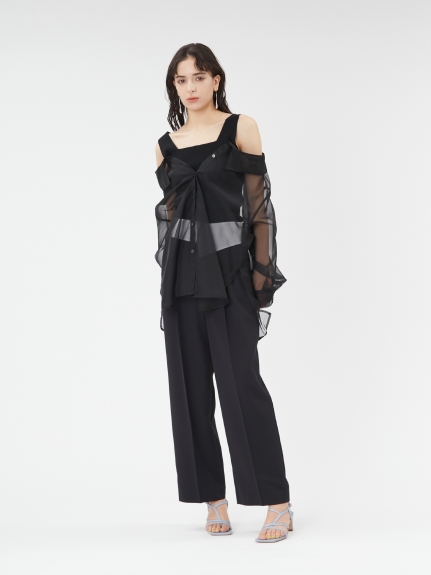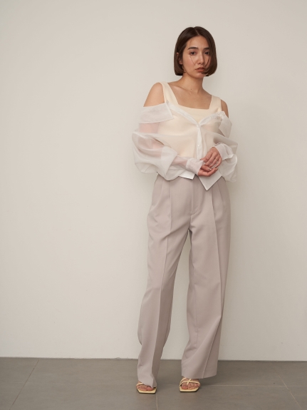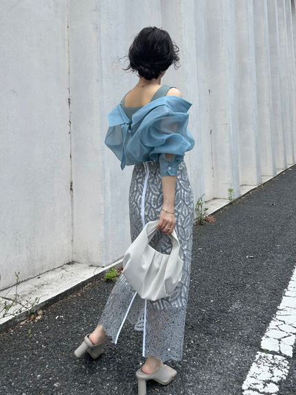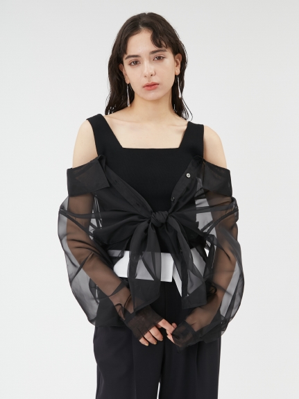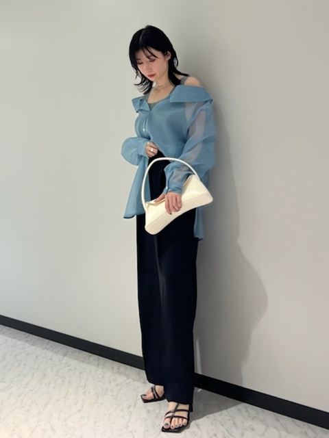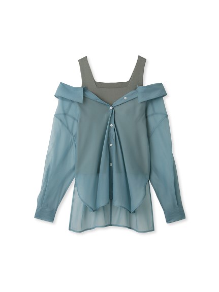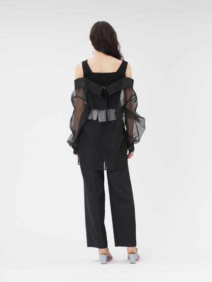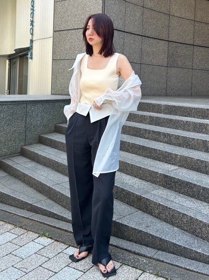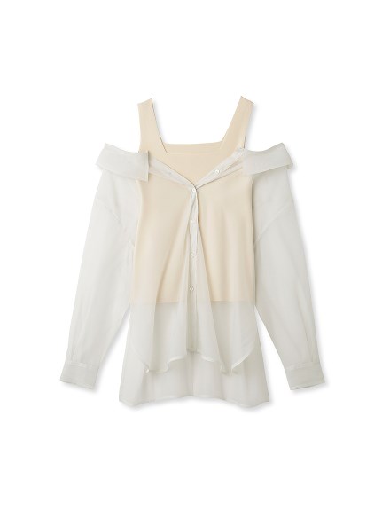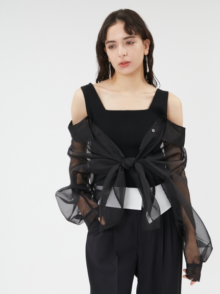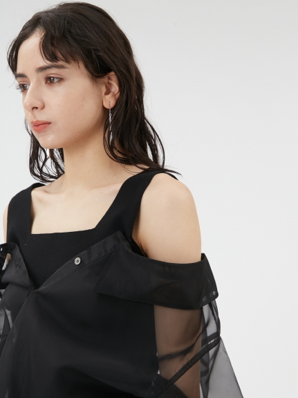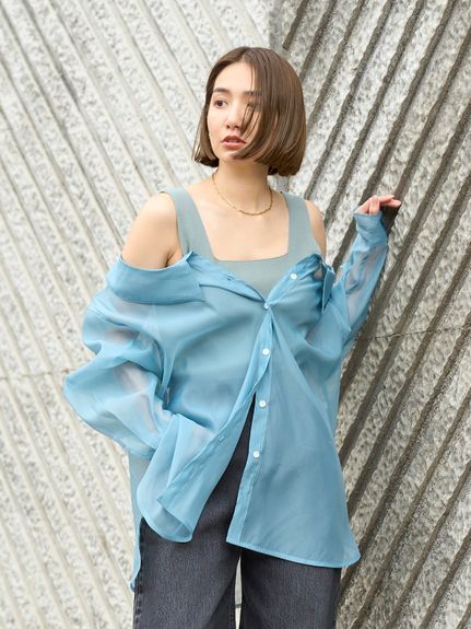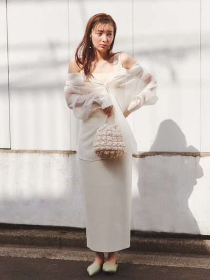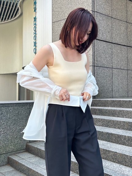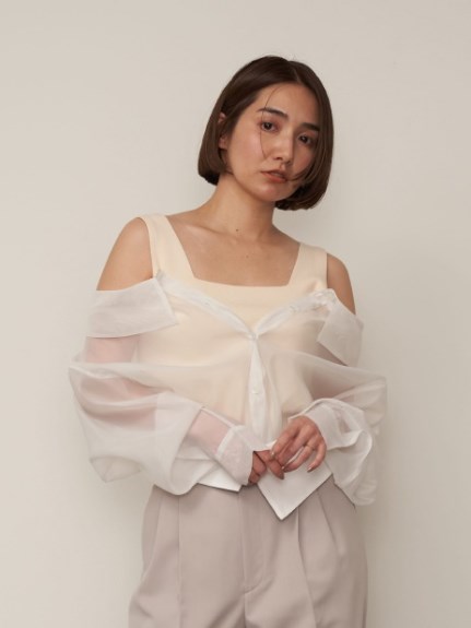 デコルテがキレイに見えるスクエアニットと透け感のあるオーガンジーシャツをワントーンで揃えた異素材のレイヤード仕様で、肩まわりの抜け感をほどよくキープしたデザインはそのままに、