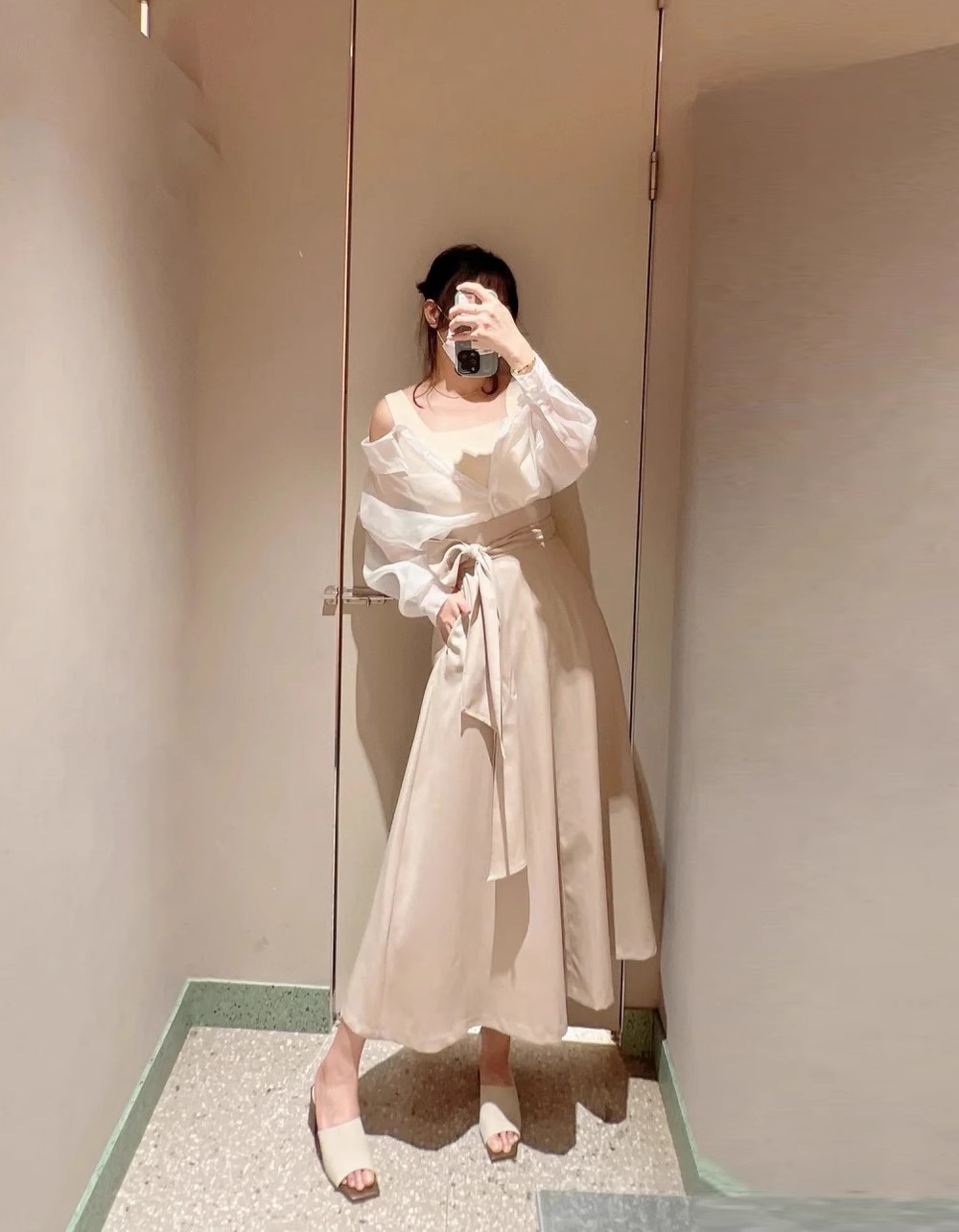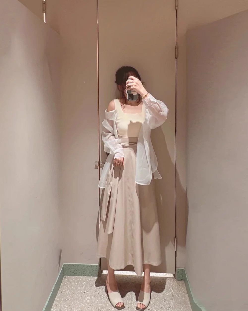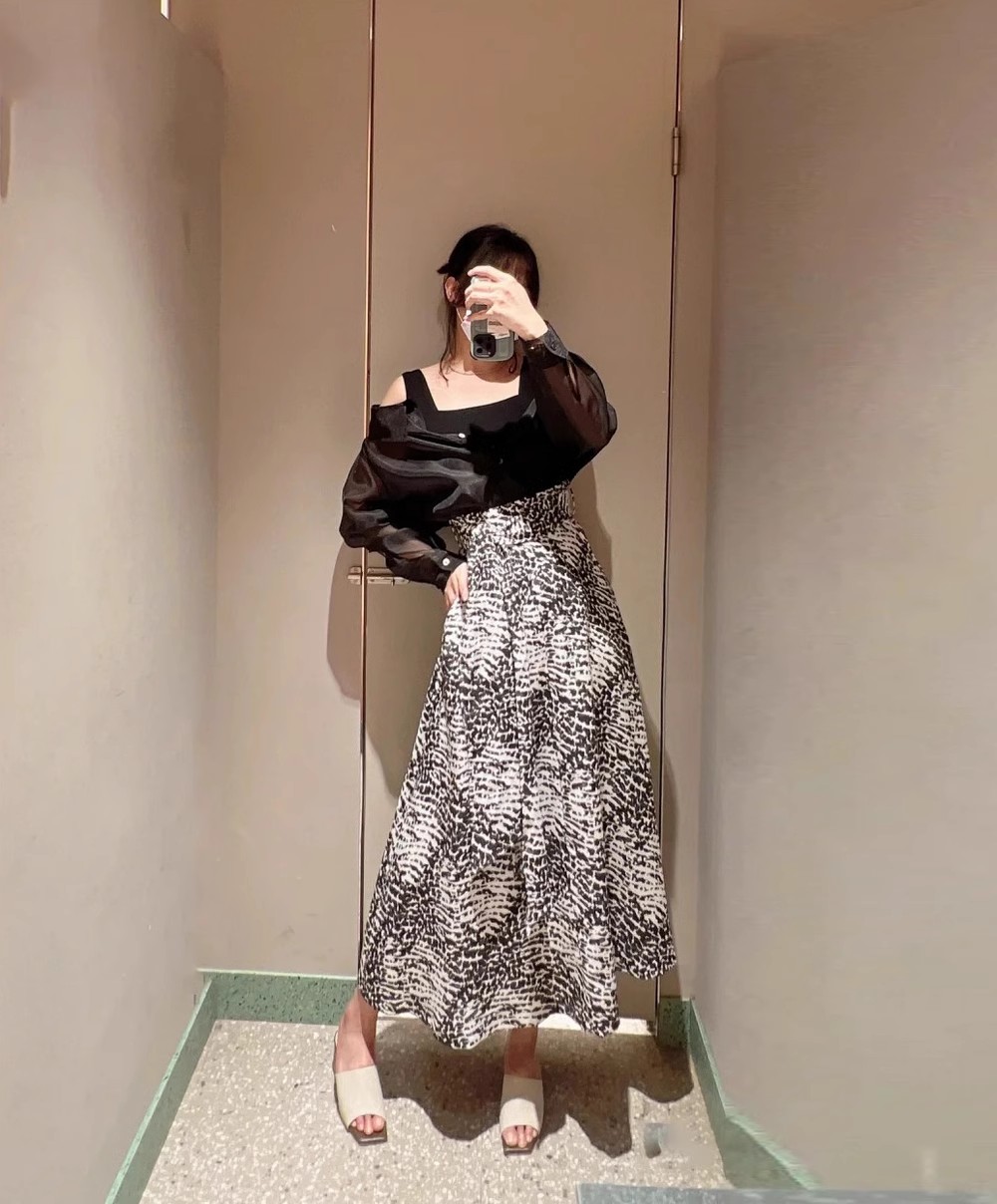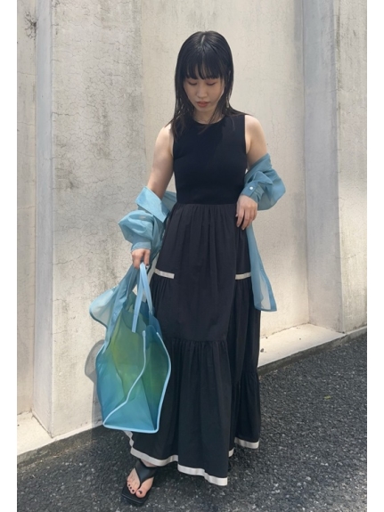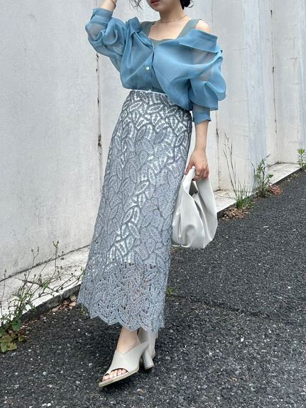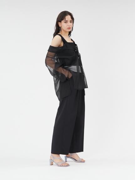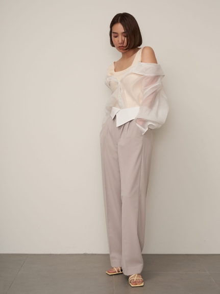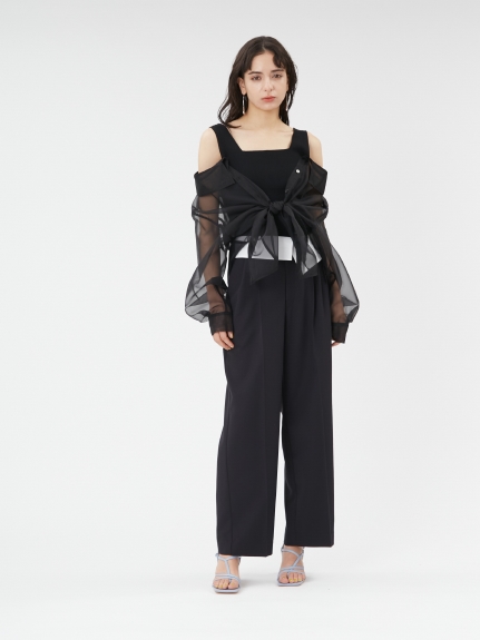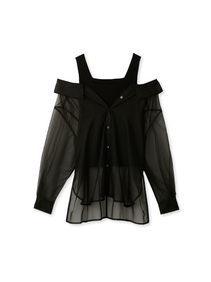 デコルテがキレイに見えるスクエアニットと透け感のあるオーガンジーシャツをワントーンで揃えた異素材のレイヤード仕様で、肩まわりの抜け感をほどよくキープしたデザインはそのままに、