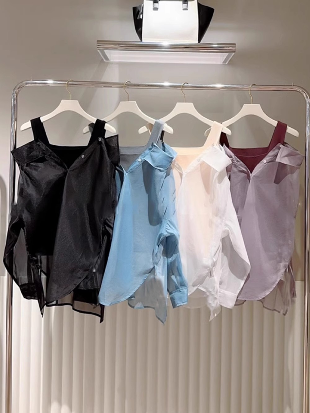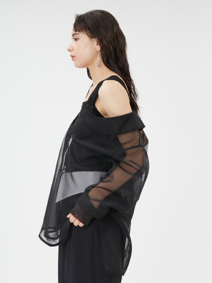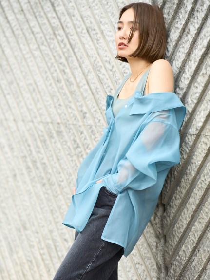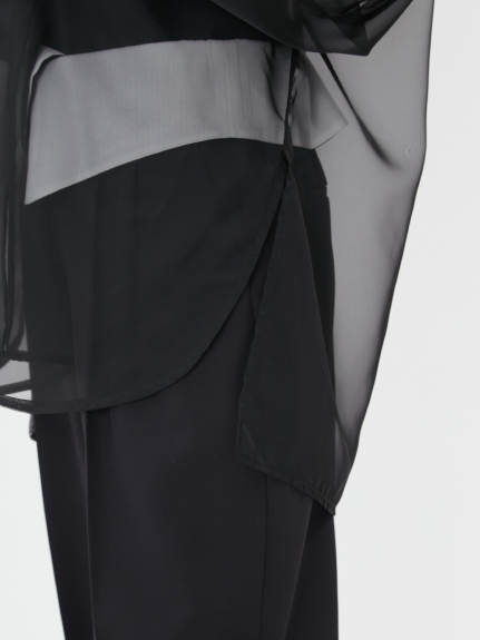 オーガンジーシャツは、後ろのDカンで開き具合を調節でき、裾のサイドスリットを前はラウンド、後ろはスクエアで切り替えたシャツテールも特徴です。