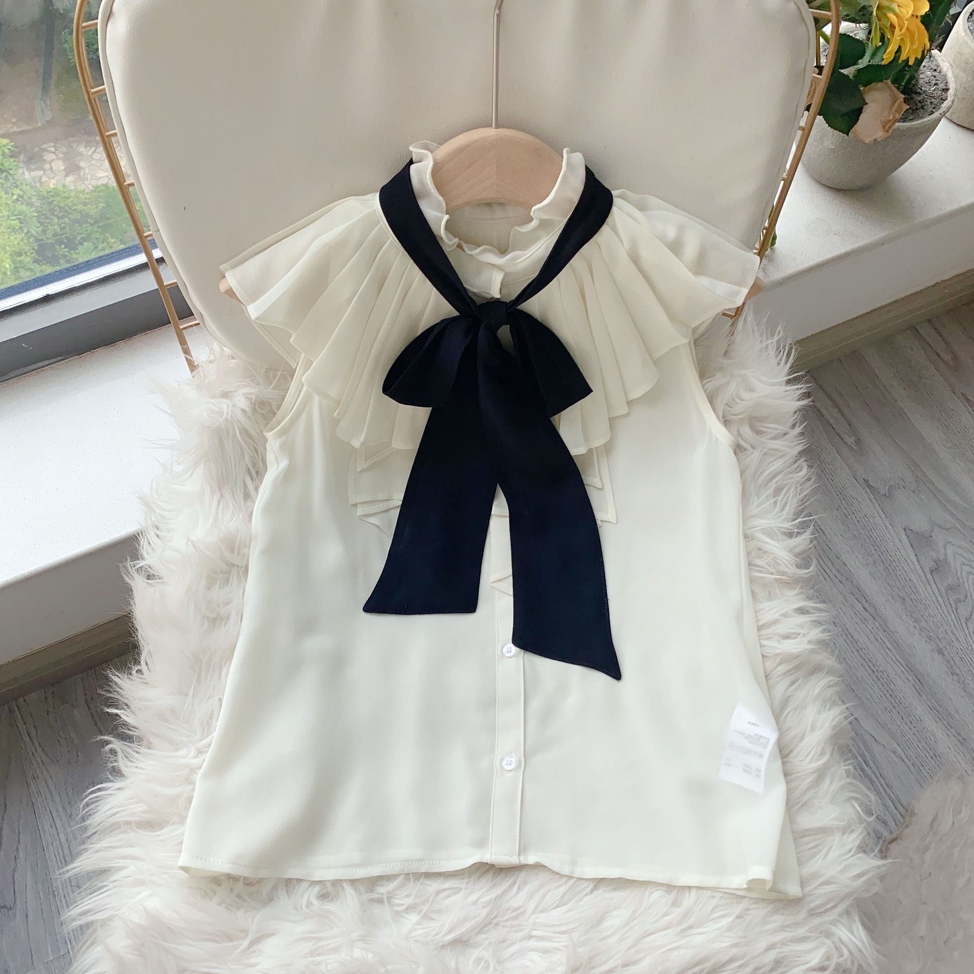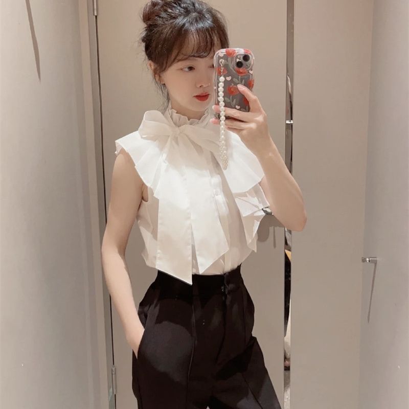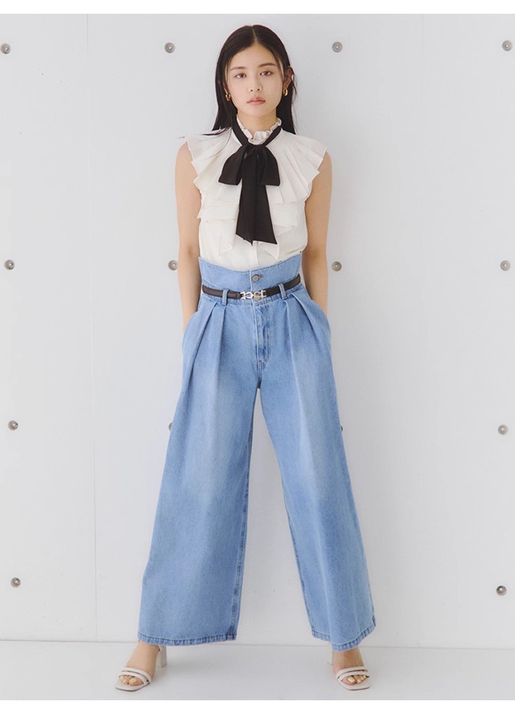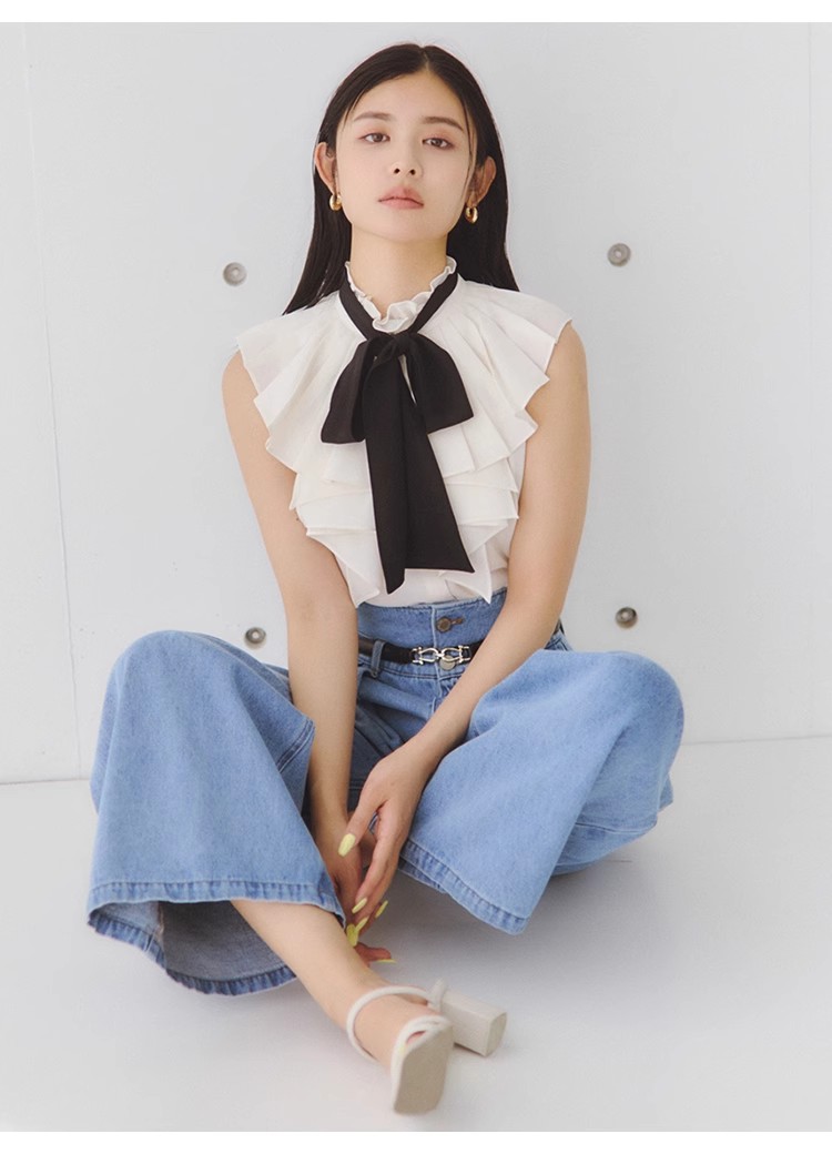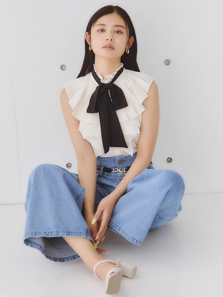【ボウタイ×フリルの王道フェミニンディテールが光るノースリブラウス】