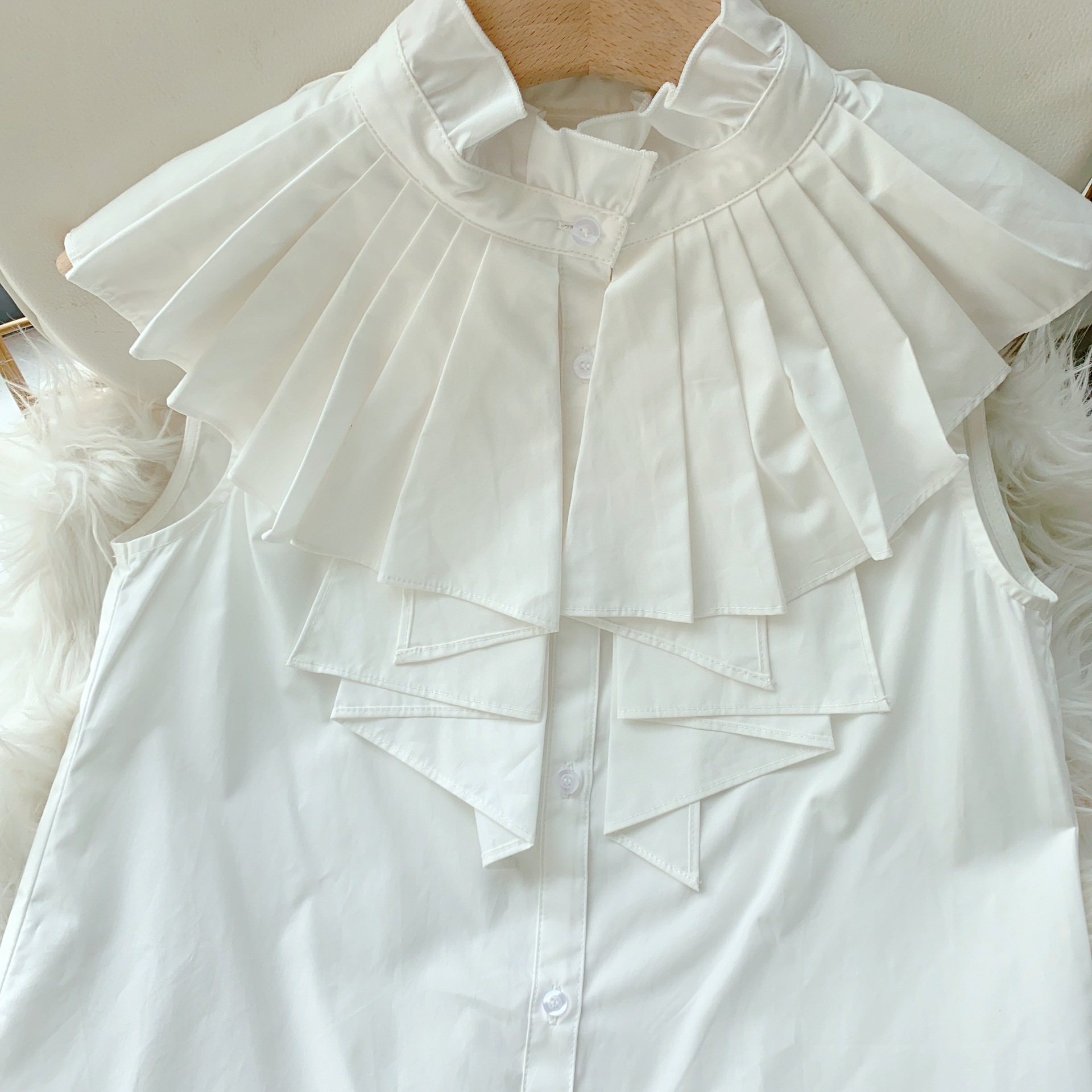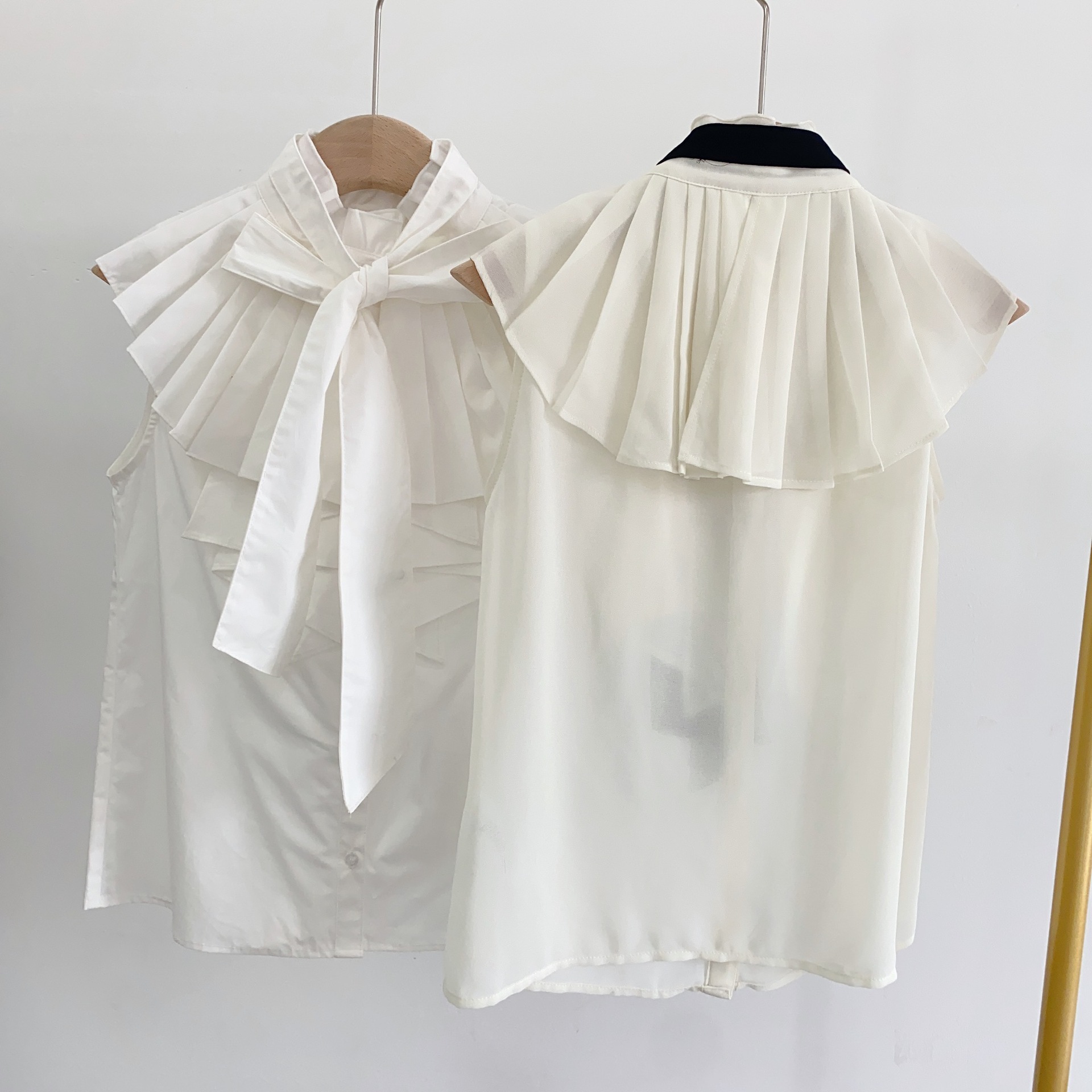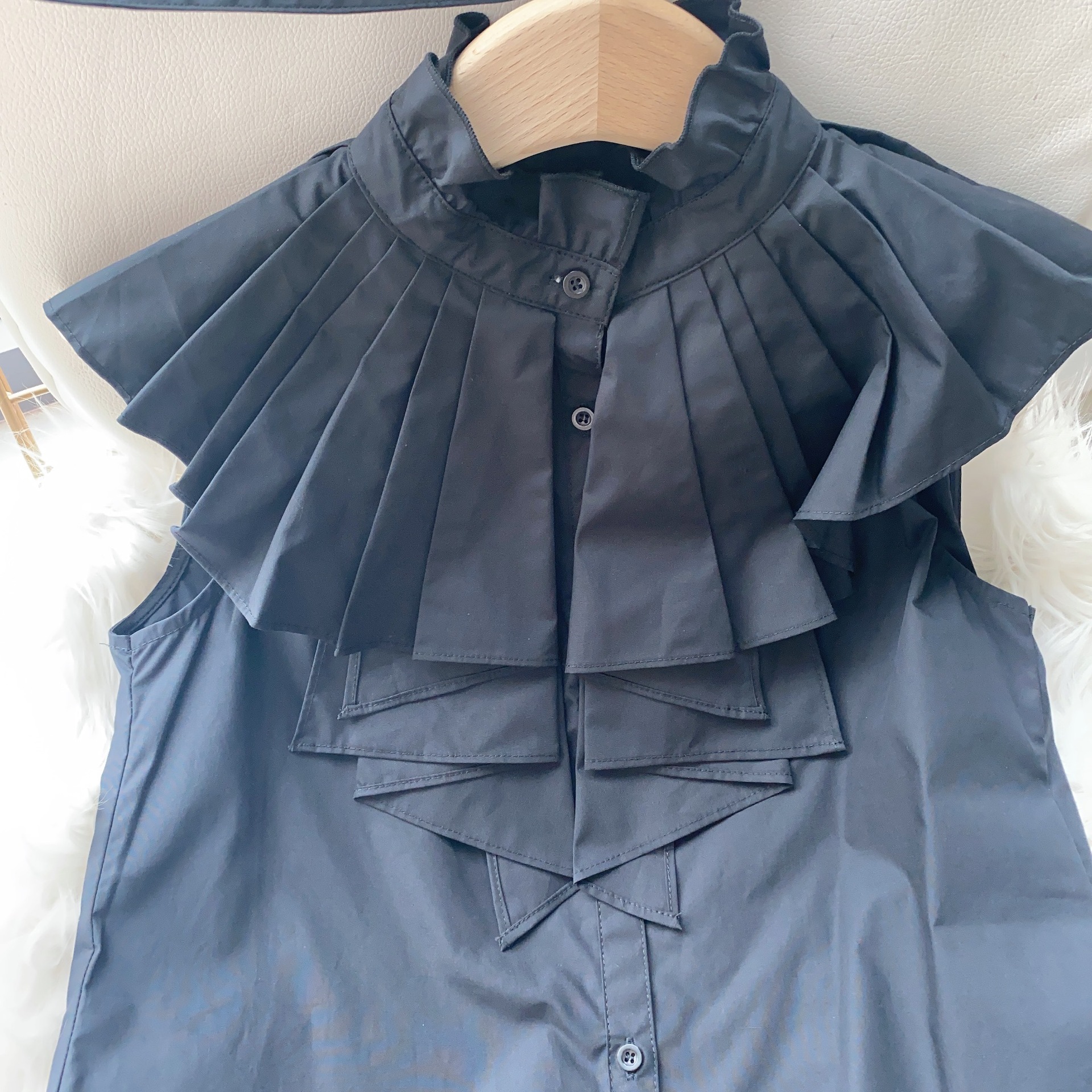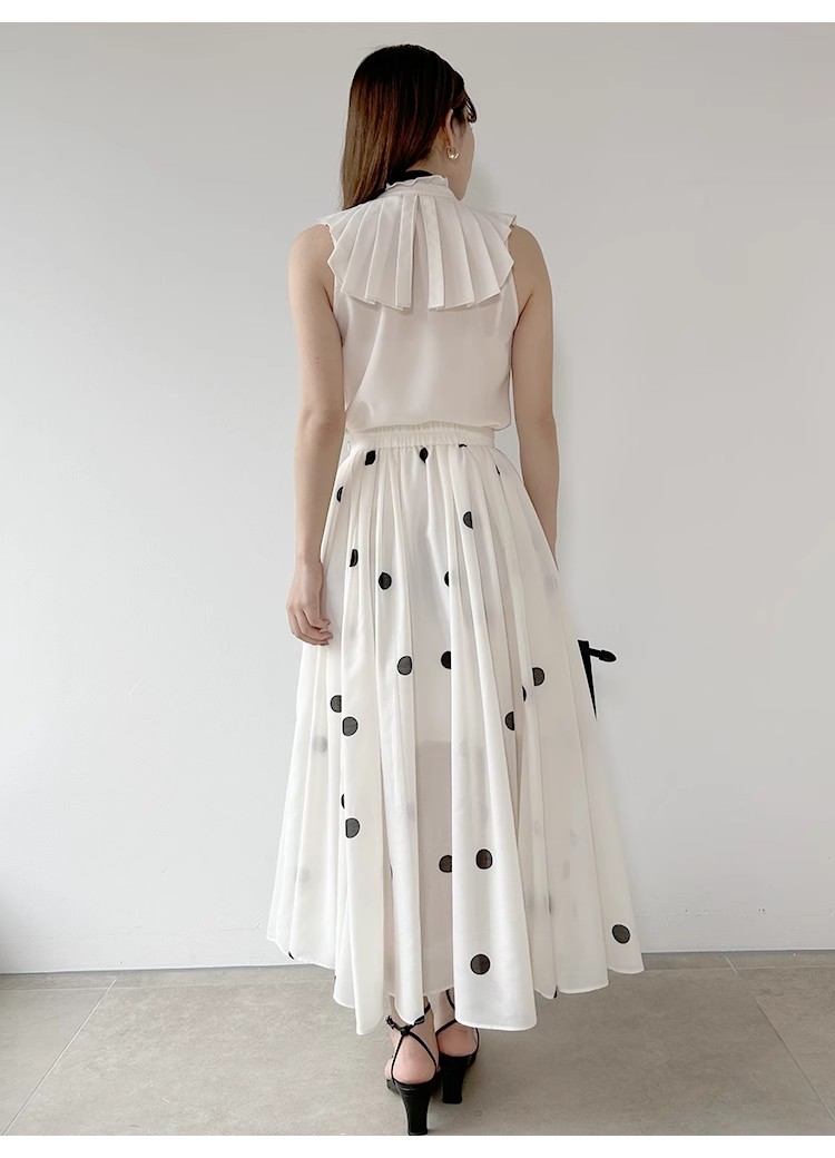 たっぷりのプリーツフリルがあしらわれた、華やかかつモードなノースリブラウス。フェミニンなアクセントを添えるボウタイリボンは取り外しできるので、その日の気分やシーンに合わせてアレンジを楽しめます。たっぷりのフリル対して身頃部分はすっきりとシンプルに仕上げることでメリハリの取れたバランスの良いルックスに。パンツともスカートとも合わせやすく、幅広いスタイリングに取り入れられます。