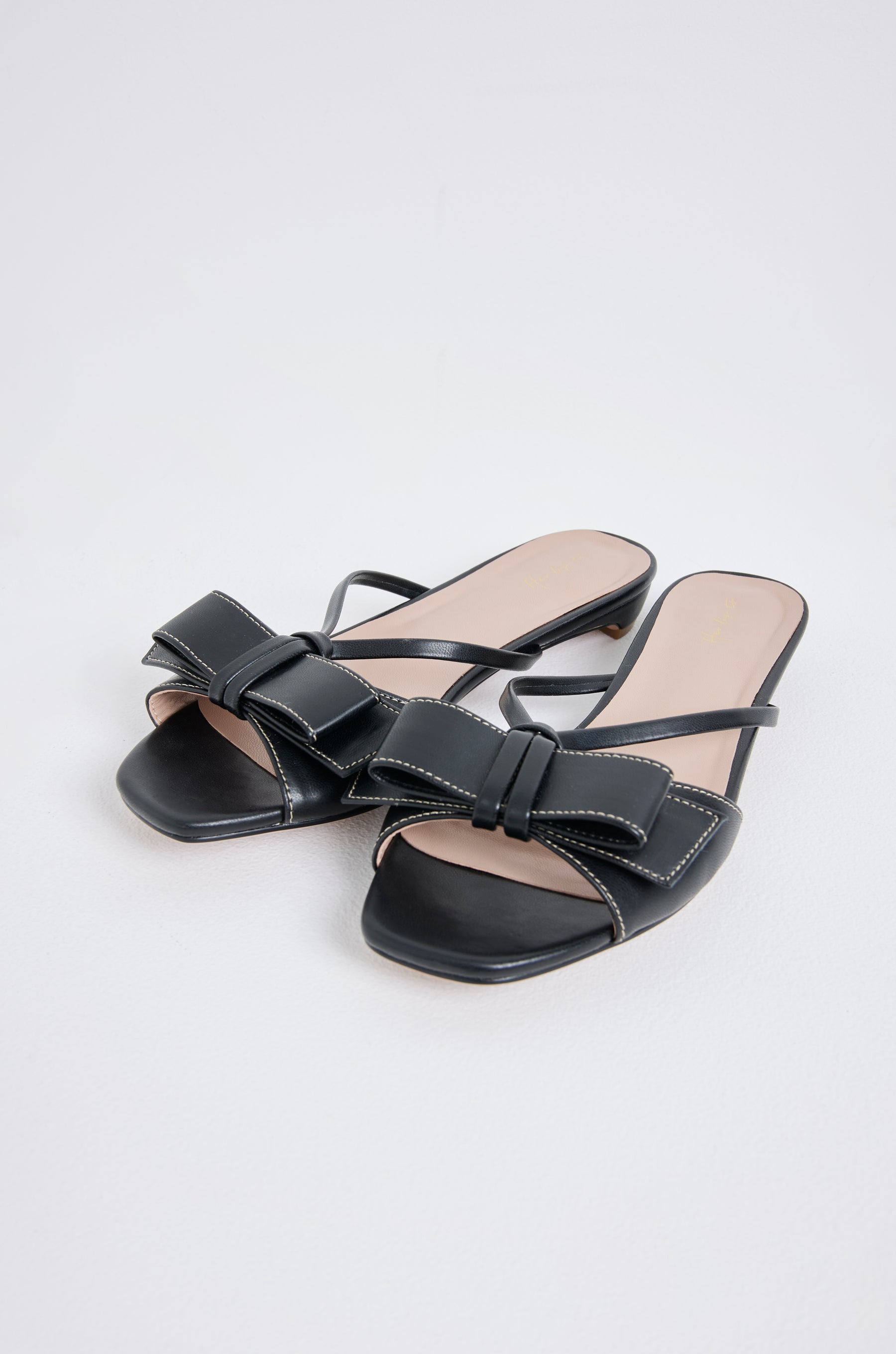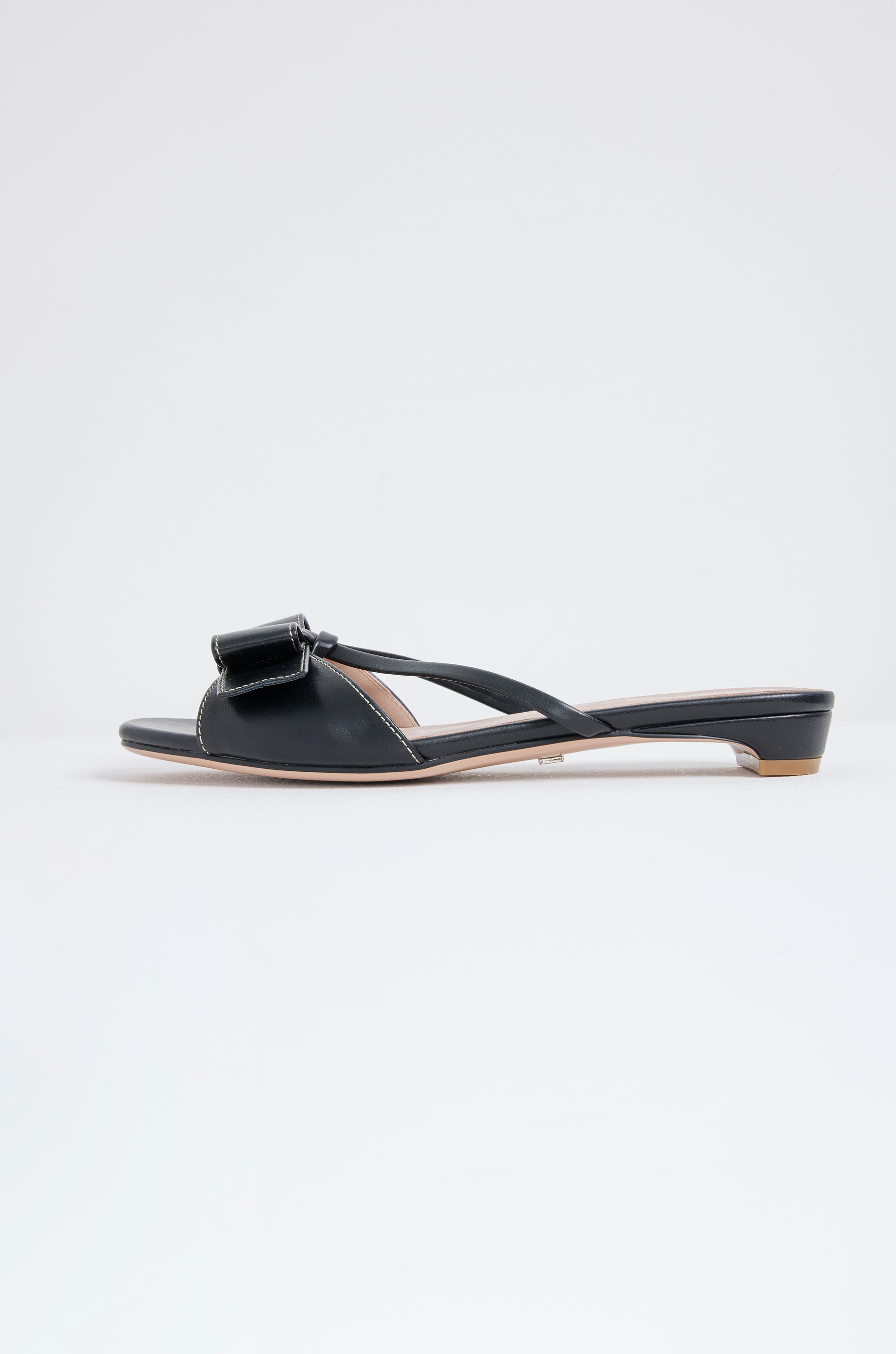 リボンボウから細いストラップを配しているため歩いた時に脱げにくく、視覚的に足を華奢に魅せてくれる効果があります。