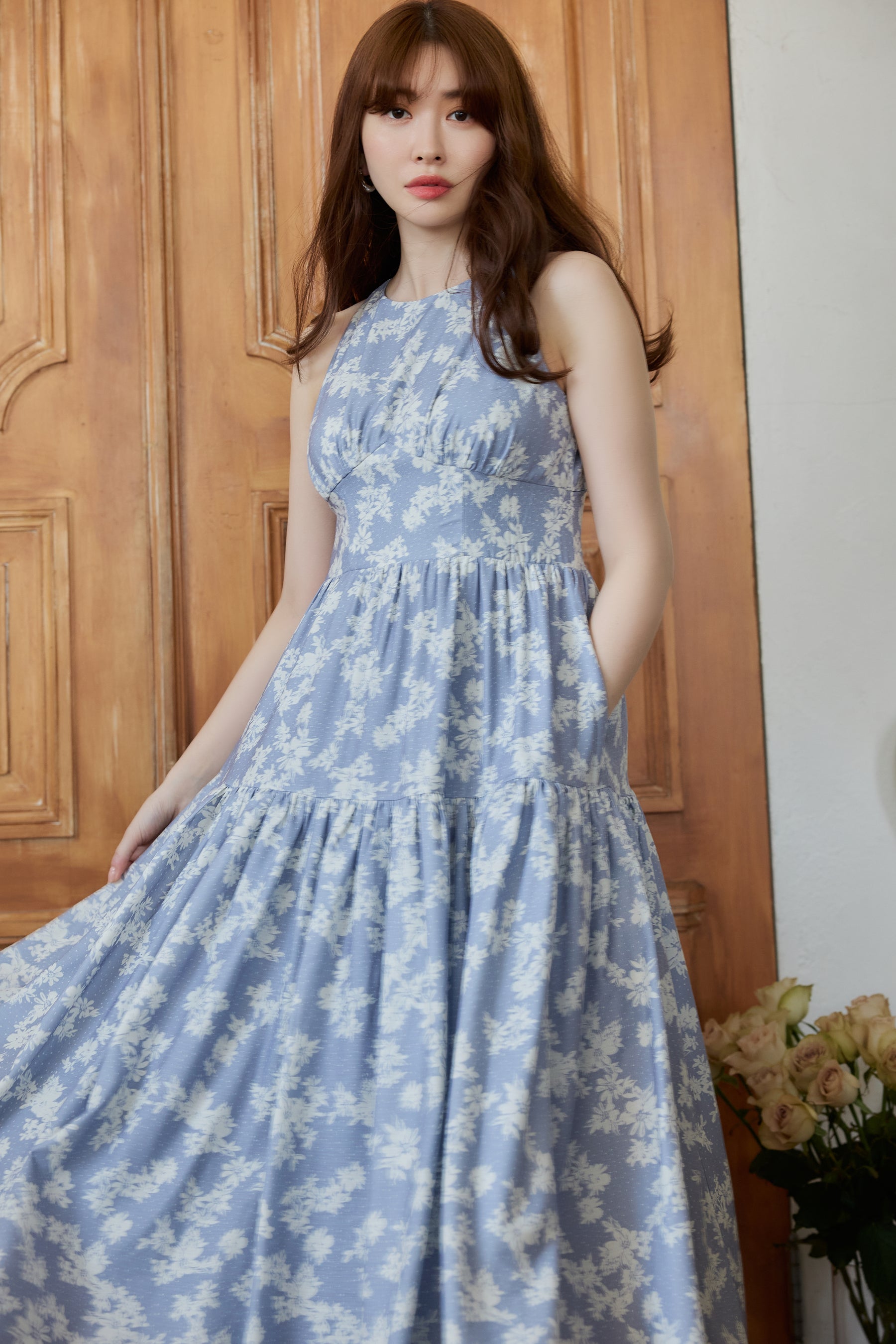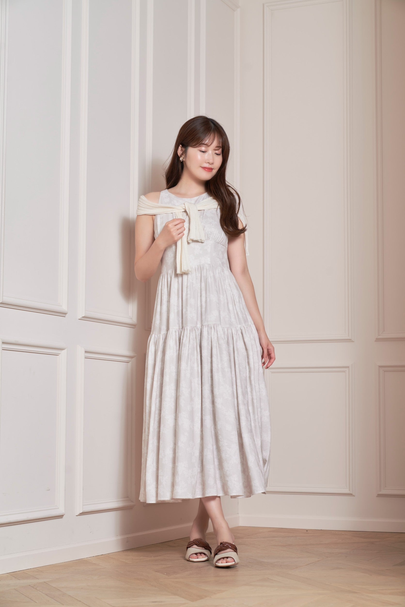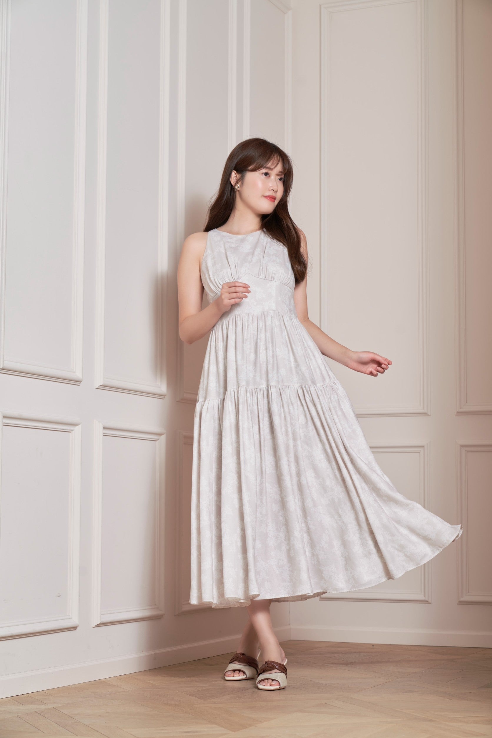 胸元のギャザーやウエストの切り替え、スカートのフレア具合など、ディティールの美しさに細部までこだわったドレスは、女性らしいメリハリがありながらも、すっきりした印象にも魅せてくれる逸品。