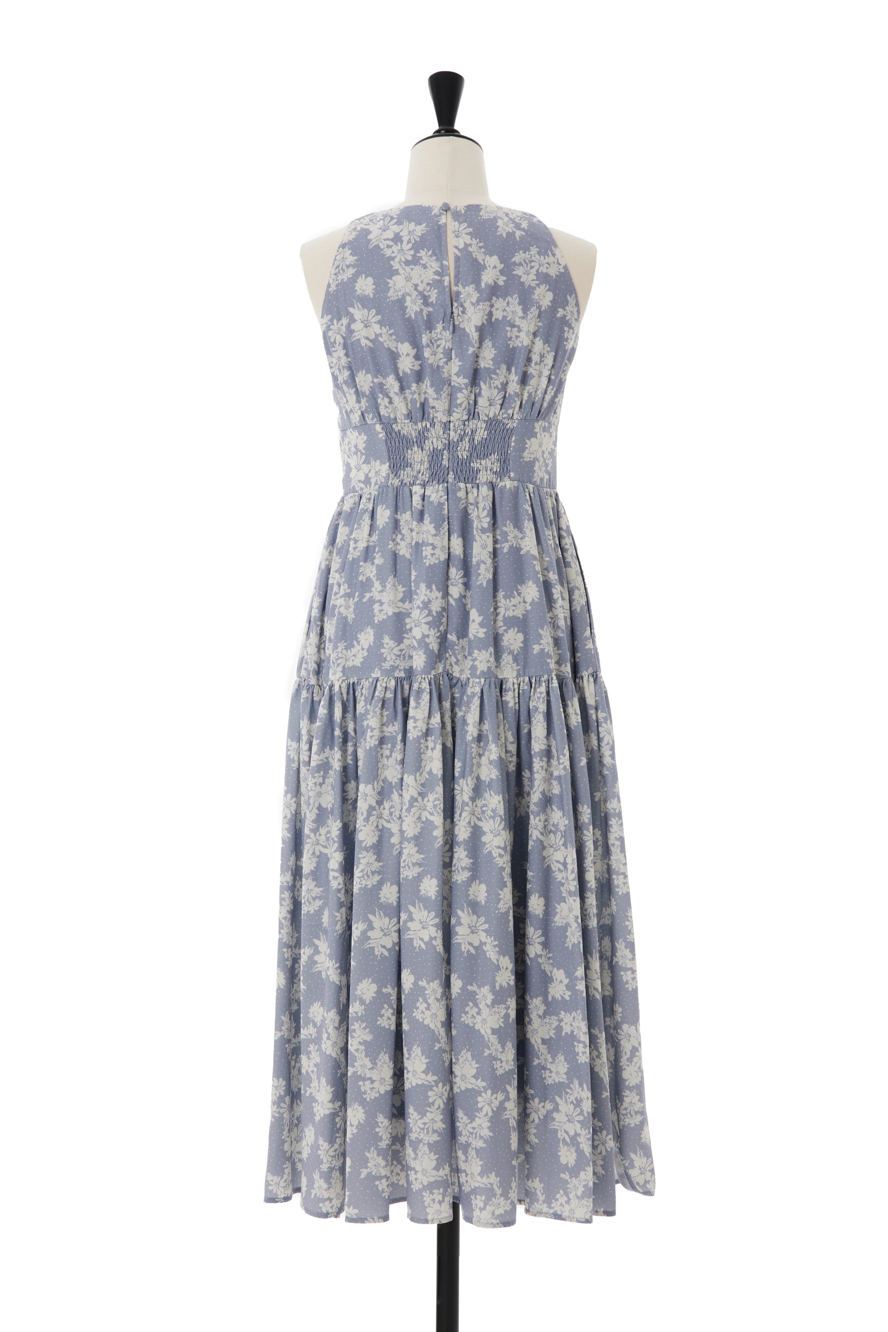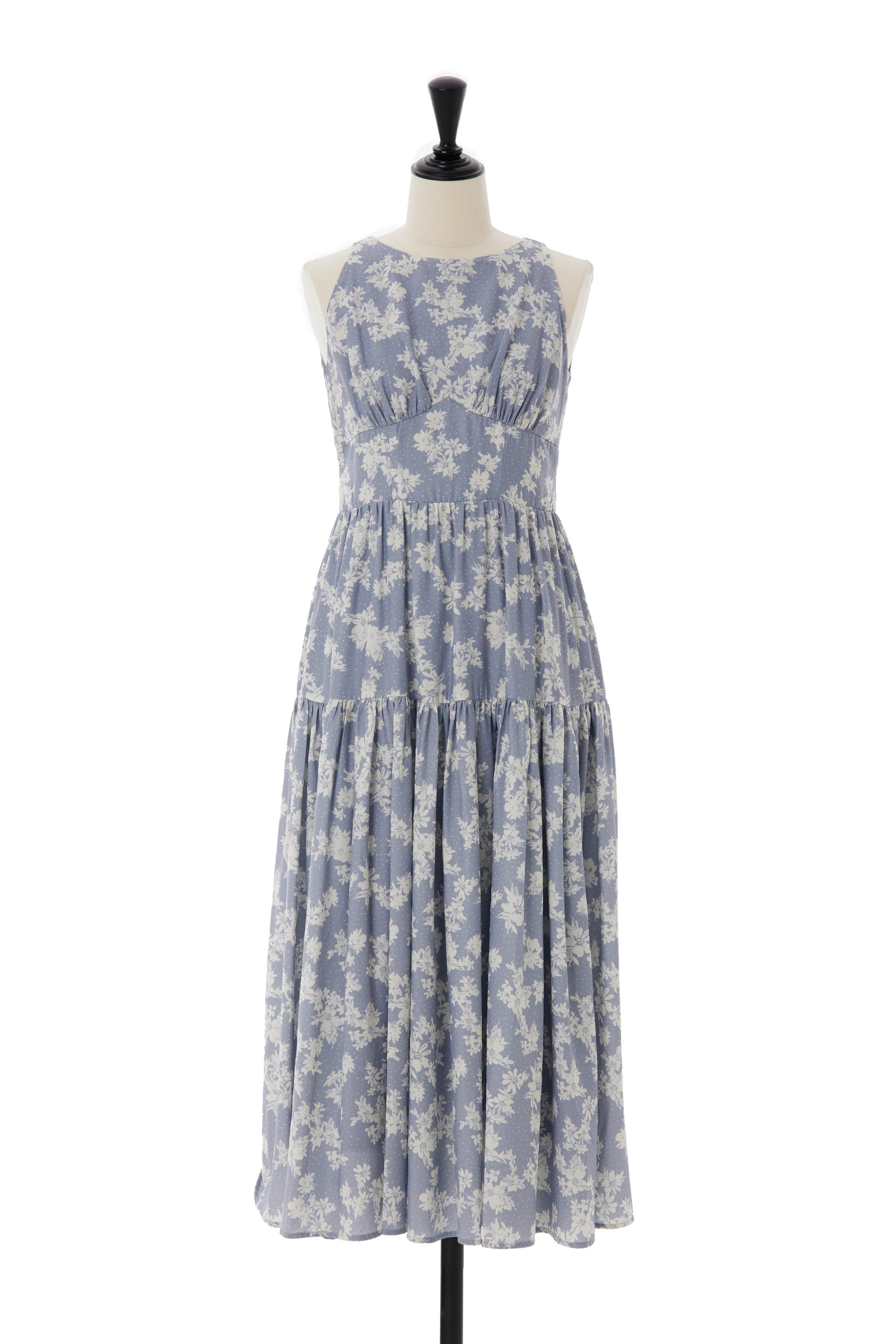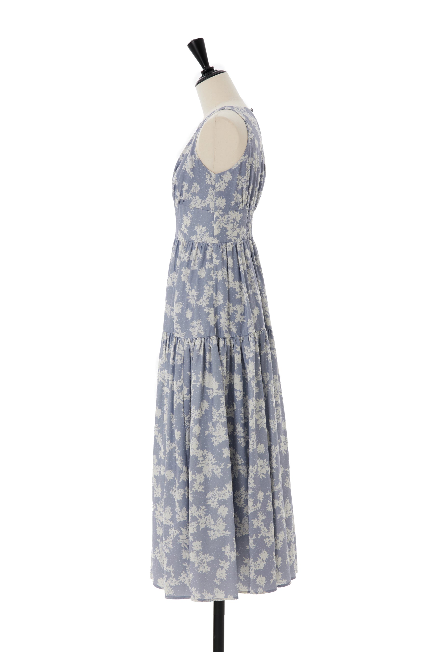 すっきりとしたデザインが魅力的なノースリーブタイプの中花柄が目を惹くドレス。