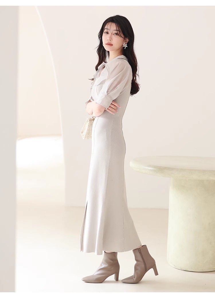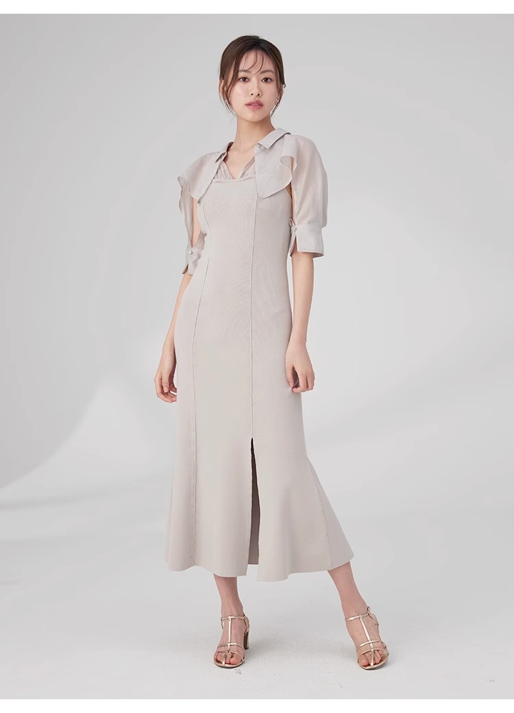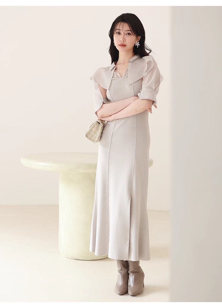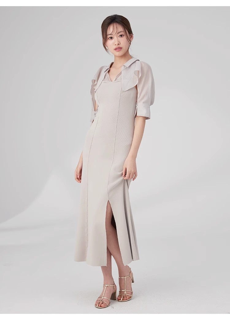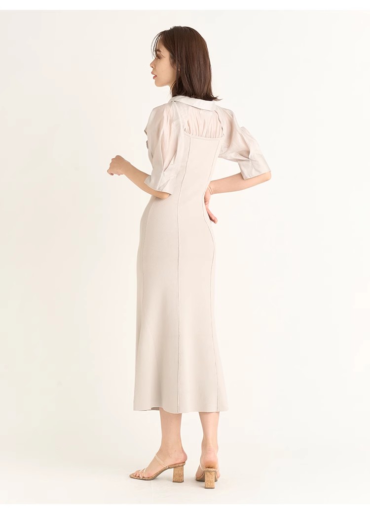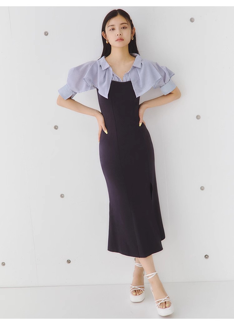 インにシャツをレイヤードしているかのような、ドッキングデザインのワンピース。ひらりと広がるフリルや袖のスリットで、女性らしいエッセンスをプラスしました。ボディにはストレッチ入りのニットを使用し、程よいフィット感のある美シルエットを演出。裾には深めにスリットを入れ、今年らしい抜け感を添えています。