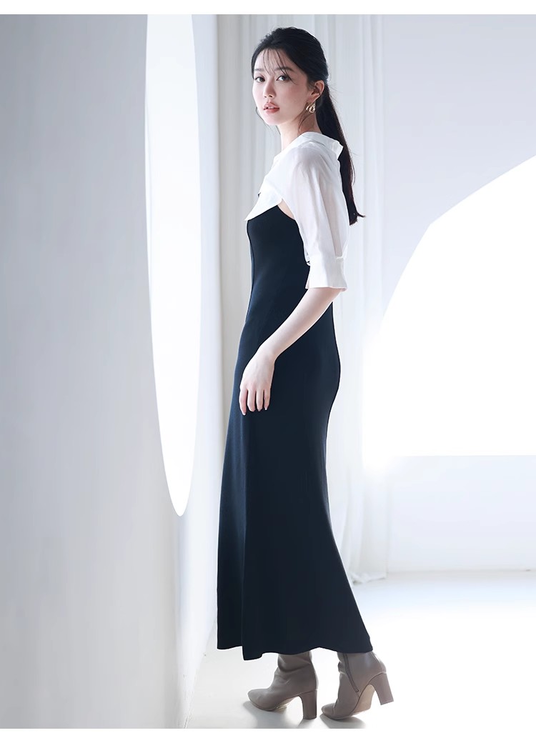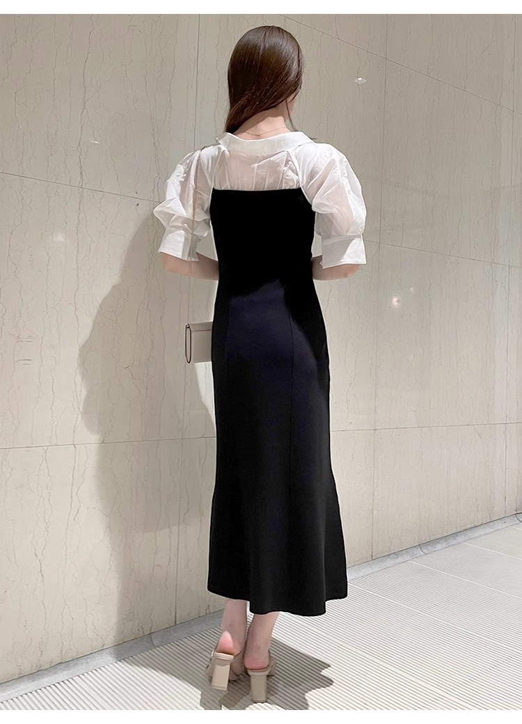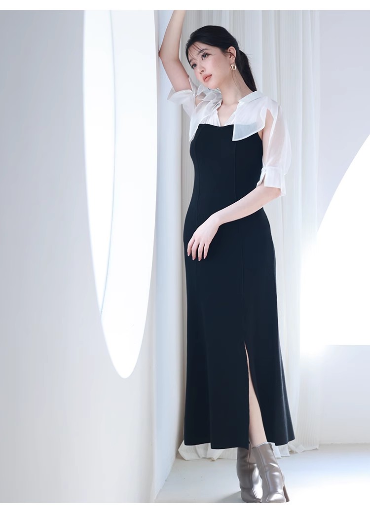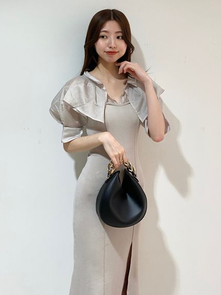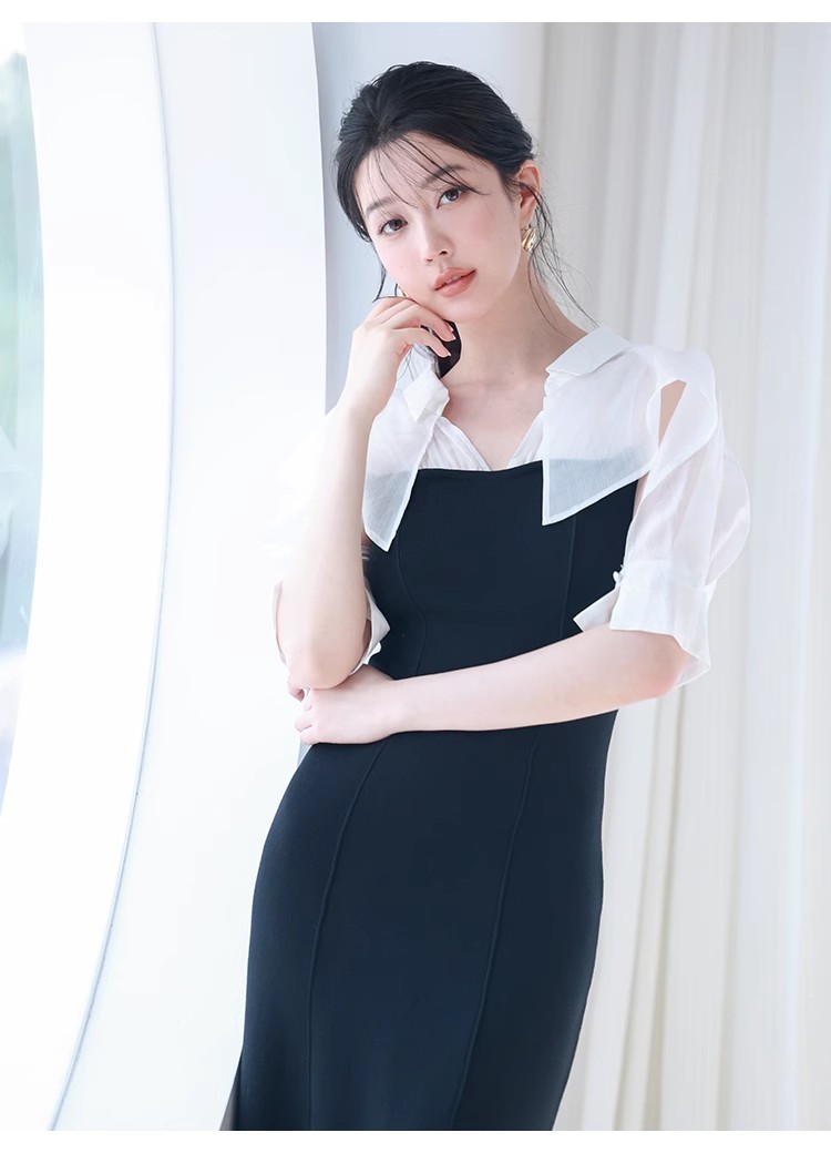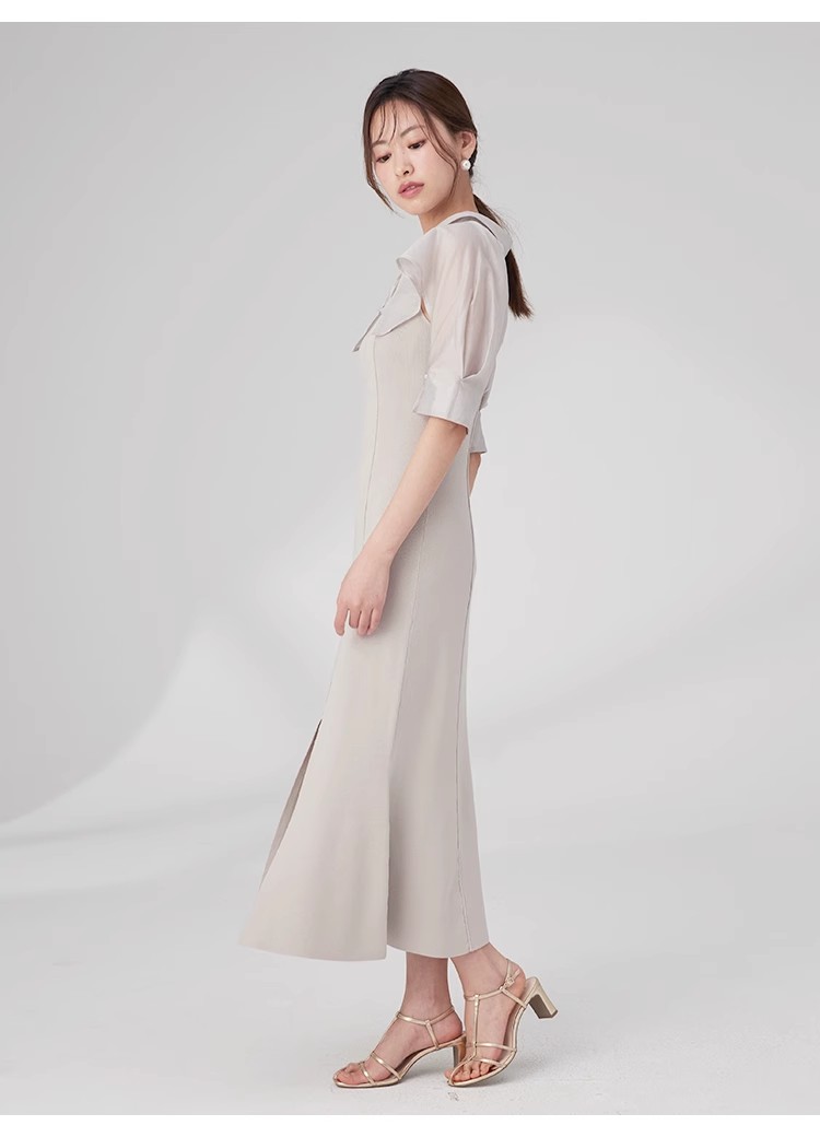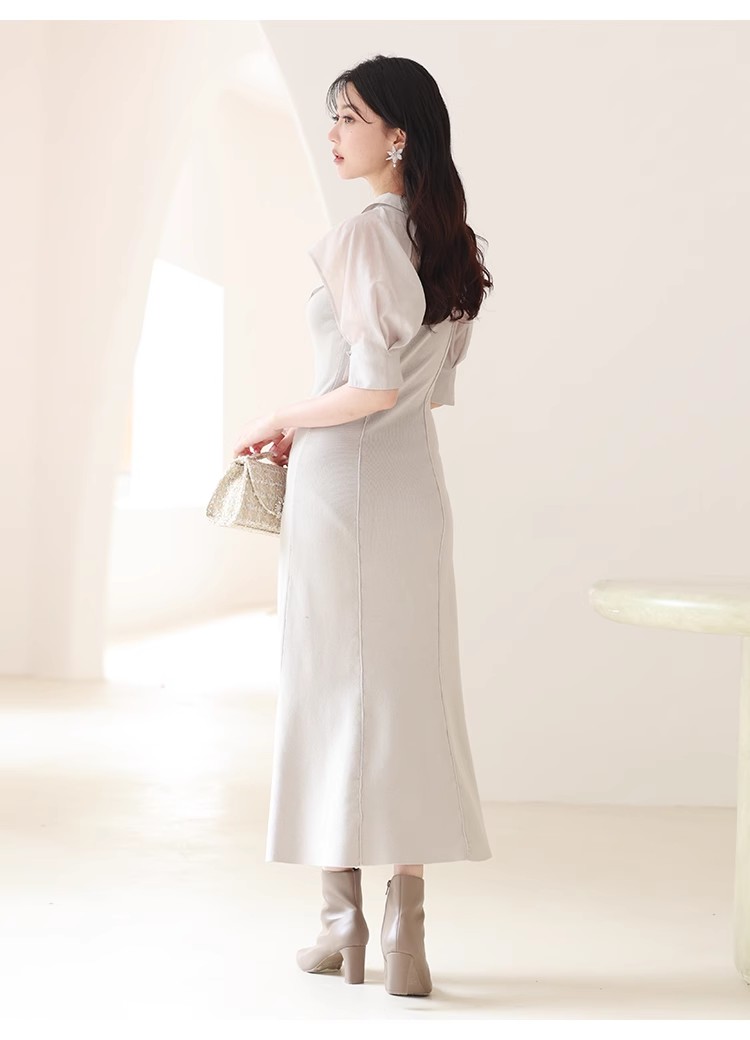 インにシャツをレイヤードしているかのような、ドッキングデザインのワンピース。ひらりと広がるフリルや袖のスリットで、女性らしいエッセンスをプラスしました。ボディにはストレッチ入りのニットを使用し、程よいフィット感のある美シルエットを演出。裾には深めにスリットを入れ、今年らしい抜け感を添えています。